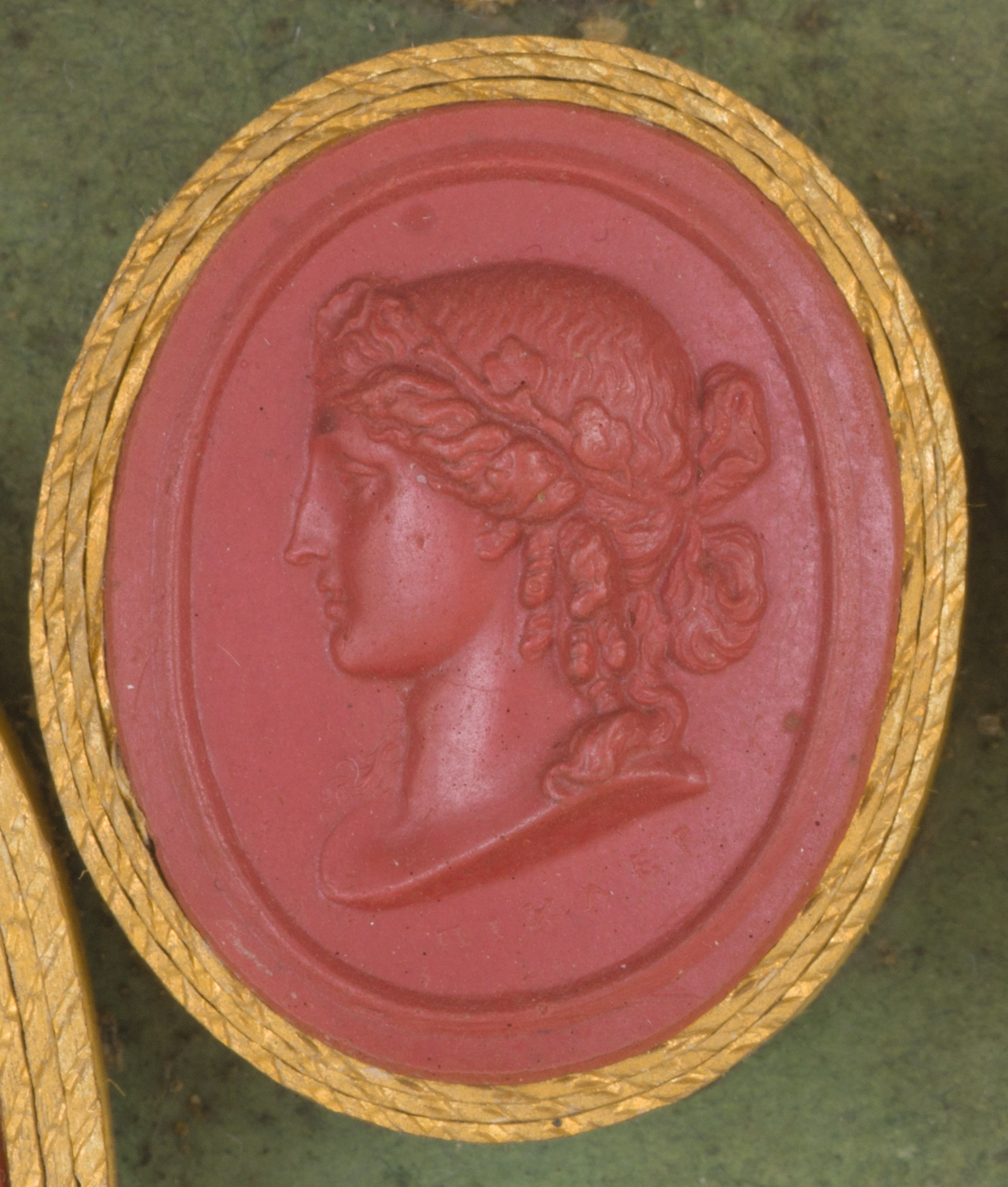 Prezentowany obiekt to wycisk owalny, wypukły na płaskim tle obwiedziony uskokiem i marginesem wykonany został na podstawie antycznej głowy z Muzeum Kapitolińskiego.