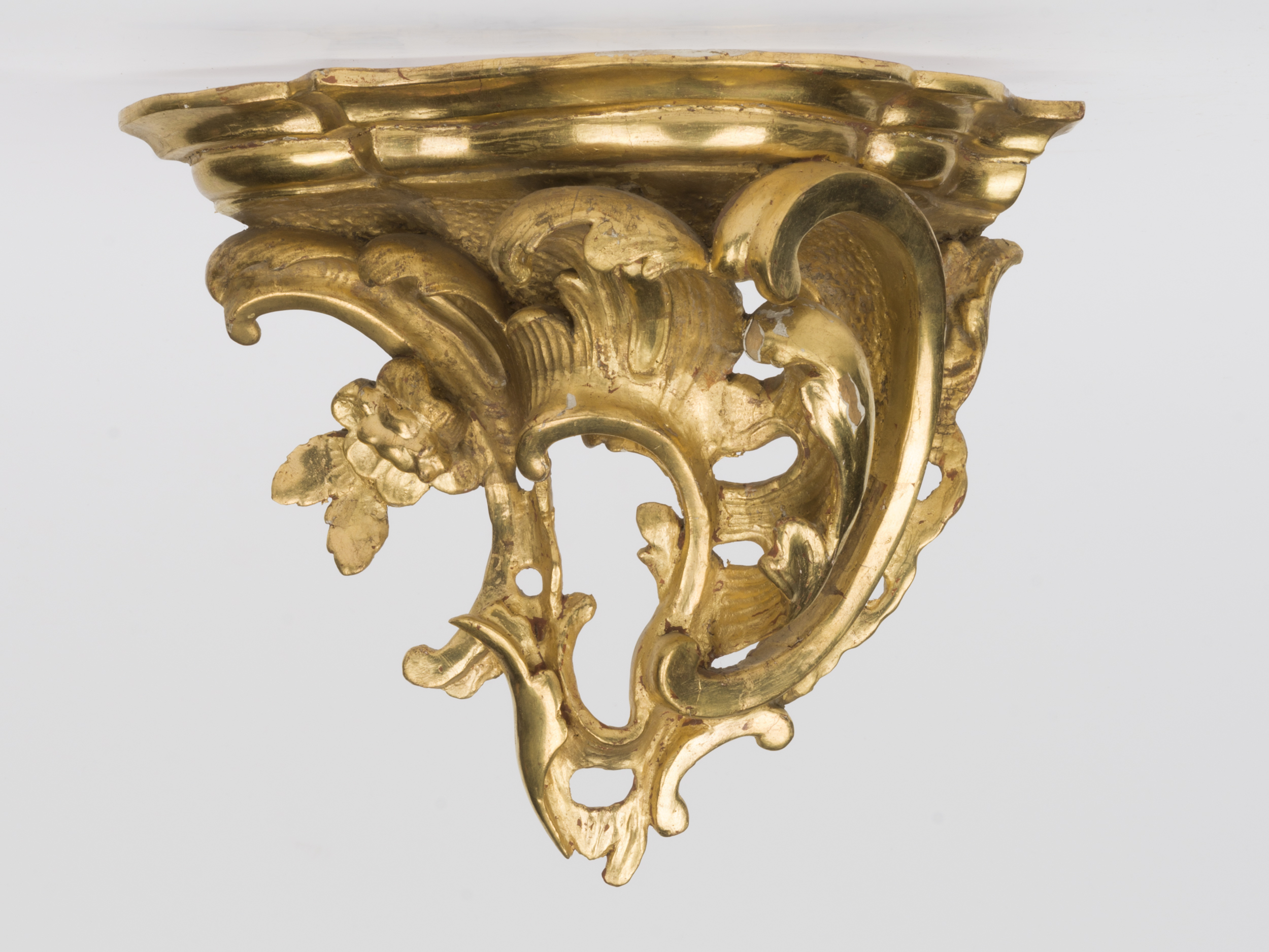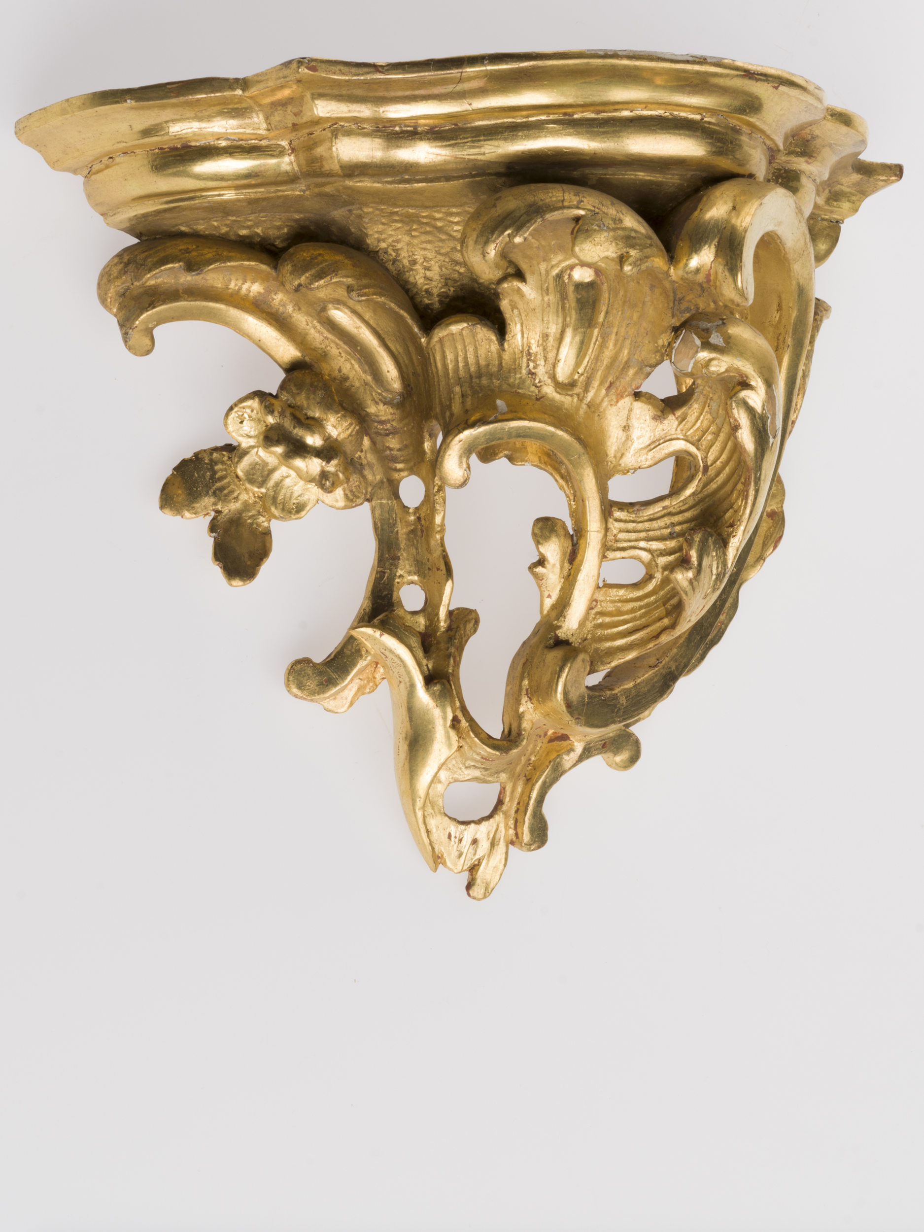 Niewielka konsolka ścienna, w formie rozbudowanej kompozycji z motywem rocaille. Część wspornikowa u góry szersza, zwęża się ku dołowi dając zarys odwróconej piramidy. Składa się z giętkich, mocno ażurowych form, w większości o kształcie ceownicy, tworzących pojedynczy tzw. koguci grzebień. Przy lewej krawędzi umieszczony został pojedynczy wielopłatkowy kwiatek. Całość podtrzymuje blacik o nieregularnym zarysie i podwójnie wklęsło fazowanej krawędzi.