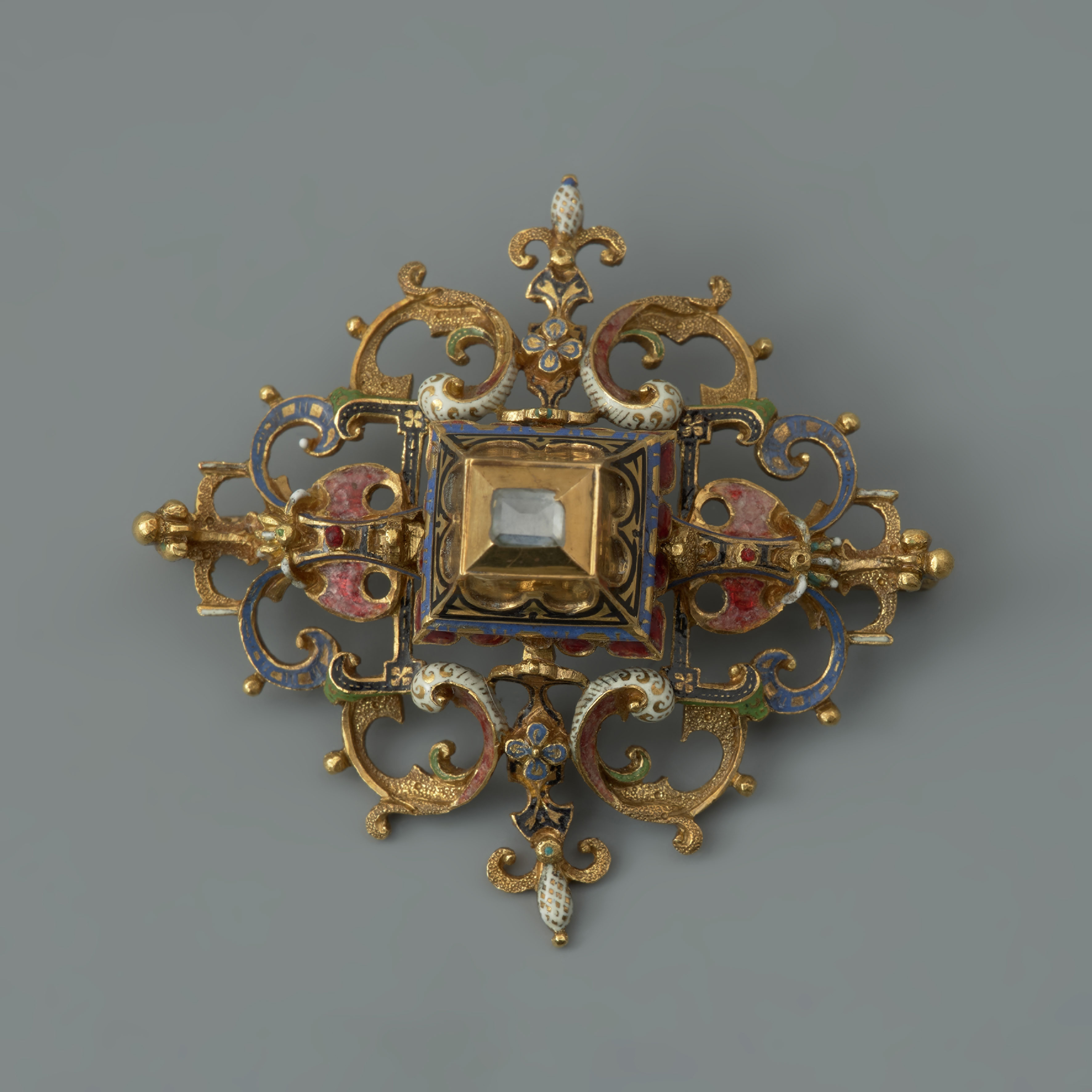 Prezentowana rozeta, jedna z pary niemal identycznych manierystycznych klejnotów znalezionych w krypcie kościoła zamkowego w Szczecinie, należała, jak ustalono na podstawie portretu pośmiertnego, do księcia pomorskiego Filipa II. Książę, który w 1606 roku objął władzę w księstwie szczecińskim po ojcu Bogusławie XIII, był jedną z najciekawszych postaci wśród władców z dynastii Gryfitów. Słynący z pobożności i skromności, wszechstronnie wykształcony, był miłośnikiem i kolekcjonerem sztuki. Jego ideą było stworzenie na zamku w Szczecinie kunstkamery, czyli gabinetu sztuki. Współpraca księcia z Filipem Hainhoferem (1578–1647), augsburskim kolekcjonerem i pośrednikiem w handlu sztuką, zaowocowała powstaniem Kabinetu Pomorskiego – jednego z najwspanialszych dzieł renesansu europejskiego. Wykonany w Augsburgu kunsztowny mebel z drewna hebanowego, zdobiony srebrem i szlachetnymi kamieniami mieścił wewnątrz ogromną liczbę skrytek i szuflad. Razem ze zdobiącymi go obrazami i figurami, a także stanowiącymi jego wyposażenie przedmiotami, tworzył symboliczny obraz świata, a także ludzkiej wiedzy i działalności.