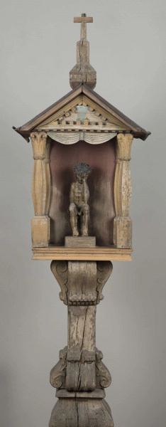 Jedyna zachowana w muzealnych zbiorach jest kapliczką słupową. Na rzeźbionym kolumnowym słupie umieszczono latarnię nakrytą namiotowym daszkiem; jej tylna ściana jest zapleckiem dla rzeźby. Bywają też kapliczki o trzech ścianach zamkniętych i jednej otwartej. Uwagę zwracają detale architektoniczne: profilowane kolumienki z roślinnymi głowicami podtrzymujące daszek, rodzaj fałdowanej kotary pod szczytem, na którym pośród ząbkowanych brzegów mógł się znajdować motyw Słońca lub Oko Opatrzności. Sam szczyt wieńczy mały krzyż. Często w jego miejscu mogła być kopuła, wieżyczka bądź sterczyna z ażurowym wycięciem. W środku zaś umieszczano rzeźbę Matki Boskiej, Chrystusa Umęczonego lub czy świętych patronów, między innymi św. Mikołaja lub św. Onufrego.