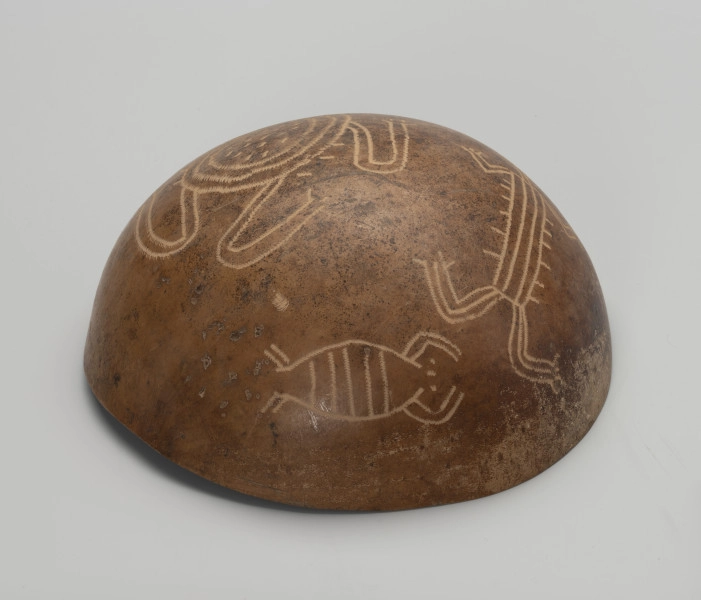 Na zaprezentowanej misce wyryto oprócz postaci ludzkiej najprawdopodobniej także, często występujący w sztuce Noanamá, wzór żółwia lądowego w towarzystwie mniejszego żółwia oraz raka. Wewnątrz obiektu znajduje się napis „Noanama” – oznaczenie wtórnie wykonane przez Borysa Malkina, antropologa prowadzącego w latach 1968–1972 badania terenowe wśród Noanamá, od których pozyskał omawianą tykwę.