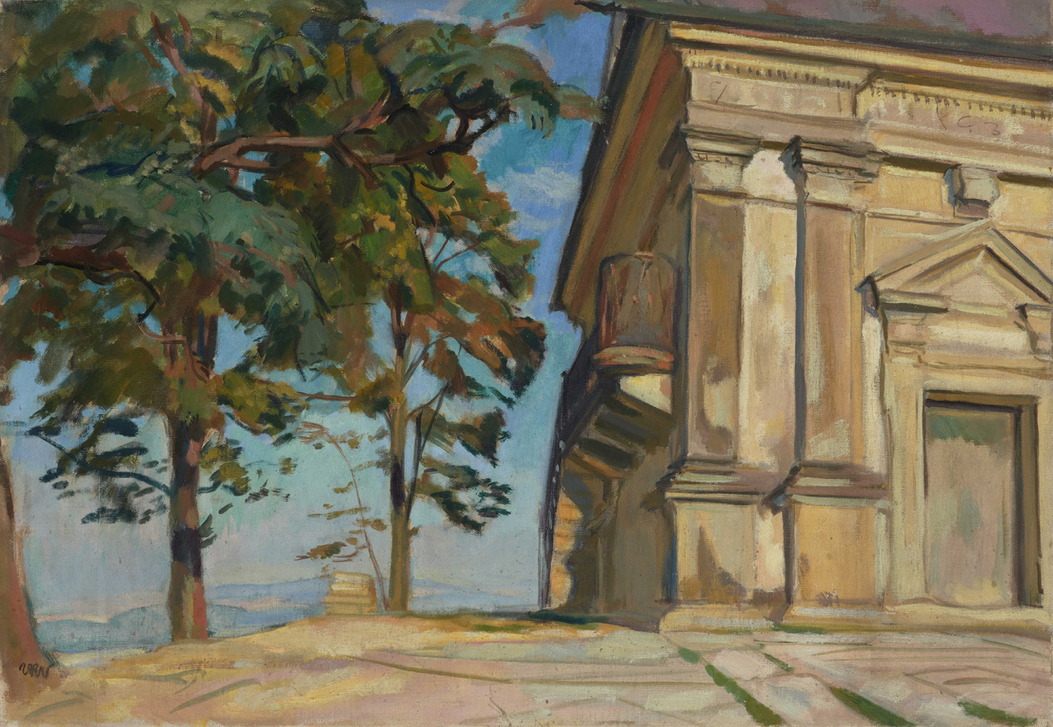 Wojciech Weiss, urodzony w rumuńskiej Leordzie, naukę rozpoczął w Gimnazjum św. Józefa we Lwowie, by po przeniesieniu się rodziny pod Kraków zdać maturę w tamtejszym Gimnazjum św. Anny. Równolegle, od 1890 roku, jako wolny słuchacz brał udział w kursach rysunku odbywających się przy Akademii Sztuk Pięknych. Tam też zdecydował się studiować w latach 1892–1896. Po krótkiej fascynacji historyzmem Jana Matejki został przyjęty do klasy mistrzowskiej modernisty Leona Wyczółkowskiego. W 1898 roku poznał Stanisława Przybyszewskiego, który właśnie przyjął posadę redaktora naczelnego tygodnika literacko-artystycznego „Życie”. Zaczerpnięta od Przybyszewskiego katastroficzna wizja świata stała się wyróżnikiem dekadenckiego okresu Weissa. W roku opuszczenia pracowni Wyczółkowskiego (1899) powstały obrazy obfitujące w wizualne nawiązania do twórczości Francisca Goi i Edwarda Muncha. W latach 1900–1901 Weiss bywał w Paryżu, gdzie nagrodzono go złotym medalem Wystawy Światowej za Portret rodziców (1899). W 1904 roku po raz pierwszy odwiedził Kalwarię Zebrzydowską, w której znalazł dom dla rodziców i drugie po Krakowie miejsce swojej działalności artystycznej. Przeprowadzka nastąpiła rok później, rozpoczynając sielski, tak zwany biały okres w œuvre Weissa – inspirowany sadami otaczającymi dworek, malowniczo pofałdowanym terenem Pogórza Wielickiego oraz rozsianymi tam zabytkami architektury. Atmosferę idylli dopełniały przyjazdy Ireny Silberbergówny, uczestniczki prywatnych kursów malarza, dawnej studentki Konrada Krzyżanowskiego, Karola Tichego i Xawerego Dunikowskiego w Warszawie oraz Simona Hollósy’a w Monachium, która w 1908 roku została żoną Weissa. Ślub miał miejsce w niedalekich Zebrzydowicach pojawiających się także na obrazach artysty. Dzieło ze zbiorów szczecińskich, powstałe w okresie fascynacji nasyconą paletą barwną Paula Cézanne’a, przedstawia kościół Ukrzyżowania w Kalwarii Zebrzydowskiej – najstarszą budowlę w zespole pątniczym, ufundowaną w 1600 roku i rozbudowaną 23 lata później w stylu wczesnobarokowym.