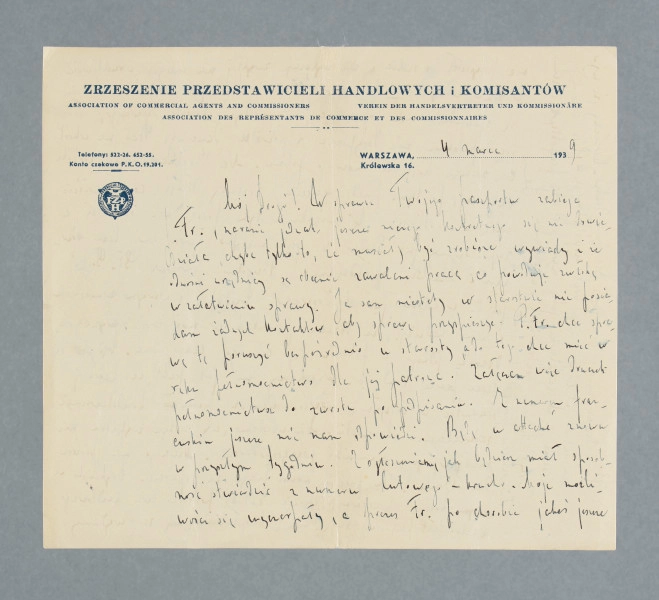 Mój Drogi! W sprawie Twojego paszportu zabiega p.Fr. [zapewne Pesa Frydlender, mimo że zapis można odczytywać i jako „J. Fr.”; Frydlender w innych listach stanowiących część zespołu pisała również o sprawie paszportu, była w nią zaangażowana], na razie jednak jeszcze niczego konkretnego się nie dowiedziała, chyba tylko to, że musiały być zrobione wywiady i że odnośni urzędnicy są obecnie zawaleni pracą, co powoduje zwłokę w załatwieniu sprawy. Ja sam niestety w starostwie nie posiadam żadnych kontaktów, aby sprawę przyspieszyć. P[ani] Fr. Chce sprawę tę poruszyć bezpośrednio u starosty, a do tego chce mieć w ręku pełnomocnictwo dla jej patrona. Załączam więc druczki pełnomocnictwa do zwrotu po podpisaniu. Z numerem francuskim nie mam jeszcze odpowiedzi. Będę u attache w przyszłym tygodniu. Z ogłoszeniami jak będziesz miał sposobność stwierdzić z numeru lutowego – krucho. Moje możliwości się wyczerpały, a prezes Fr. po chorobie jakoś jeszcze nie przyszedł do siebie i nie wykazuje zwykłej mu energii i ruchliwości. W domu wszystko po staremu. Jadzia [z d. Perl] i Staś [Wohlowie] już wrócili. Jadzia się specjalnie nie poprawiła, nic w tym zresztą dziwnego, bo prawdopodobnie nie dosypiała z powodu dancingu. Staś ma wkrótce zacząć kręcenie nowego filmu. Na [„]Strachach[”] nie zrobili interesu, po tym przedsięwzięciu zostały długi, co oczywiście obciąża i Stasia. W związku z tym forsa nie śmierdzi, a zapracowany jest bardzo, bo jest nie tylko operatorem, lecz również Schachtem spółdzielni [nawiązanie do Hjalmara Schachta, ówczesnego szefa Banku Rzeszy? Wohl był jednym ze współzałożycieli Spółdzielni Autorów Filmowych - red.]. Pozwolenia dewizowe Gł. Gosp., jak Ci wiadomo, już ekspirowało. Wystąpię z nowym wnioskiem i mam nadzieję, że doznam przeszkód w możliwości wynagradzania jednego z filarów tego cennego czasopisma. W ogóle są teraz pewne trudności. Wiadomy mi jest fakt, że pewnej studentce w Paryżu odmówiono dewiz, pomimo przedstawienia zaświadczenia Konsulatu. Nie wiadomo, czy w tym wypadku nie miały wpływu czynniki pozagospodarcze. Dlaczego nie piszesz dla [„]Banku[”]?. Tu przecież możesz liczyć na poparcie. Drybiński [Maciej, redaktor tego pisma - dop. red.] ze swym kolegą opracowują obecnie kodeks pośrednictwa handlowego (całokształt przepisów), dają pracę bezpłatnie, my zaś wydamy.