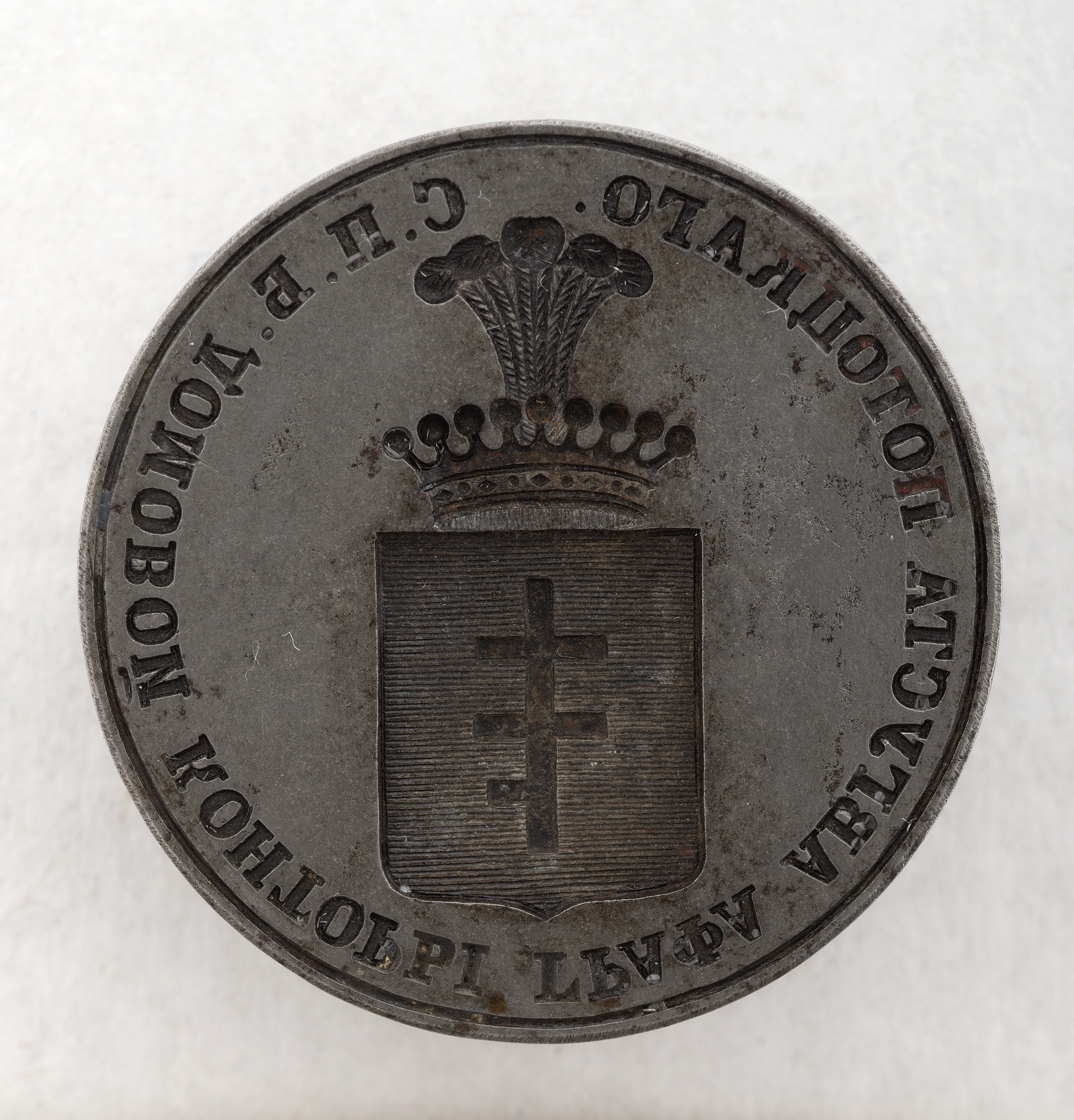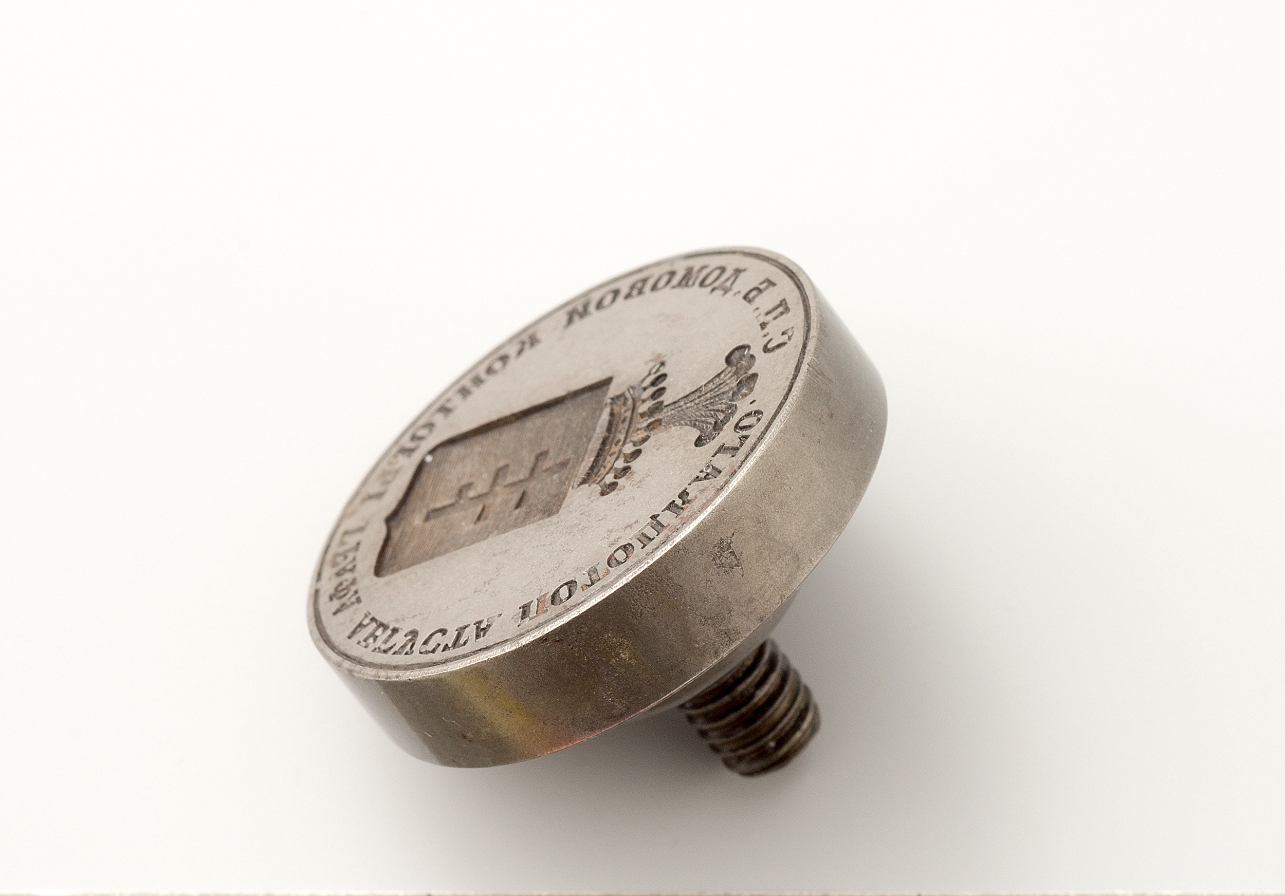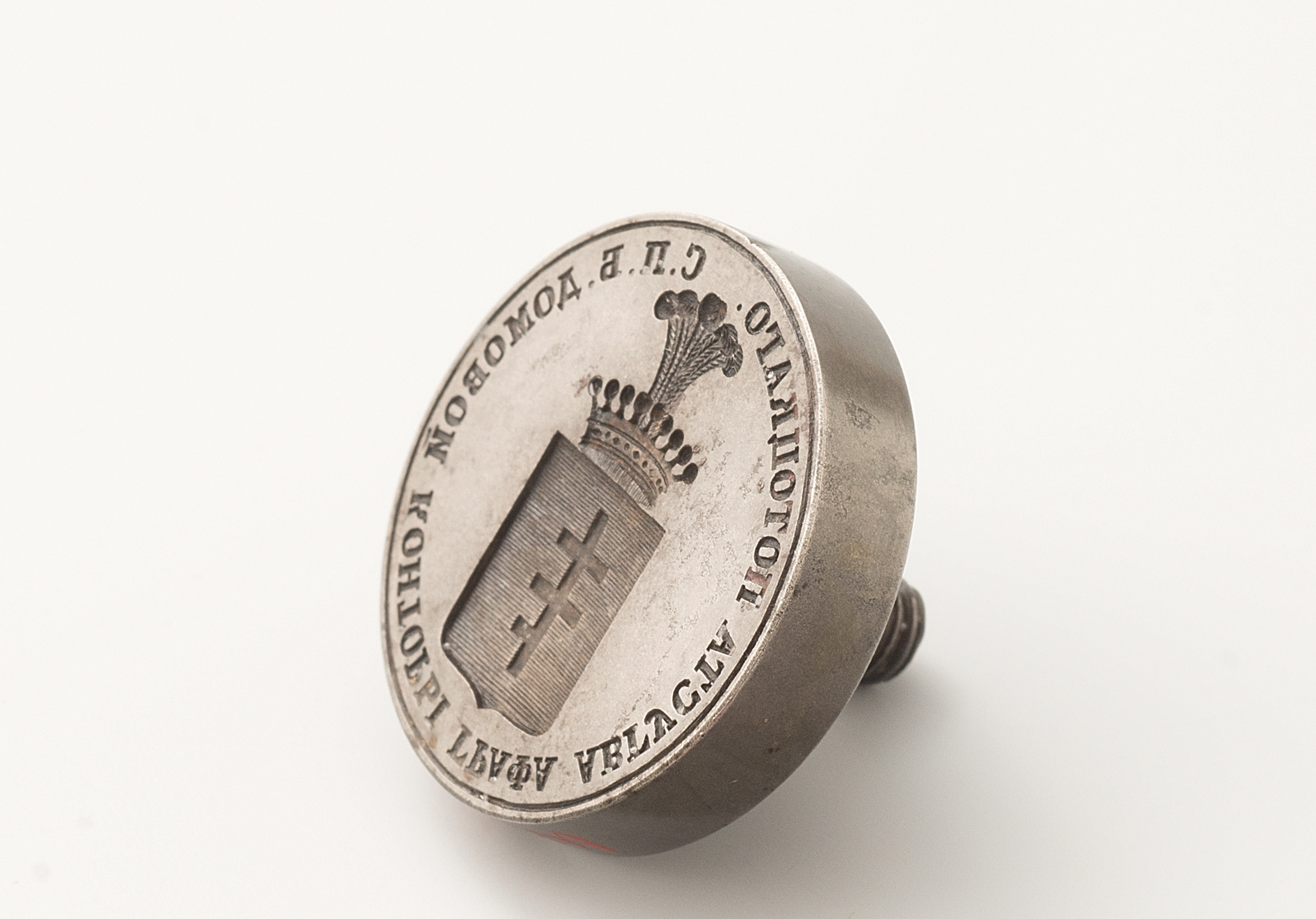 Dysponentem pieczęci, do której zachował się prezentowany tłok, był August Potocki (1805-1867), właściciel Wilanowa od 1840 roku. Typariusz (tłok) jest okrągły. Brak rączki. W polu pieczętnym wyryta została tarcza francuska nowożytna (tak określany jest kształt, który zastosowano w tarczy), a w niej, na błękitnym polu, znalazł się herb rodziny Potockich, Pilawa (kształt opisywany jako półtrzeciakrzyż). Tarcza zwieńczona jest dziewięciopałkową koroną hrabiowską z pięcioma strusimi piórami. Wokół biegnie napis wersalikami w języku rosyjskim, który wskazuje na charakter pieczęci: domowe biuro hrabiego Potockiego.