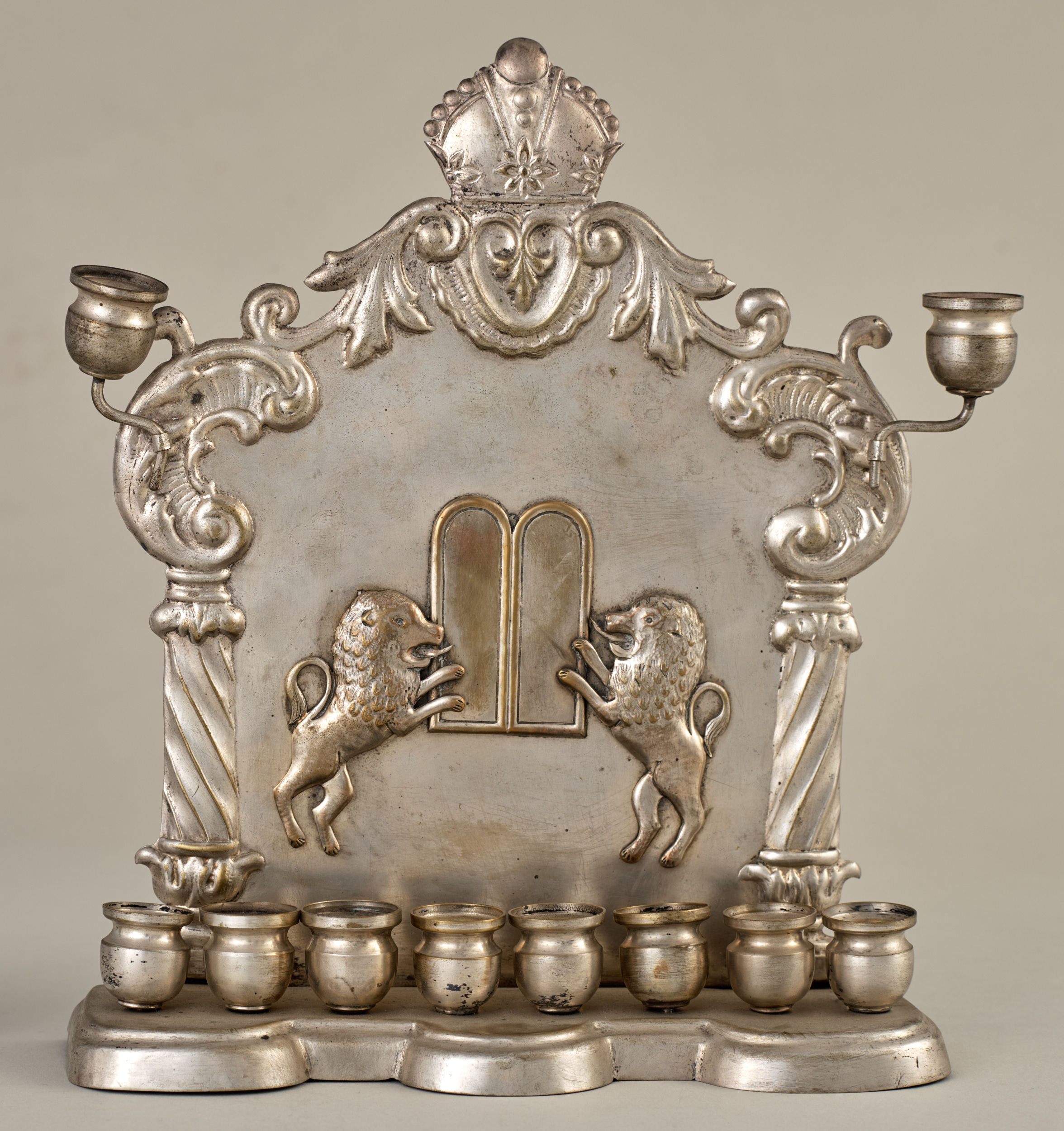 Lampka chanukowa używana w czasie Święta Chanuki występowała najczęściej w postaci lampki z zapleckiem, w której na podłużnej listwie zamocowanych było osiem naczynek lub tulejek na oliwę, bądź świece. Mogła mieć także formę ośmio— lub dziewięcioramiennej menory albo żyrandola. Znane były także lampki podróżne, w formie pudełek z wieczkiem. Opisywana lampka posiada pojemnik w formie korytka podzielony przegródkami na 8 części, z których każda ma wysunięty do przodu dziubek. Wykonana została z mosiądzu, ale robiono je również z fajansu i srebra, często stosując technikę filigranu czy plateru. Podobnie jak balsaminki, lampki chanukowe odznaczały się wyjątkowym bogactwem kształtów, zdobnictwa i symbolicznych przedstawień. W tym wypadku ażurowy zaplecek zdobi siedmioramienna menora wspierana przez dwa lwy stojące na postumencie, po bokach którego znajdują się zwrócone na zewnątrz ptaki. Lampki chanukowe zapalało się codziennie w czasie trwania Chanuki. Czyniono to po zachodzie słońca, zaczynając od jej lewej strony i dodając każdego dnia jedno światło więcej. W przeciwieństwie do świateł zapalanych w szabat lub inne święta, światło lampek chanukowych nie mogło być wykorzystywane w celach praktycznych. Obowiązywał również nakaz, by do ich zapalania używać dodatkowego punktu świetlnego. Dlatego zazwyczaj umieszczano na nich dziewiąty palnik, zwany szamesem, od płomienia, którym zapalało się wszystkie pozostałe. Tu z prawej strony znajduje się wypust, w którym umocowane było owe światło pomocnicze. W niektórych lampkach z zapleckami, oprócz szamesa, znajdował się jeszcze jeden palnik, co dawało w sumie dziesięć, a niekiedy i więcej punktów świetlnych. Te dodatkowe światła zapalane były w szabat, przypadający w czasie Chanuki. Lampka pełniła wówczas podwójną rolę – lampki chanukowej i szabaśnika. Świecznik chanukowy ustawiano również synagodze, po prawej stronie aron (ha-)kodesz, jako przypomnienie menory świątynnej. Był to jedyny przypadek, kiedy świecznik ten nazywano menorą, mianem której określano wyłącznie świecznik siedmioramienny.