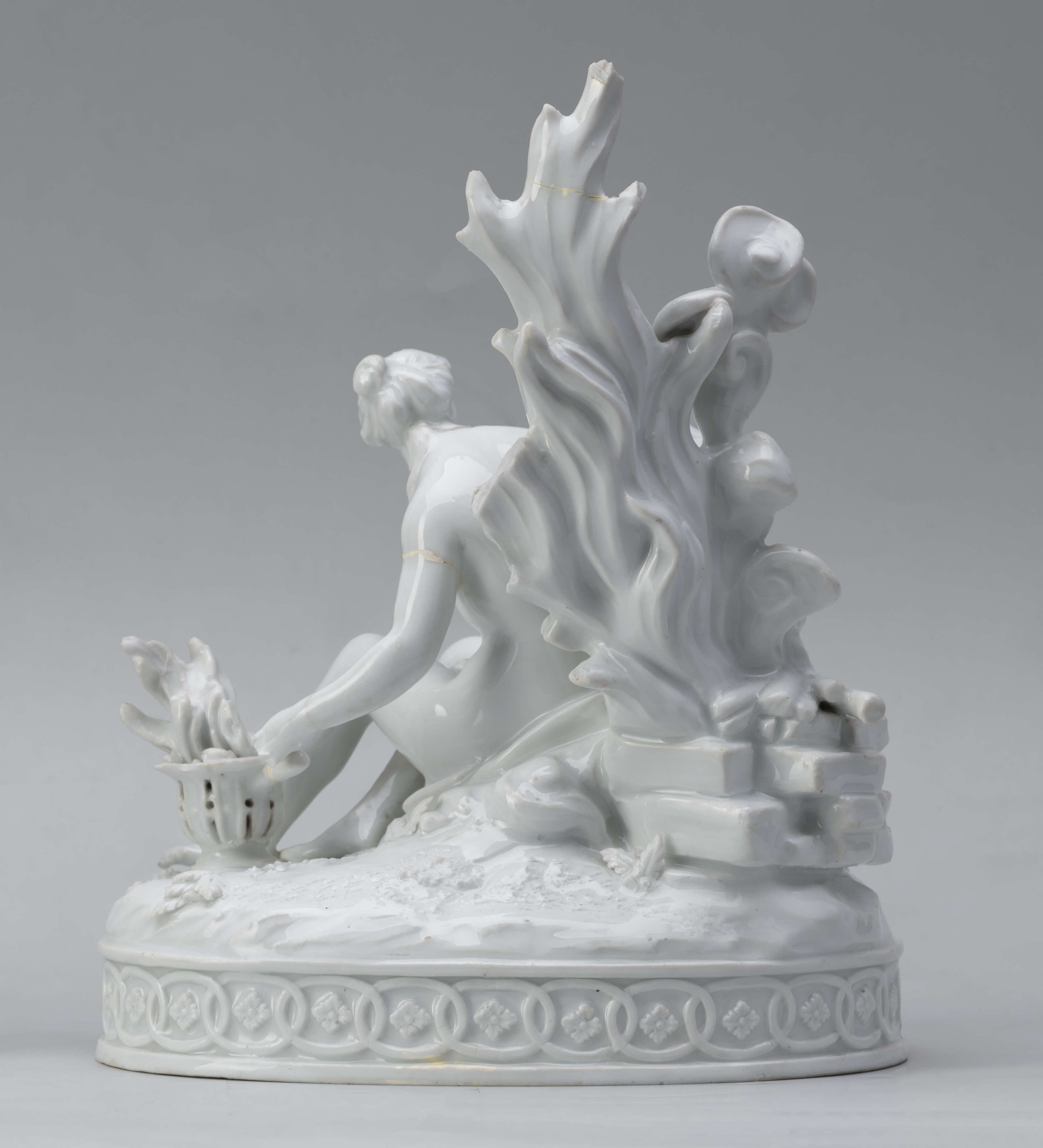 Wraz z jego przybyciem nastąpił w Miśni znakomity rozwój plastyki figuralnej. Kändler tworzył naczynia dekorowane rzeźbiarsko – jak w słynnym serwisie łabędzim – pojedyncze postacie i całe grupy figuralne. Jedną z nich jest grupa z nagą kobietą przy ogniu i puttem zapalającym pochodnię. Należy do zespołu figurek z alegoriami czterech żywiołów: Wody, Ognia, Ziemi i Powietrza, który Kändler opracował w 1747 roku. Każdy model wychodzący z pracowni był numerowany – ten ma numer 836 – co daje pogląd na rozmiary produkcji. Figurki zyskały wielką popularność i cieszyły się rosnącym popytem, dlatego powracano po latach do tych samych wzorów, wprowadzając czasem zmiany (prawa autorskie w obecnym rozumieniu nie były jeszcze znane). Nasza została wykonana w czasach, kiedy wytwórnią kierował Camillo Marcolini (1774–1814). W modelu Kändlera podstawa jest niska, nieregularna, z trawą i kwiatkami, a figurki wielobarwnie malowane. Późniejsza wersja zgodnie z duchem epoki jest śnieżnobiała na podstawie w formie owalnego cokołu z dekoracyjnym fryzem dookoła.