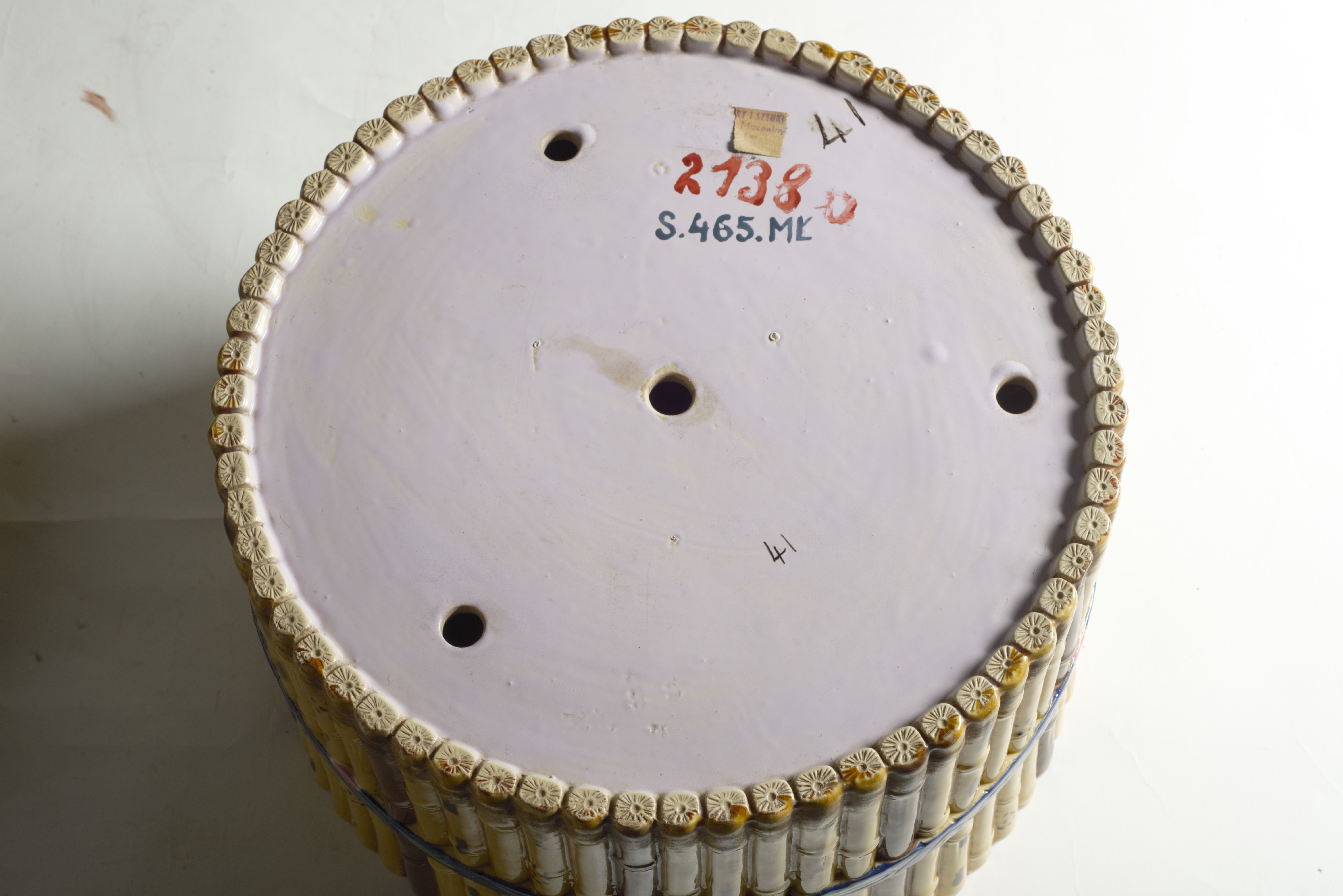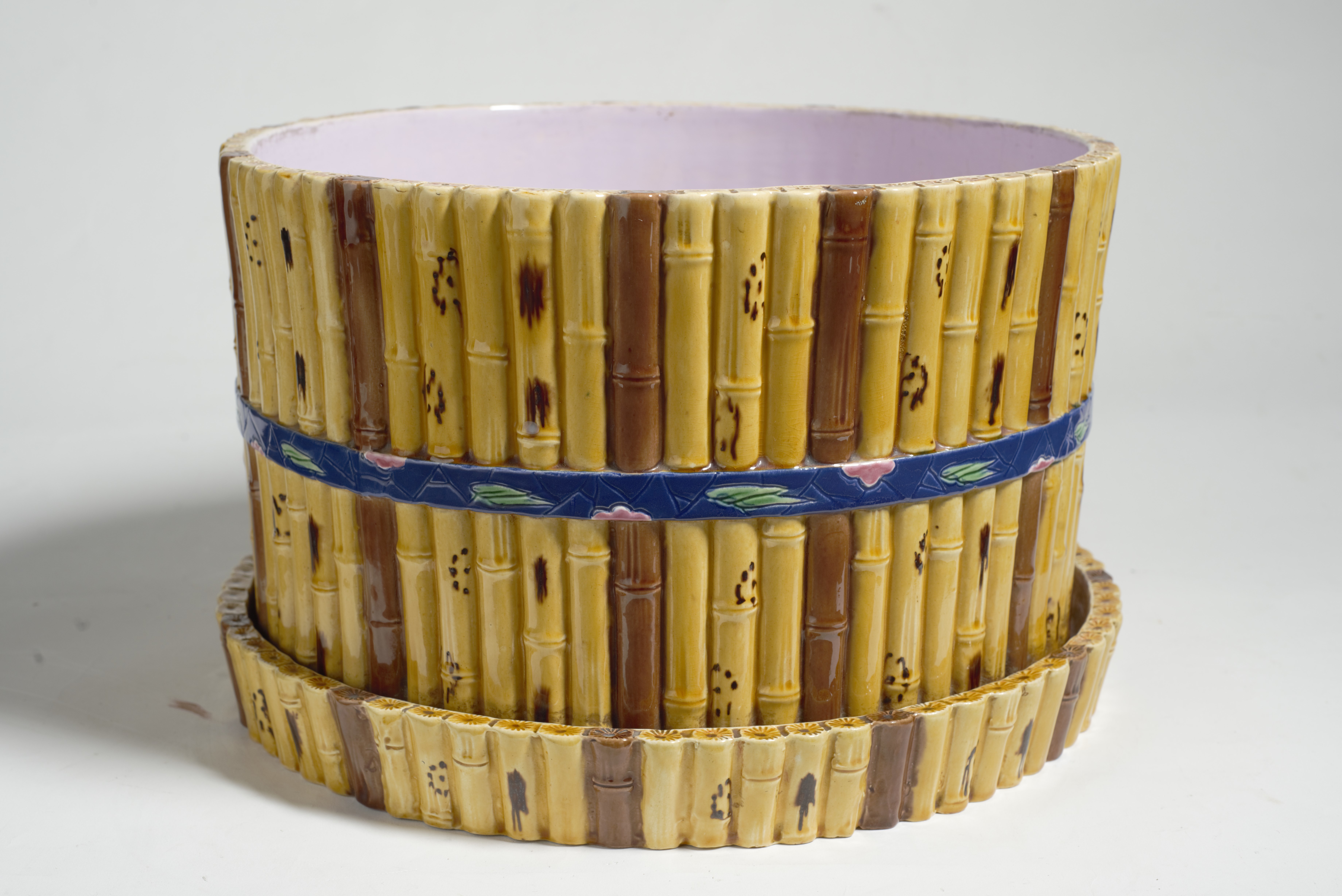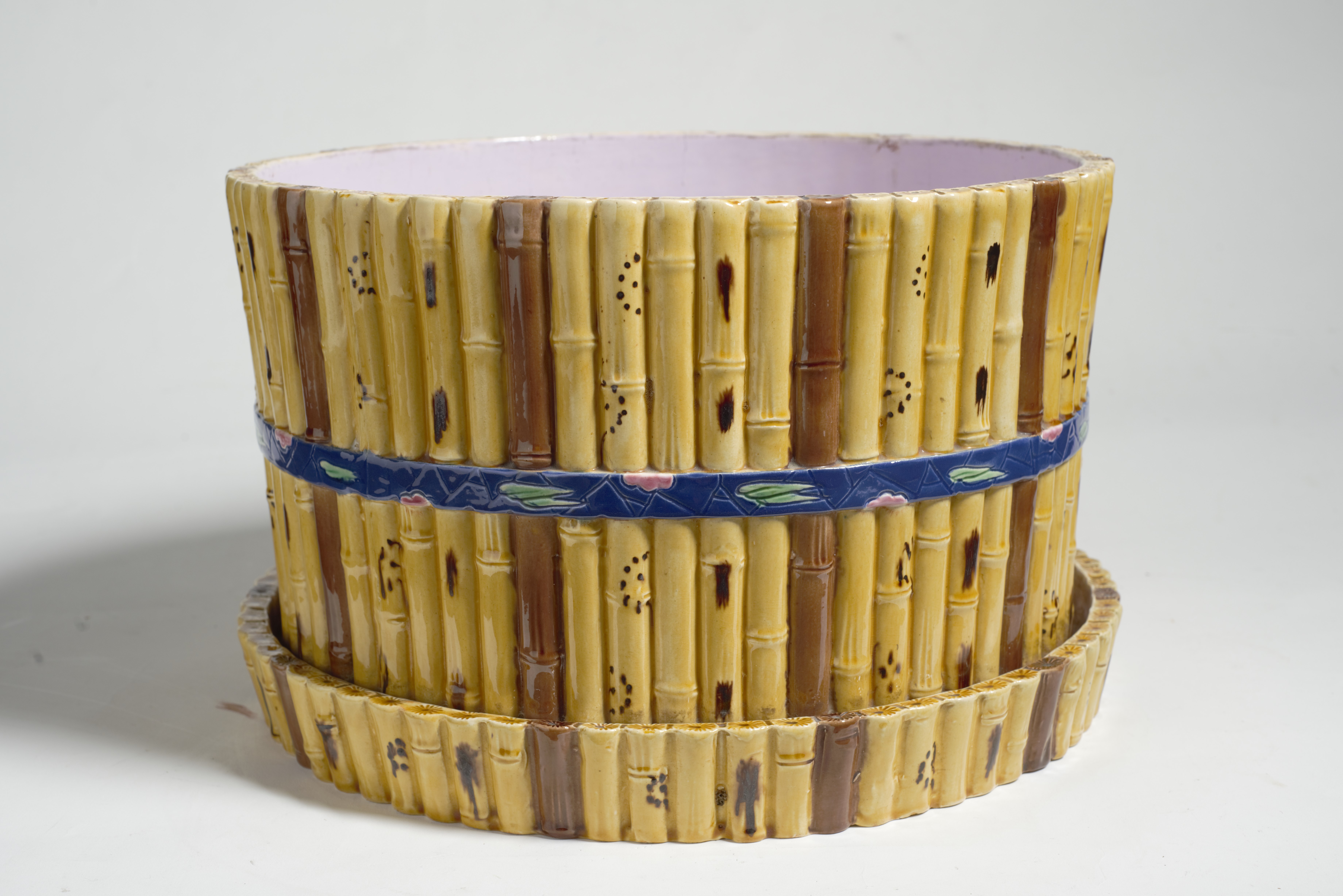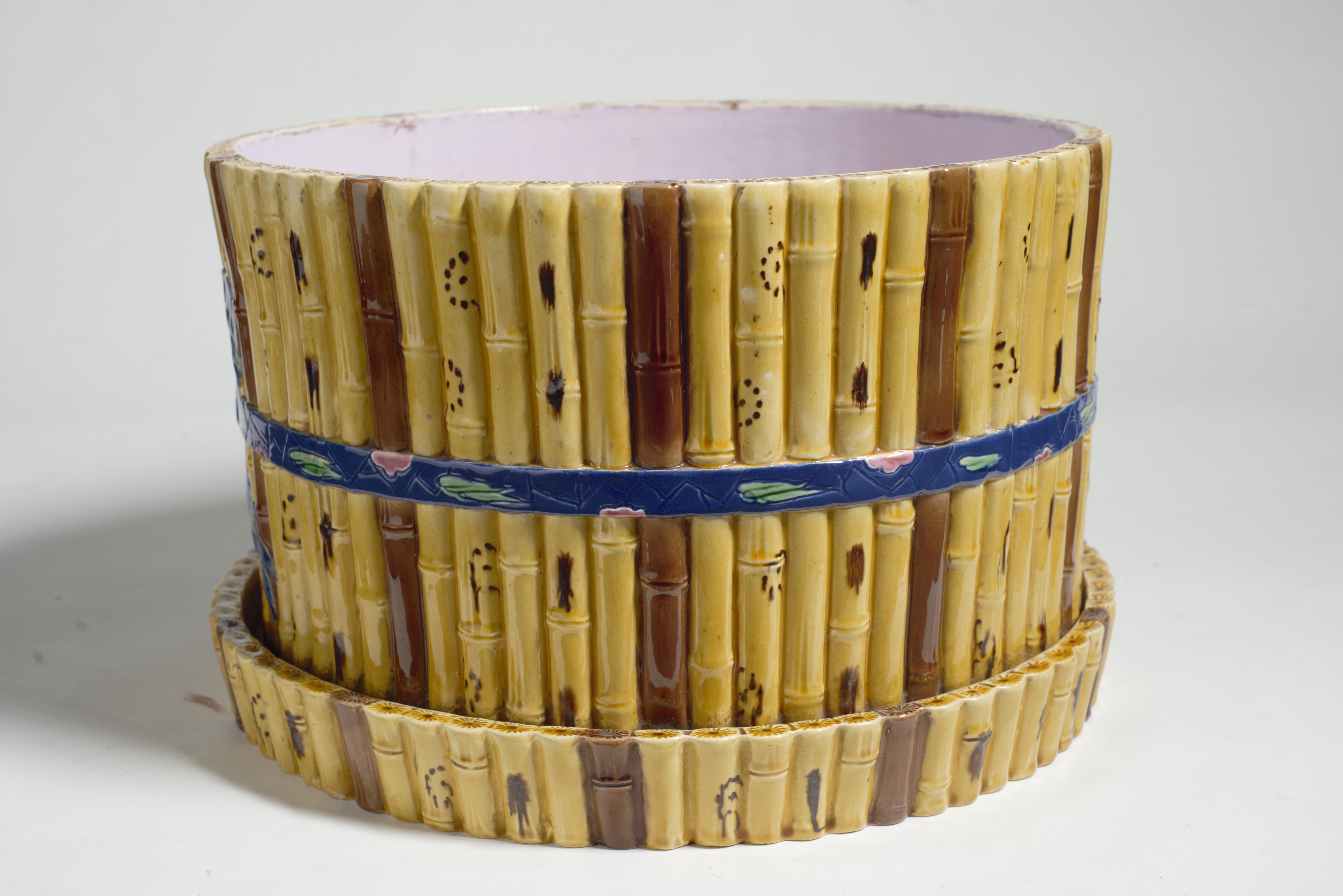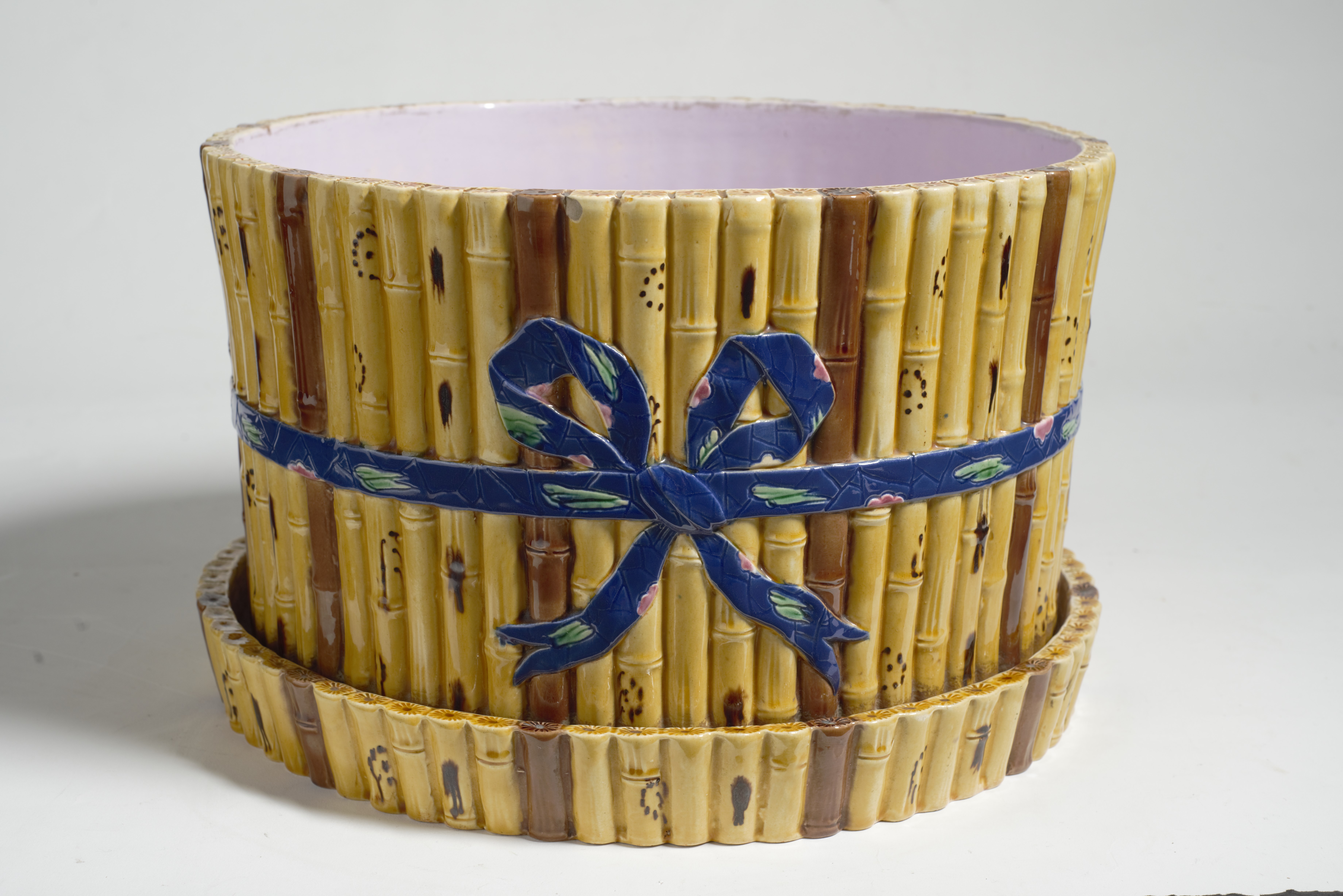 Cache-pôt z pary donic majolikowych wykonanych w słynnej angielskiej wytwórni ceramiki Minton & Co w Stoke-on-Trent, działającej od końca XVIII w. Wytwórnia ta była głównym producentem majoliki w wiktoriańskiej Anglii, m.in. naczyń typu cache-pôt służących do wstawiania doniczek z kwiatami.