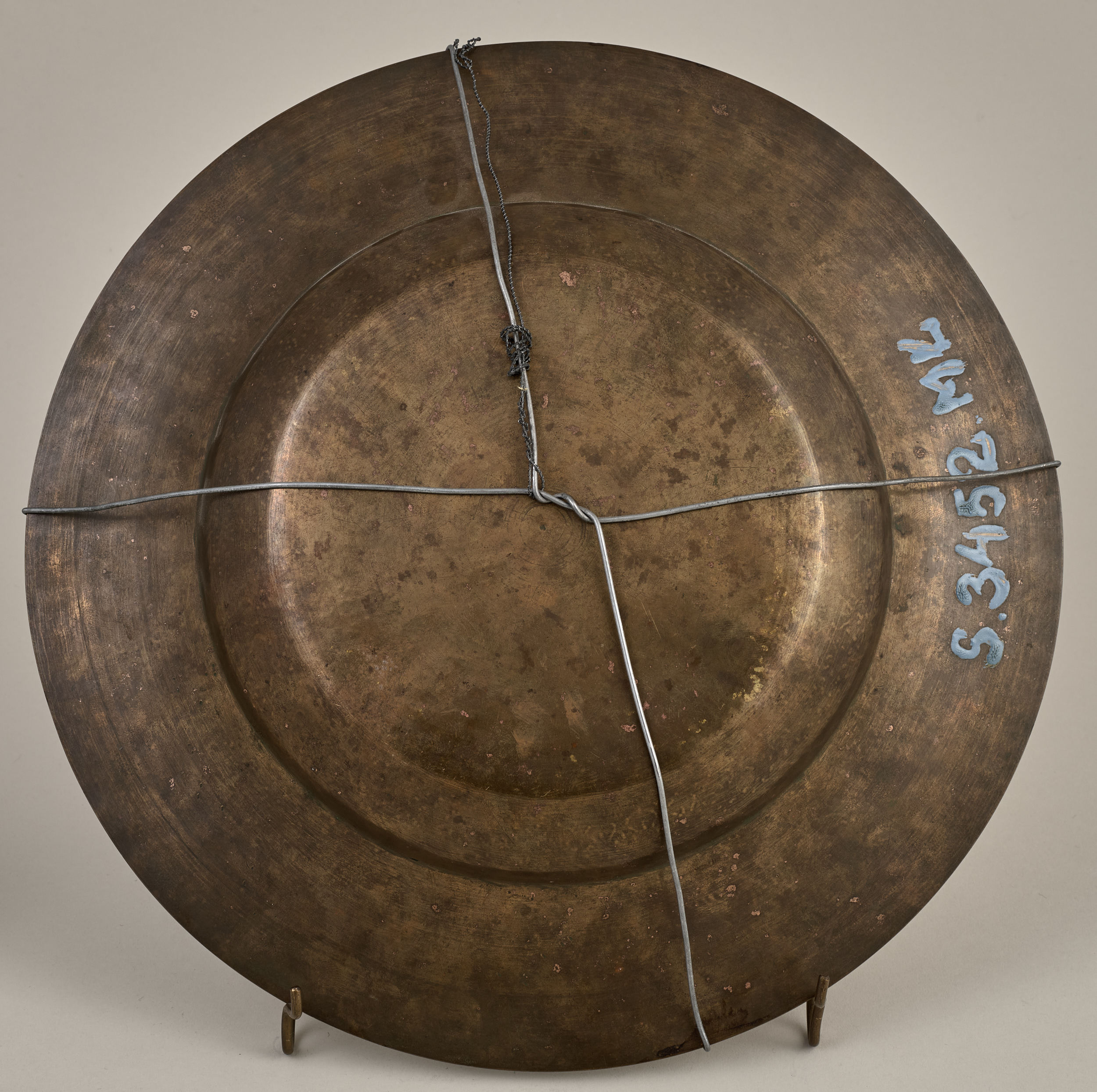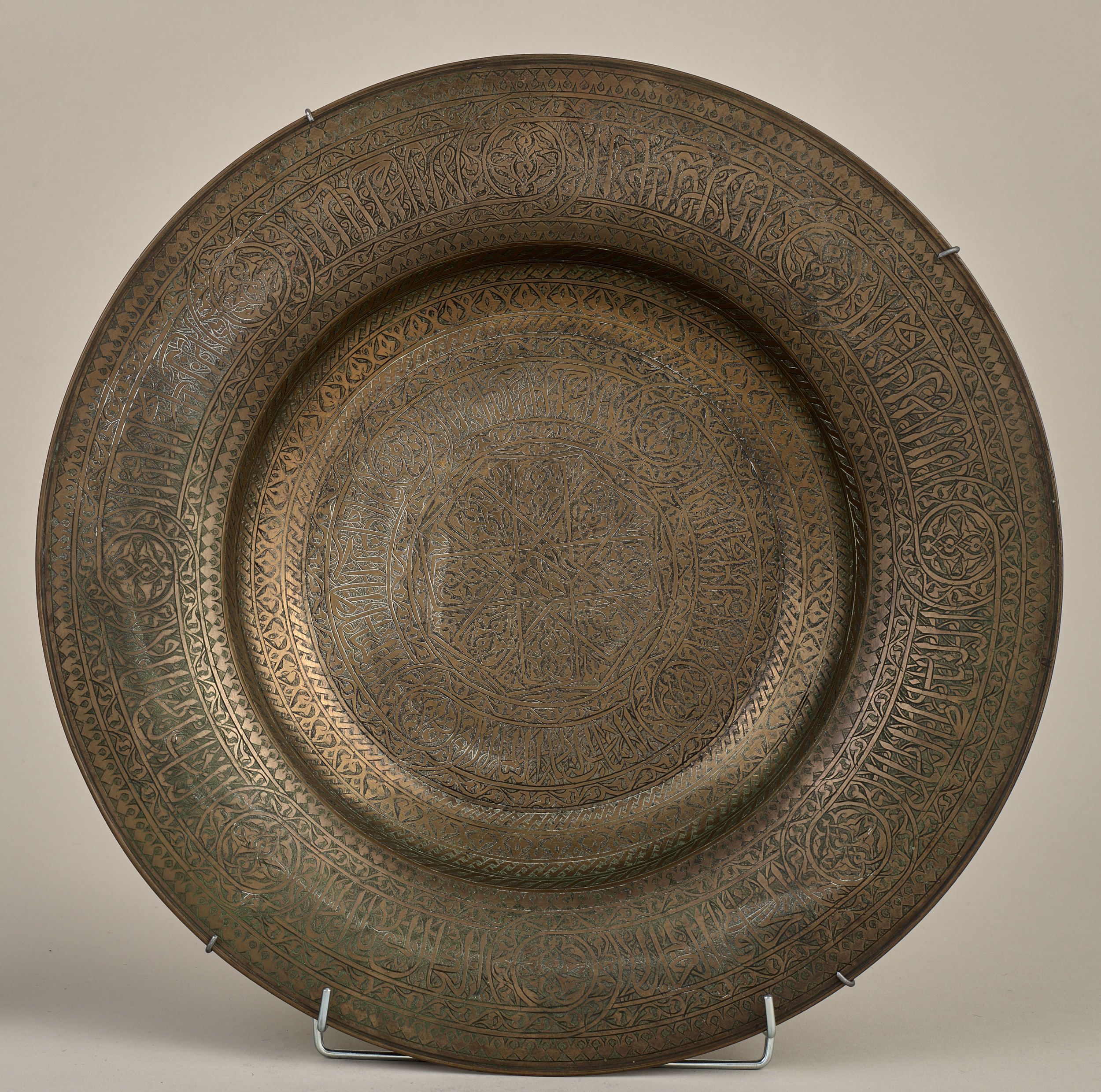 Mosiężny, grawerowany, głęboki talerz. Dno o zaokrąglonych brzegach przechodzi w lekko wypukły otok. Zdobiony rytym ornamentem płaszczyznowym, szczelnie wypełniającym dekoracyjne pole ułożone z obiegających koliście pasów. Motywy zdobnicze geometryczne, roślinne, rozety i prawdopodobnie tekst. Talerz pochodzi z Bliskiego Wschodu, XIX wiek.