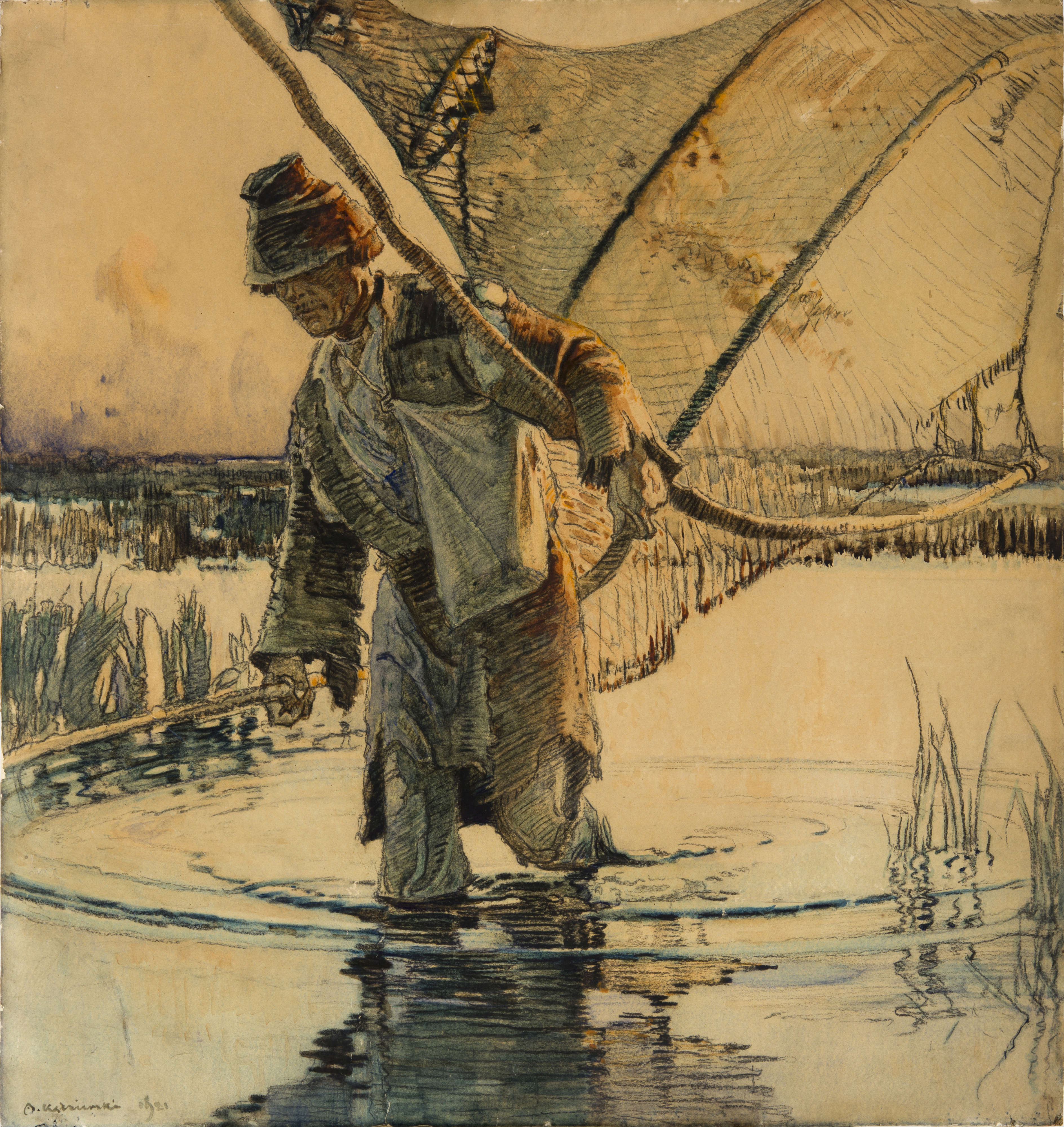 Apoloniusz Kędzierski (1861–1939) jako uczeń Józefa Brandta bywał częstym gościem w Orońsku, w majątku należącym do artysty. Studia odbył pod kierunkiem Aleksandra Kamińskiego i Wojciecha Gersona w warszawskiej Klasie Rysunkowej. Dzięki wsparciu finansowemu Brandta kontynuował naukę w monachijskiej Akademii Sztuk Pięknych. W 1889 roku osiadł w Warszawie, angażując się w życie artystyczne kraju. Motyw brodzącego w wodzie rybaka z charakterystycznym sakiem – rozpiętą na obręczach siecią, ujętego na tle sumarycznie potraktowanego pejzażu, jest jednym z wielu ujęć tego przedstawienia zapoczątkowanych przez artystę w latach 90. XIX wieku, podczas wyjazdów w okolice Opoczna. W scenach z rybakiem, różniących się sposobem kadrowania, Kędzierski eksperymentował również z techniką – obok wersji olejnej pojawiały się kompozycje w technice pastelowej i akwarelowej. Właściwości akwareli, po którą sięgnął jako dojrzały artysta, dawały możliwość szybkiego rejestrowania studiów plenerowych odwołujących się do urody polskiego pejzażu. Przedstawienie odnosi się do ważnego dla Kędzierskiego i innych twórców Młodej Polski problemu ludowości i fascynacji rodzimym folklorem będącego wyrazem szacunku dla ciężkiej pracy chłopów podpatrywanych na roli, podczas zwózki drewna, żniw czy łowienia ryb. Wnikliwa obserwacja życia w pełnej harmonii z przyrodą zdradza wrażliwość kolorystyczną Kędzierskiego, który poszukując efektu barwnego, z wyczuciem kontrastuje zimne i ciepłe barwy, wycisza paletę do zgaszonych tonów chłodnego błękitu i zieleni, przytłumionych oranżów, brązu i tworzącej modelunek rozmytej czerni. Scena staje się pretekstem do analizowania właściwości luministycznych naturalnego światła, którym artysta poświęca szczególną uwagę w swoim malarstwie. Refleksy rozproszonych promieni słonecznych ślizgają się po tafli wody i szuwarach, rozświetlają płaszczyznę nieba i partie stroju mężczyzny, wywołując, mimo starannie przemyślanej, zrównoważonej kompozycji, złudzenie lirycznej nastrojowości i ulotności chwili. Ten efekt potęguje również rozmycie i rozedrganie cienia na płaszczyźnie wody poruszonej ruchem rybaka. Wyraźnie wyczuwalny ton refleksji i zadumy nad pięknem rodzimego pejzażu ujawnia emocjonalny stosunek artysty do przyrody i otaczającej rzeczywistości.