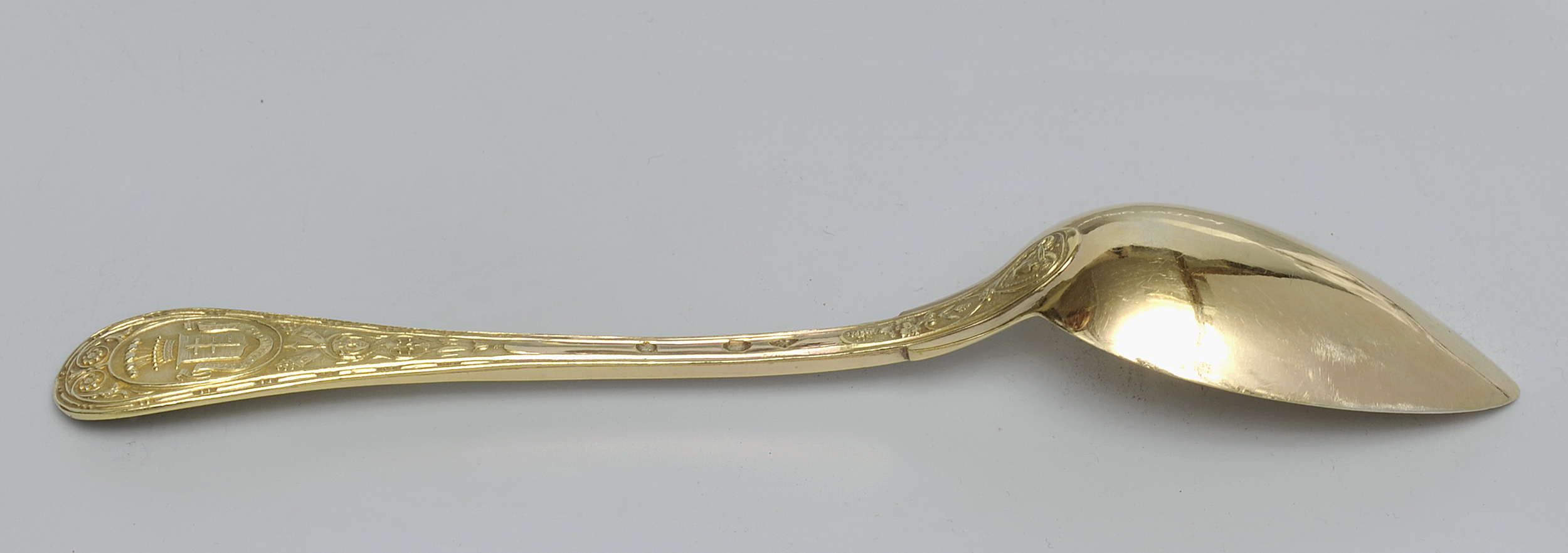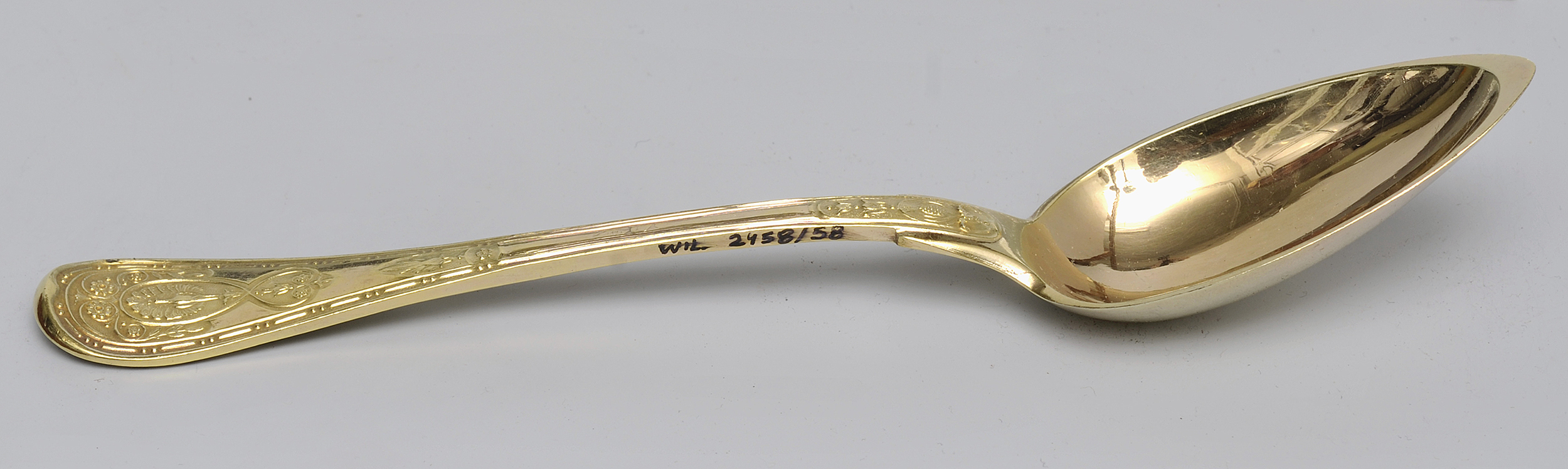 Łyżka deserowa o wydłużonym owalnym czerpaku jest jedną z siedemdziesięciu dwóch łyżek zachowanych w wilanowskiej kolekcji.
