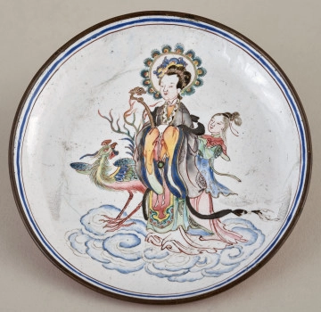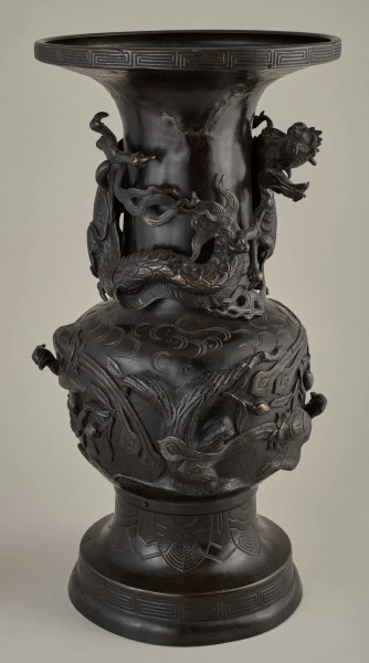 Duży wazon na wysokiej, okrągłej stopie, do której przymocowano kulisty brzusiec z wysoką, rozszerzającą się kielichowatą szyją. Dekoracja na brzuścu naczynia przedstawia w reliefie trzy mityczne ptaki Feng - huang na tle obłoków, między drzewami brzoskwini – drzewa Nieśmiertelnych. Wokół szyi wazonu znajduje się dekoracyjny opleciony, plastycznie wymodelowany smok, odlany oddzielnie. Na stopie ryty szlak meandra i lancetowatych liści wokół górnego brzegu szyi ryty szlak meandra. Między stopą a brzuścem wstawiono płytkę z metalu, od wewnątrz gładką, od spodu z reliefową dekoracją – 2 żurawie nad sosną. Wazon składa się z czterech oddzielnie odlanych części. Chiny, II połowa XIX wieku.