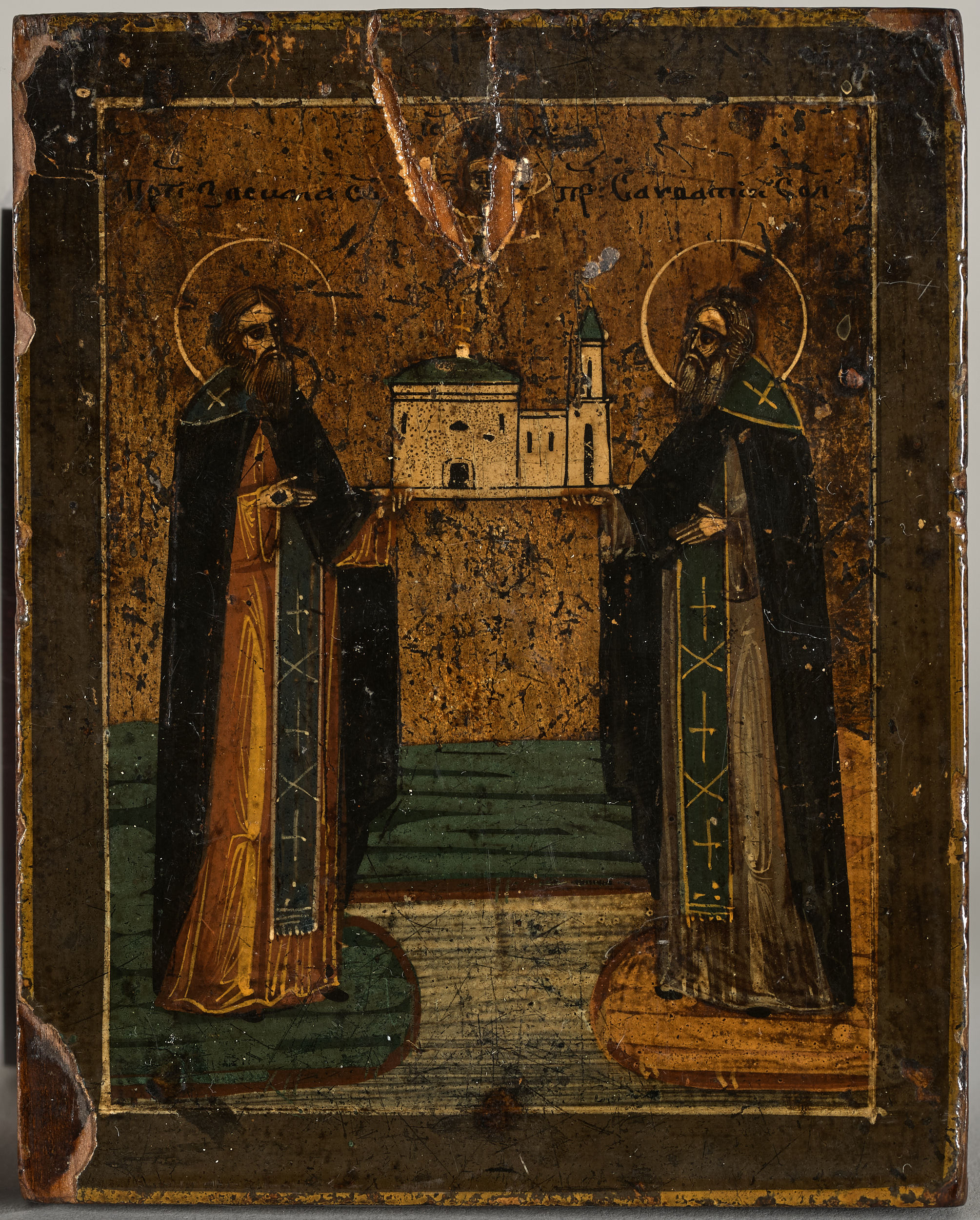 Ikona obrazuje mnichów Sawwacjusza i Zozyma Sołowieckich żyjących w XV w. Mnich Sawwacjusz wraz ze współtowarzyszem Germanem z monasteru na wyspie Waałam w poszukiwaniu odosobnienia udali się w 1429 r. na północne pustkowia nad Morzem Białym i urządzili samotnię na Siekiernej Górze Sołowieckich Wysp. Mieszkali w surowych warunkach przez kilka lat oddając się modlitwie. Po śmierci Sawwacjusza w 1435 r. German szukając współtowarzysza spotkał nad Białym Morzem Zozyma. Był to młody człowiek plebejskiego pochodzenia znad jeziora Onega, który chcąc uniknąć żeniaczki oddalił się z domu rodziców, w poszukiwaniu odosobnienia oraz przewodnika duchowego zamieszkał z Germanem w pustelni by dzielić z nim ascetyczne życie. Pewnego razu Zozym w widzeniu ujrzał cerkiew unoszącą się w powietrzu. Odczytując to jako znak dany od Boga rozpoczęto budowę cerkwi Przemienienia Pańskiego. Świątynia stała się zalążkiem Monasteru Sołowieckiego, którego rozkwit nastąpił w XVI-XVII w. W połowie XVII w. klasztor na Sołowkach stawiał opór reformie liturgicznej patriarchy Nikona. Oblegany przez wojsko carskie monastyr zdobyto zbrojnie w 1676 r., a mnichów wymordowano. Odtąd święci Zozym i Sawwacjusz, których relikwie spoczywały na Sołowkach, są szczególnie czczeni przez staroobrzędowców sprzeciwiających się cerkiewnej reformie. Święci Zozym i Sawwacjusz są uznani za patronów Morza Białego i pszczelarzy, wspominani w cerkwi prawosławnej 30 kwietnia, 8 sierpnia i 27 września – odpowiednio 17 kwietnia, 21 sierpnia i 10 października wg kalendarza juliańskiego. Po rewolucji 1917 r. monastyr Sołowiecki zlikwidowano urządzając w jego zabudowaniach specjalny stalinowski obóz pracy dla więźniów politycznych, duchowieństwa i inteligencji. W latach 60 XX w. w monasterze zainicjowano muzeum, a w 1990 r. zwrócono go cerkwi prawosławnej Patriarchatu Moskiewskiego.