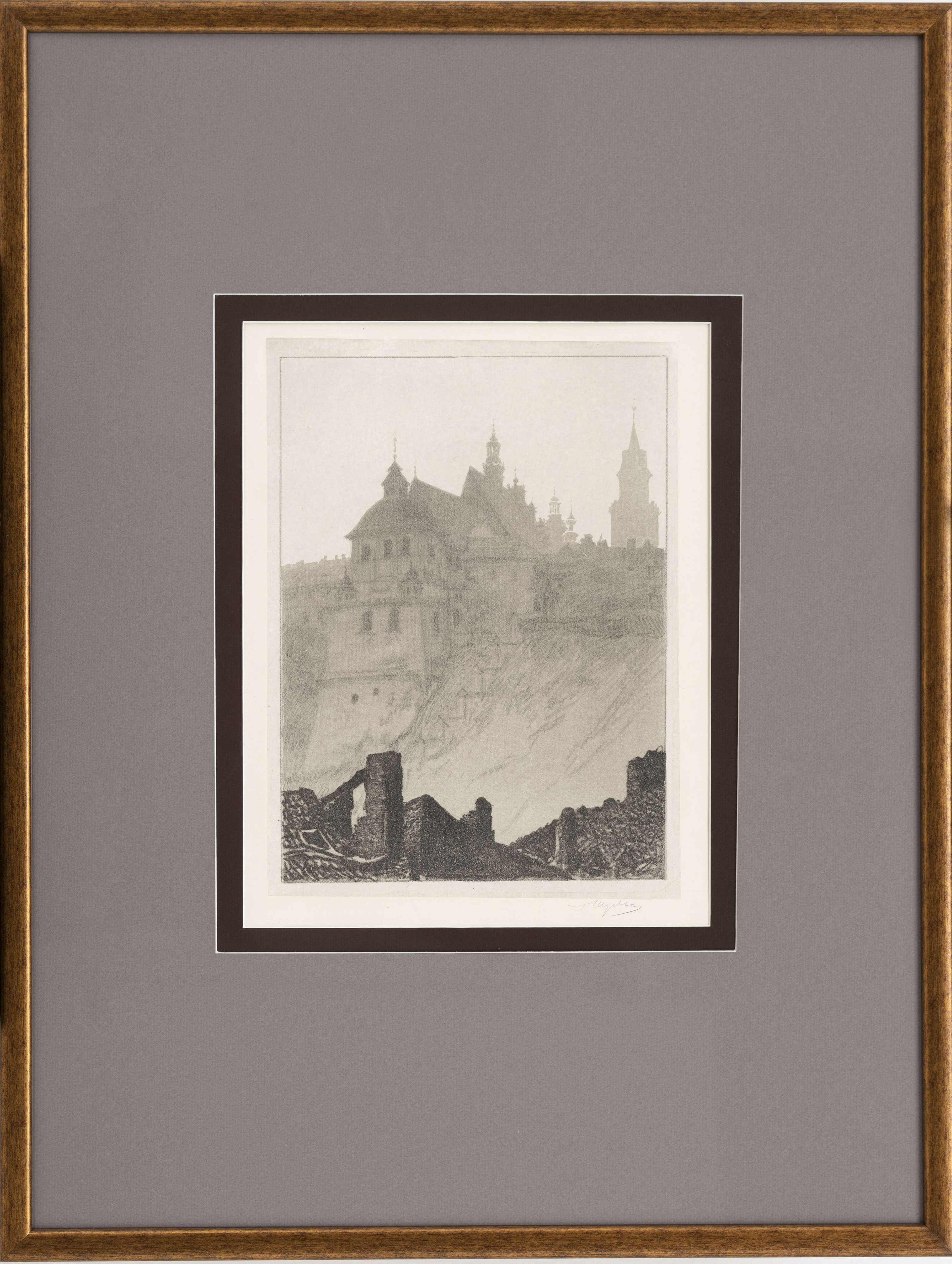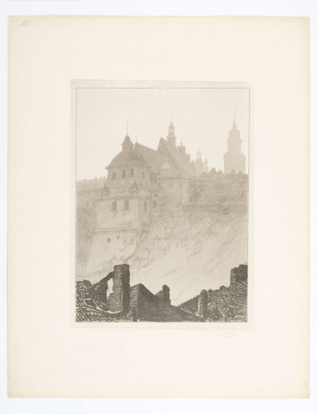 Kościół i klasztor oo. Dominikanów, położony w obrębie murów obronnych Starego Miasta, nad skarpą wzgórza Staromiejskiego, należy do najcenniejszych i najstarszych zespołów sakralnych w Lublinie. Do czasu kradzieży w 1991 roku w sanktuarium przechowywano słynącą cudami relikwię Drzewa Krzyża Świętego, która przyciągała pielgrzymów z całego kraju. W jednej z najbardziej nastrojowych plansz teki Wyczółkowski ujął założenie od strony północno-wschodniej, prezentując je w oddaleniu, widoczne z perspektywy mocno wykadrowanych dachów pierwszego planu. Ich ciężka bryła kontrastuje z lekkością wydobytych światłocieniem zamglonych murów świątyni, które rozpływając się w wieczornym zmierzchu, oddają nastrój kończącego się dnia.