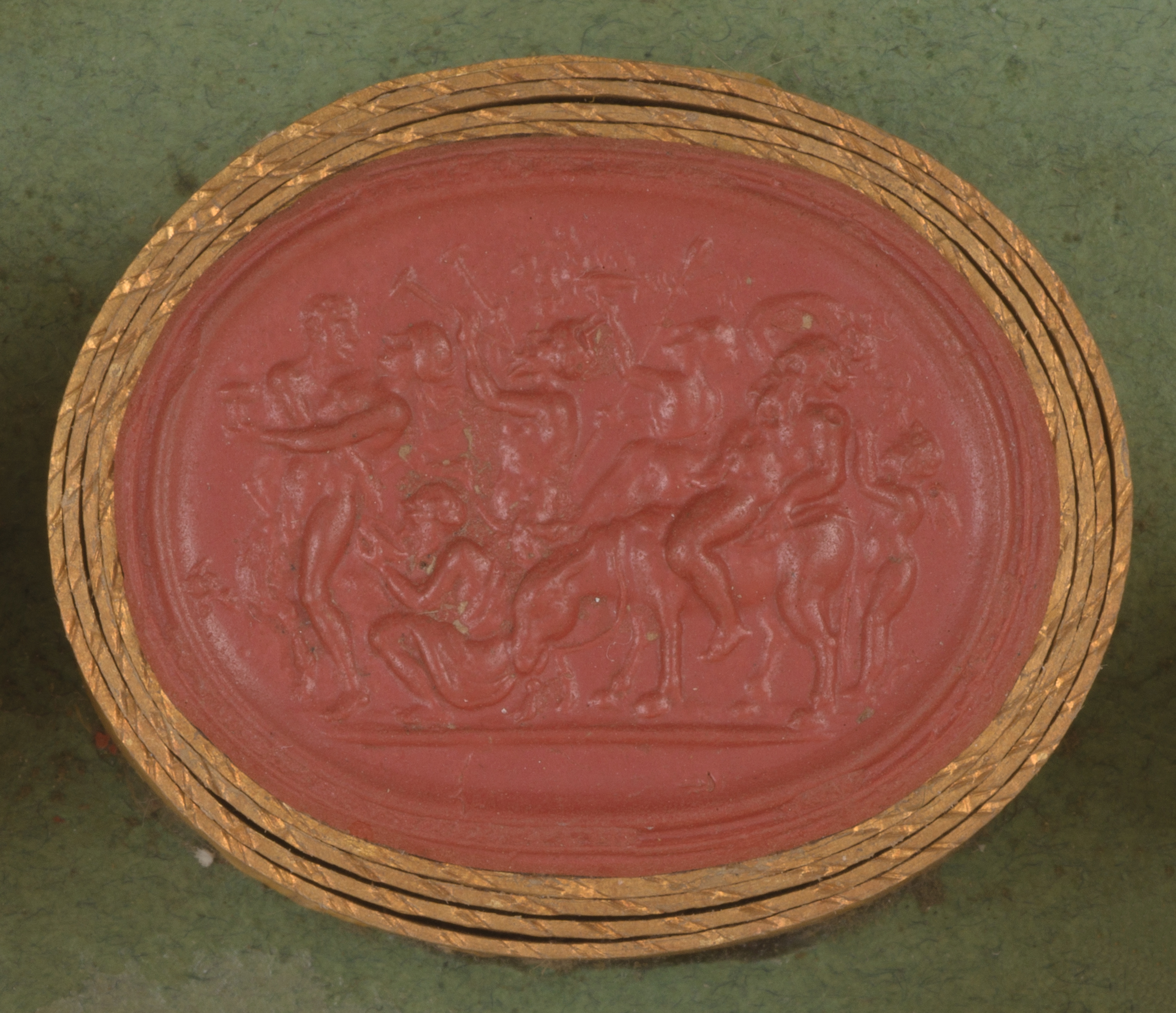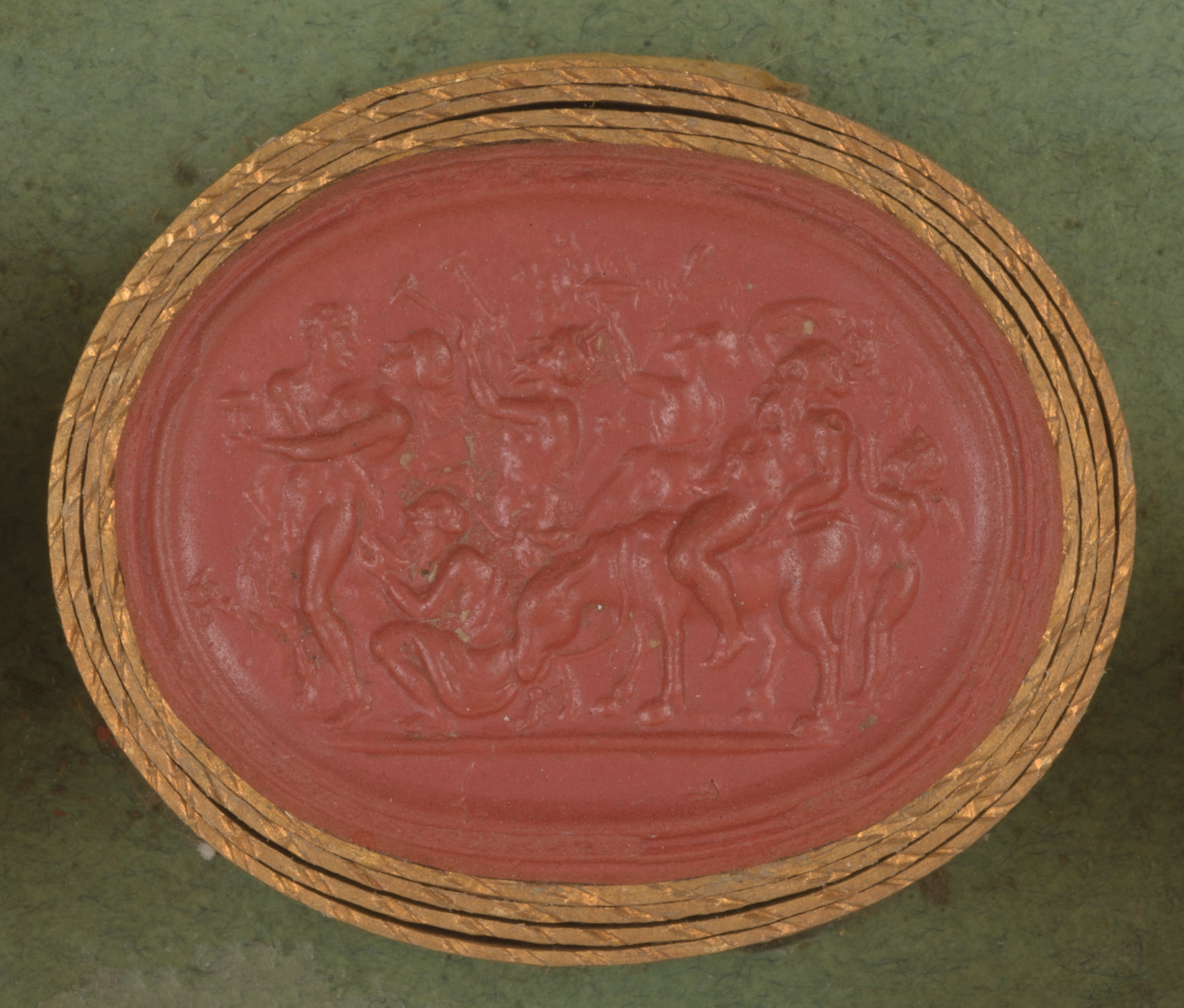 Prezentowany obiekt to elipsoidalny, wypukły wycisk gemmy na płaskim tle, obwiedziony podwójnym wałkiem. Scena przedstawia pochód Bachusa z udziałem wielu postaci. Na czele widzimy nagą kobietę, trzymającą naczynie i omdlewającą, podtrzymywaną przez młodego Fauna. Za nimi kroczy postać pijąca wino z kylikosu. Dalej widoczny jest starszy Faun grający na fletach, a za nim kobieta niosąca tyrs i czarę z ogniem. Następnie pojawia się gruby, nagi mężczyzna na osiołku, być może Sylen, trzymający osła za uzdę. Cała scena wydaje się być w stanie alkoholowego upojenia. jest to popularny temat przedstawień w ikonografii. Wycisk jest identyczny jak opisany w „Dactyliothecae universalis” Philippa Daniela Lipperta.