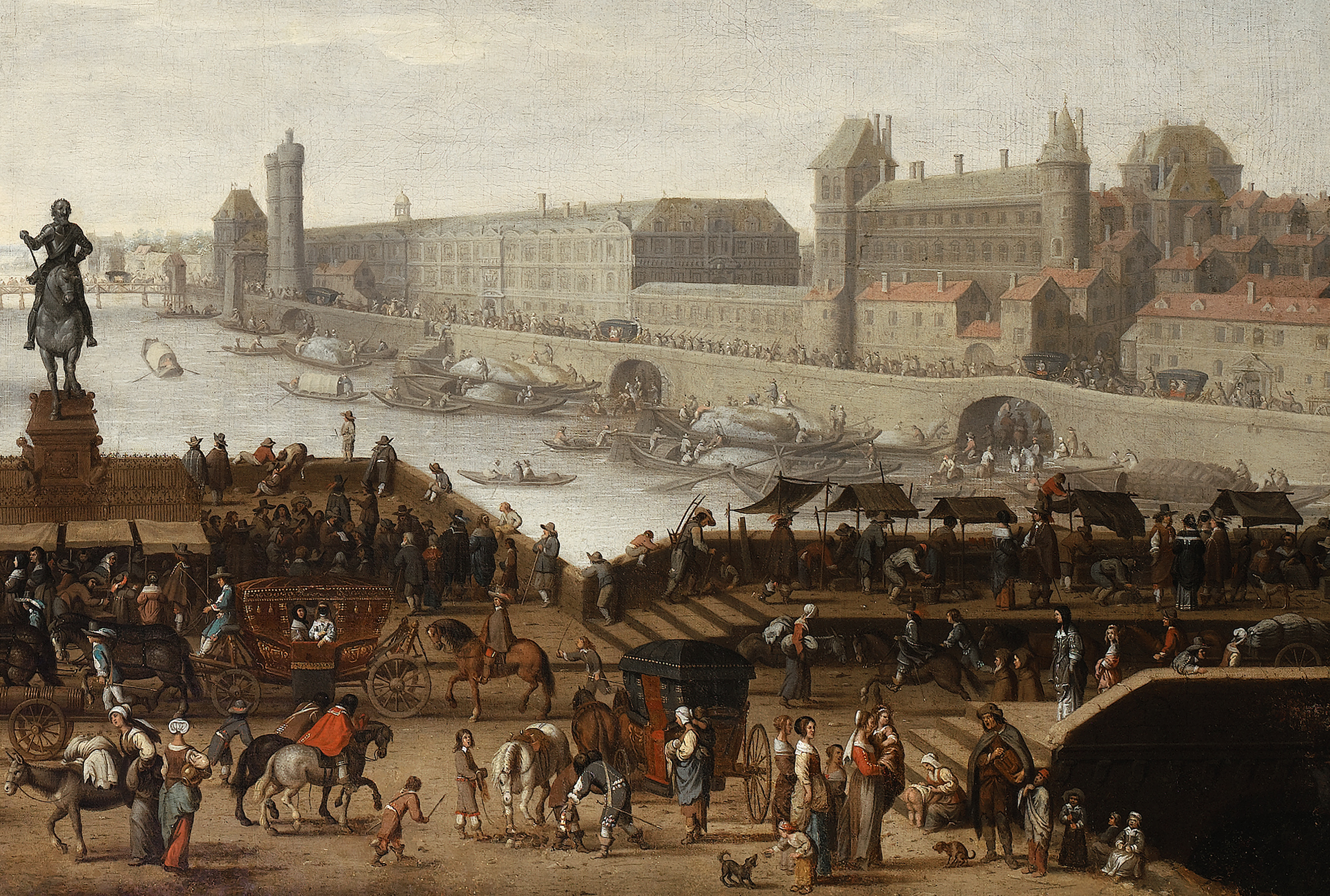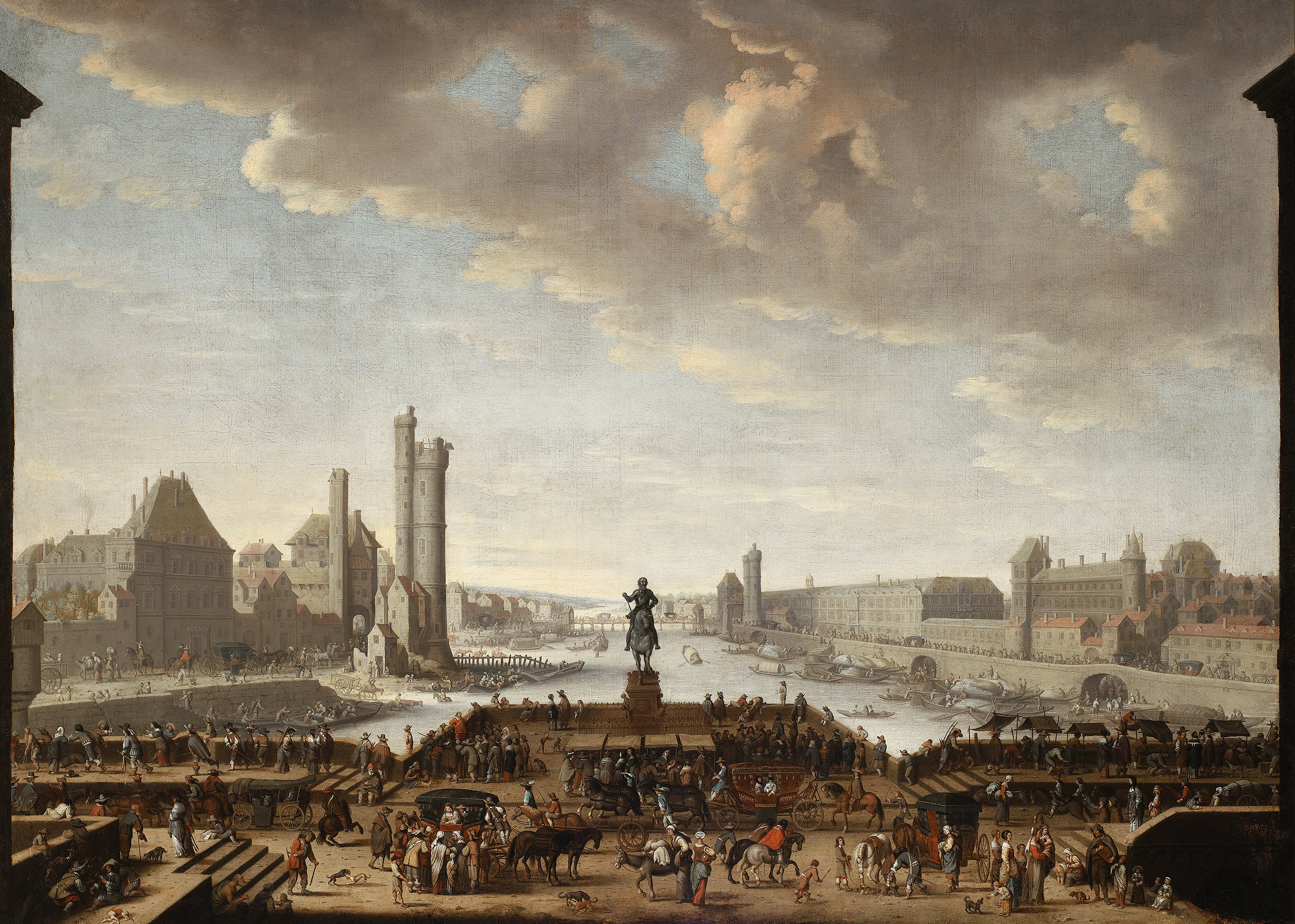 Pont Neuf (Nowy Most) to najstarszy istniejący most w Paryżu (1604 lub 1607) i pierwszy niezabudowany domami, łączący Luwr z opactwem Saint-Germain-des-Prés. Topografię miejsca nietrudno zidentyfikować – to panorama Paryża z Place de Pont Neuf na pierwszym planie, widoczna z wejścia na Place Dauphine. Zgromadzony tu tłum tworzy przekrój ówczesnego społeczeństwa stolicy. Widzimy konnych i wielmożów w karetach, wokół których tłoczą się przechodnie: żołnierze, zwykli spacerowicze, wędrowni kupcy, żebracy i kalecy; tu i ówdzie bawiące się dzieci i psy. Na osi kompozycji pomnik konny króla Henryka I; przy cokole ogrodzonym żelazną kratą alegorie czterech stron świata.