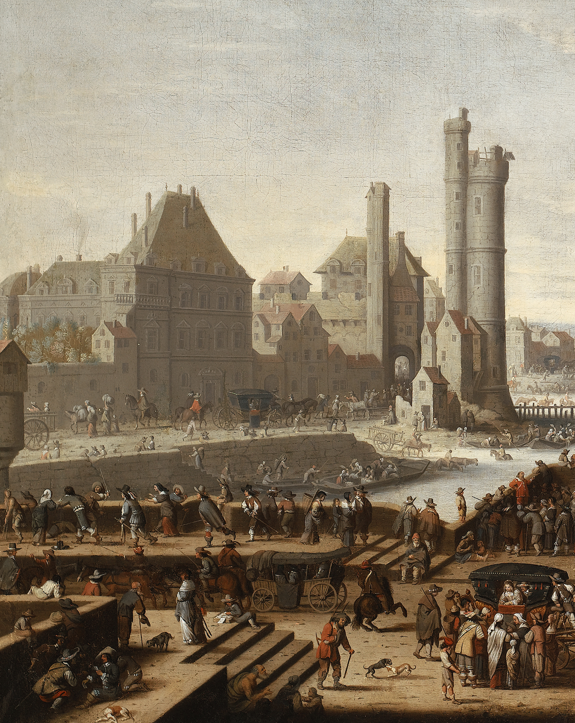 Obraz obfituje w „smaczki” obyczajowe. Widzimy kobietę przebierającą dziecko, grających w karty, mówcę w czerwonym odzieniu (być może sztukmistrza) oraz mężczyznę odczytującego publicznie jakiś list lub odezwę. Jesteśmy też świadkami ostrej wymiany poglądów z użyciem szabel. Sekwana żyje. Kobiety piorą bieliznę przy użyciu kijanek na drewnianych łodziach, noszą pranie w wiklinowych koszach, prowadzą objuczone osły. Grupa kobiet z dziećmi przysłuchuje się muzykowaniu wędrownego grajka.