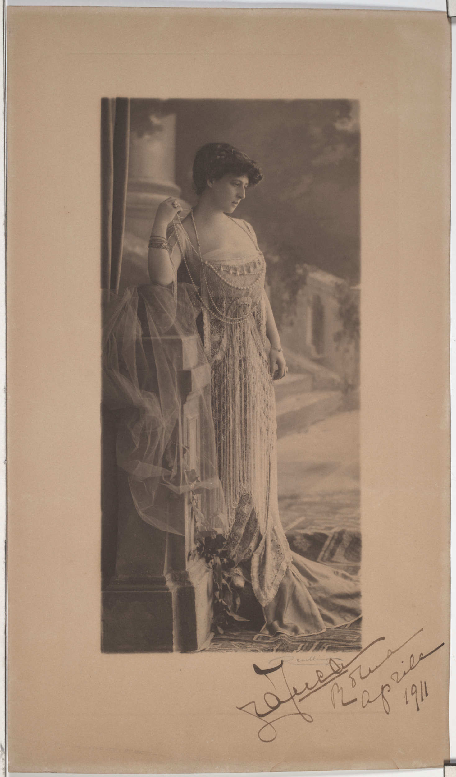 Fotografia w kształcie prostokąta, przedstawiająca młodą kobietę z głową lekko pochyloną, lewa ręka wsparta o balustradę, prawa opuszczona swobodnie w dół. Kobieta prawą ręką podtrzymuje sznur pereł opadający aż do pasa. Kobieta ubrana w zwiewną suknię z dużym kwadratowym dekoltem. Na szyi potrójny szur pereł, na rękach bransoletki a na palcach pierścionki. Na balustradzie zwiewny tiulowy szal. W tle schody i kolumny budowli. Fotografia wykonana została w atelier w kwietniu 1911 r. Odwrocie obite tkaniną rypsową w kolorze złotawym z podpórką do stawiania. Fotografie przejęto ze zbiorów Potockich z Łańcuta w 1944 r.