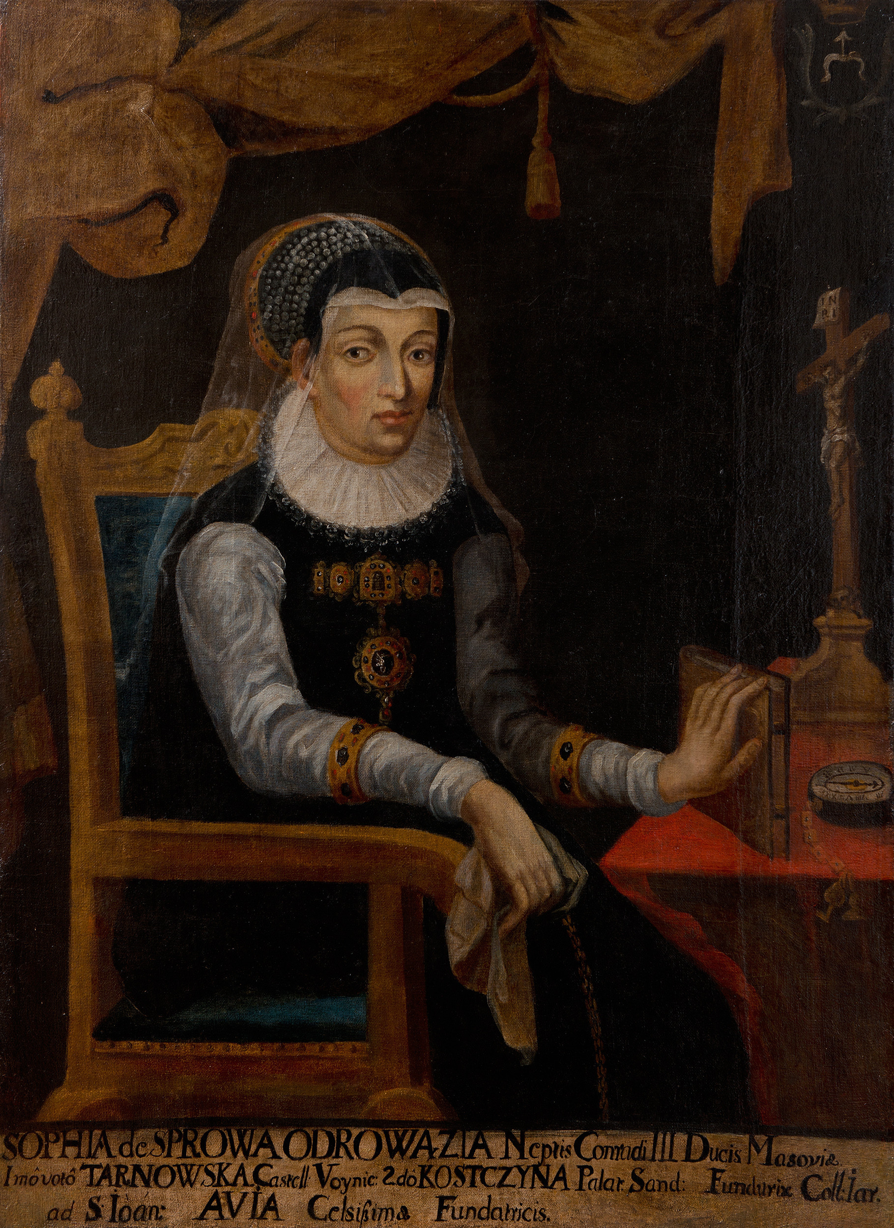 Przedstawiona na obrazie Zofia z Odrowążów 1o voto Tarnowska, 2o voto Kostkowa (zm. 1580) przyszła na świat jako córka Stanisława ze Sprowy Odrowąża, wojewody ruskiego i Anny księżny mazowieckiej. 9 listopada 1555 r. wojewodzianka Zofia Odrowążówna poślubiła swojego pierwszego męża, Jana Krzysztofa Tarnowskiego (1537-1567), kasztelana wojnickiego, starostę sandomierskiego i stryjskiego. Owdowiawszy, w 1574 r. powtórnie wyszła za mąż za Jana Kostkę (ok. 1529-1581), wojewodę sandomierskiego (a także: podskarbiego pruskiego i kasztelana gdańskiego). Była „dziedziczką olbrzymiej fortuny jarosławskiej na Rusi”, fundatorką kolegium jezuitów w Jarosławiu.