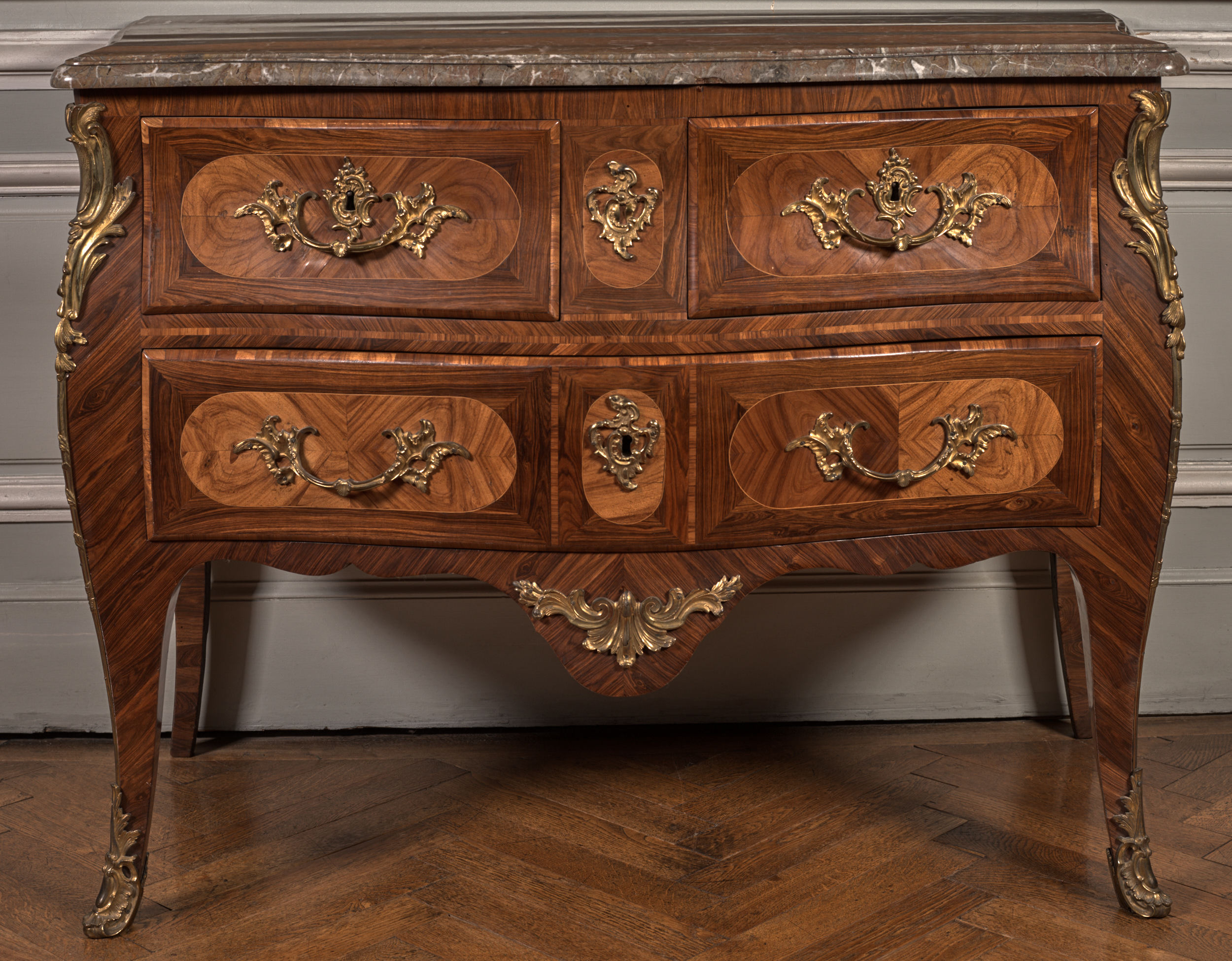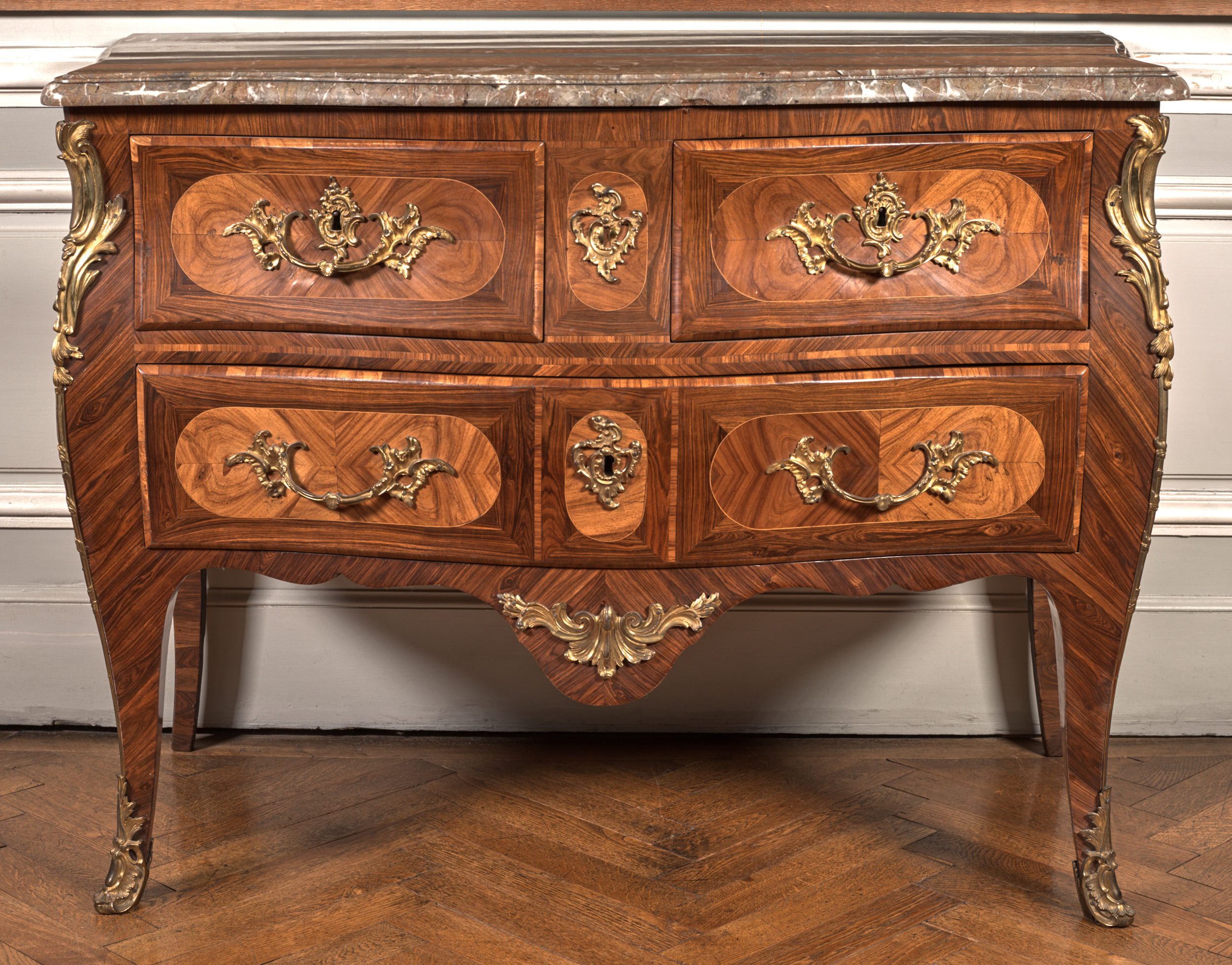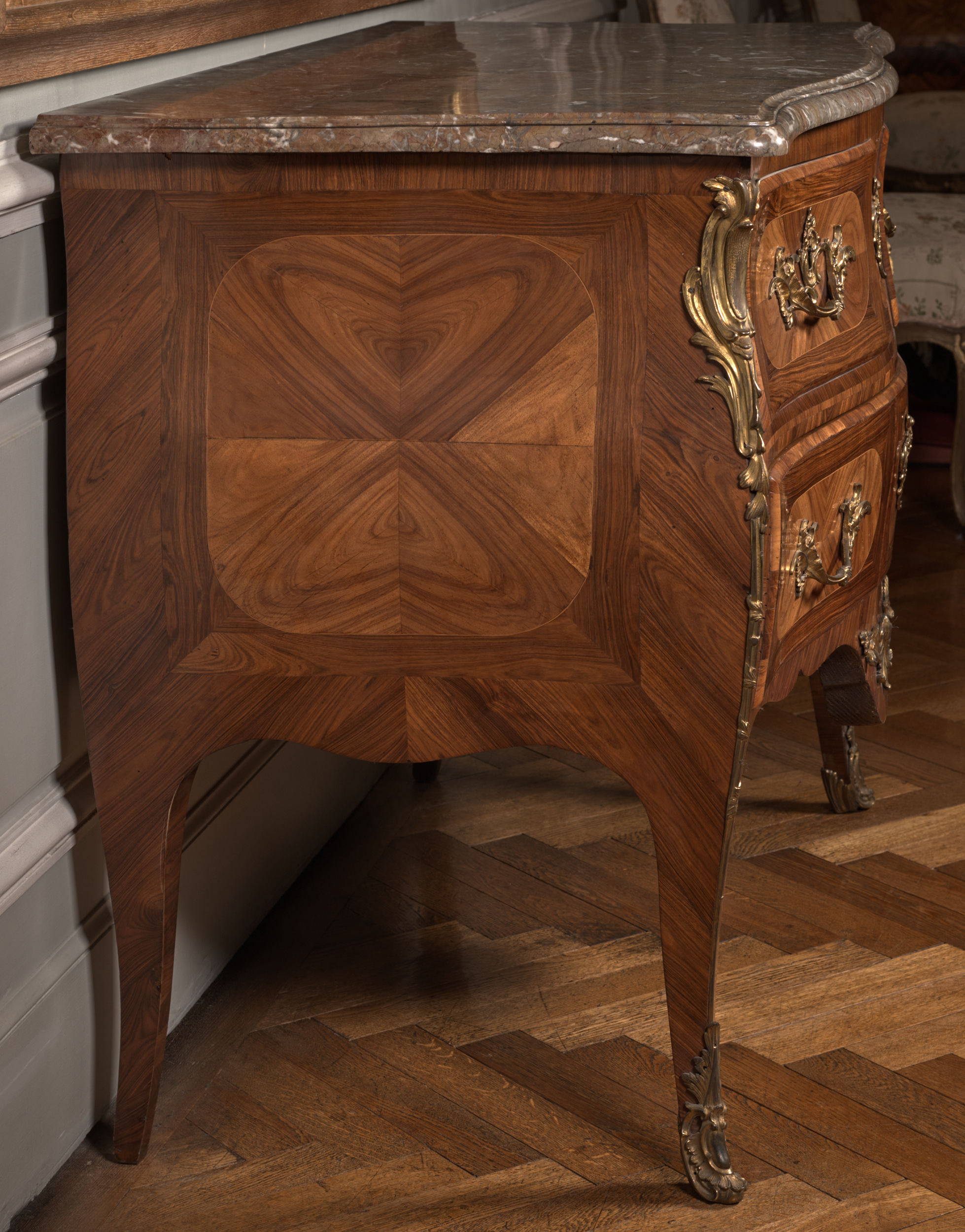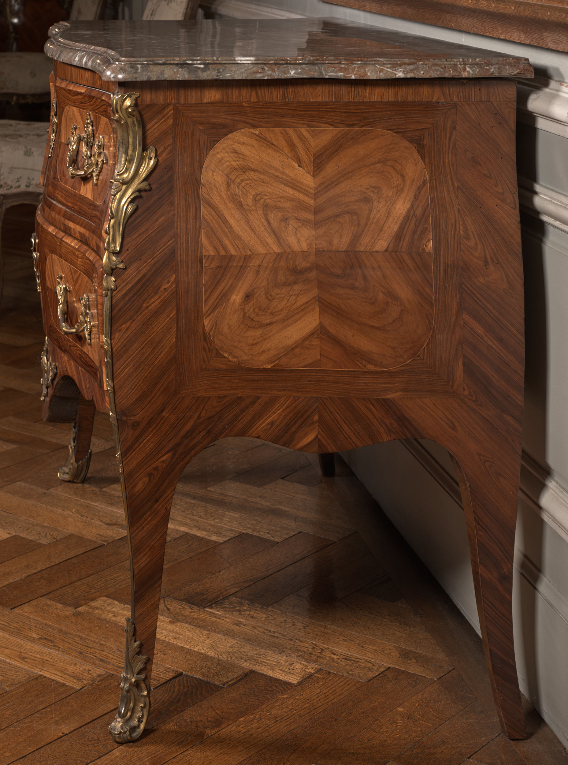 Komoda na smukłych nogach, z trzema szufladami w dwóch rzędach od czoła, jest rokokowym meblem francuskim. Wyróżniające się lżejszą budową komody spopularyzował w pierwszej połowie XVIII w. francuski ebenista Charles Cressent. Wprowadzona przez niego forma znalazła wielu naśladowców wśród mistrzów epoki Ludwika XV. Prezentowana komoda została wykonana i sygnowana przez paryskiego ebenistę Germain'a Landrin'a. Uprawnienia mistrzowskie uzyskał on 16 stycznie 1738 r. i był czynny zawodowo niemal do śmierci (ok. 1782-1785 r.). Jednak nie wszystkie wykonywane przez siebie dzieła sygnował swoim nazwiskiem. Dość długo pracował dla innych słynnych mistrzów, takich jak Denis Genty, Pierre Migeon czy urodzony w Niemczech, francuski królewski ebenista Jean-François Oeben (Johann Franz Oeben). Wykonując zlecenia pod ich nazwiskiem, Landrin zdobywał tajniki warsztatowe, przyswajał stosowane przez nich formy oraz motywy dekoracyjne. Landrin usamodzielnił się dopiero w 50. latach XVIII w. Prowadził warsztat w Paryżu, najpierw przy Rue Faubourg-Saint-Antoine, potem przy Rue de Charonne. Wykonywał zazwyczaj niewielkie meble w stylu Ludwika XV, przejściowym - tak zwanym stylu "transition" oraz Ludwika XVI. Jak wielu ówczesnych mistrzów zdobił swoje wyroby odlewami z brązu złoconego. Używał oklein z drzewa fiołokowego (rodzaj akacji), palisandru, amarantu. Zestawiał różne gatunki oklein w motyw kostki tworzącej szachownicę. Równie często stosował układ kopertowy uzyskując efekt "skrzydeł motyla", co widać na przykładzie prezentowanej komody.
