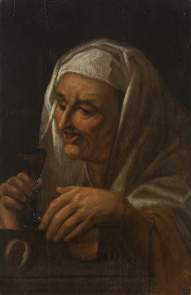 Starsza, zmęczona życiem kobieta spożywa posiłek. Jej pochyloną sylwetkę w chwiejnej równowadze utrzymuje lewa ręka, którą wspiera się na szklance. Prawą podnosi do ust kieliszek z ciemnego szkła. Na blacie widoczna jeszcze część owocu. Świadome zastosowanie światła, którym malarz muska pomarszczoną skórę i udrapowaną chustę staruszki nadają jego pracy kształt wyraźnie realistyczny. Malowana bez upiększeń, twarz poorana zmarszczkami, brak zębów i ziemista karnacja wywołują wrażenie dość przygnębiające, skłaniają do refleksji nad przemijaniem i nieuchronnością śmierci. Trzeba przyznać, że malarz dużą uwagę przywiązał do przejmującego scharakteryzowania jej fizjonomii. Być może nie jest to portret, a studium w zamierzeniu uniwersalne. W tle pobrzmiewają echa moralizatorskich kompozycji holenderskich i flamandzkich, zwłaszcza wobec faktu, iż kobieta uchwycona jest w trakcie raczenia się alkoholem. Stąd możliwość interpretacji w duchu przestrogi przed pijaństwem.