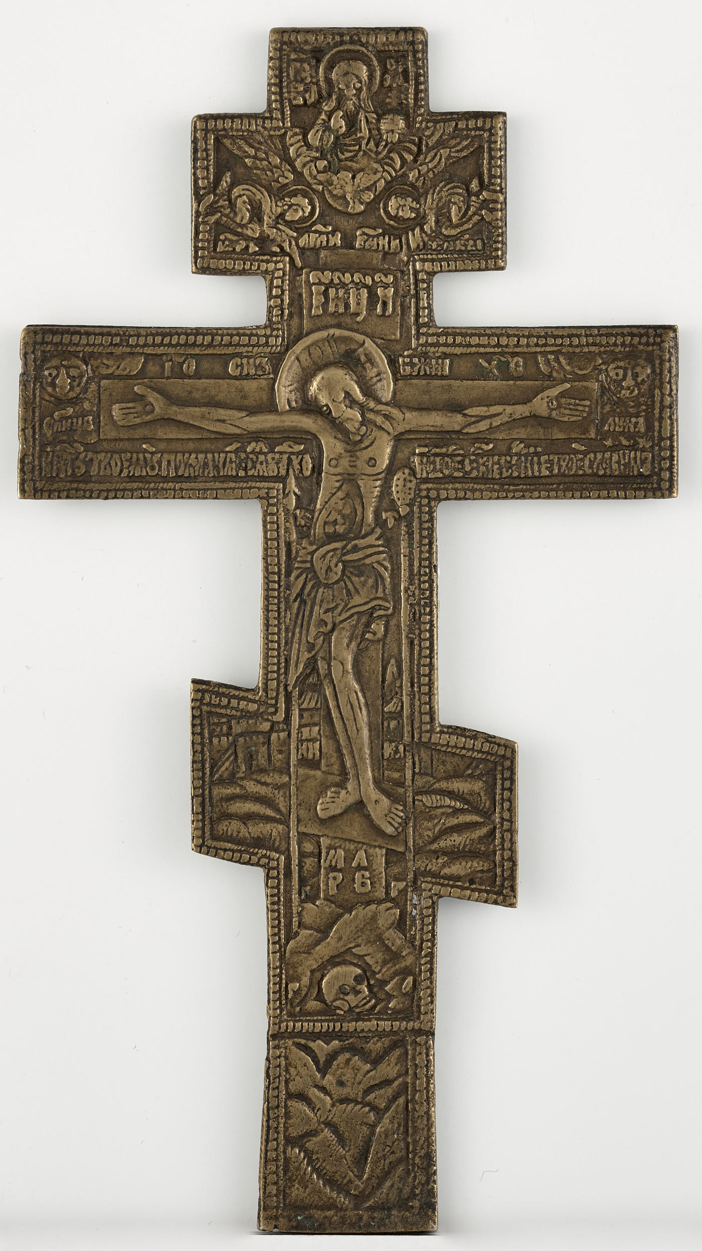 Na Rusi krzyż był jednym z najważniejszych przedmiotów chrześcijańskiego kultu. Za przykładem przywożonych z Bizancjum importów zaczęto wytwarzać rodzime wyroby, wśród których nie brakowało różnej wielkości, formy i przeznaczenia krzyży wykonanych ze stopów metali. Ich produkcję od końca XVII po XX w. zdominowali w Rosji i podnieśli na wysoki poziom staroobrzędowcy, prześladowani z powodu odrzucenia reformy liturgicznej wprowadzonej od połowy XVII w. Sylwetowa reliefowa ikona krzyża z wizerunkiem Ukrzyżowanego Chrystusa pozostawała jednym z najpopularniejszych wyrobów używanych zarówno przez staroobrzędowców, jak i przez prawosławnych wiernych doktrynie oficjalnej cerkwi (patrz S.12789MŁ – 12795MŁ; S.12869MŁ; S.12870MŁ; S.12872MŁ – 12876MŁ). Na Rusi utrwaliły się ośmiokończaste krzyże z trzema poprzecznymi ramionami (patrz S. 12875MŁ). Istotne w nich były nie tylko szczegóły przedstawienia, ale także towarzyszące im napisy (patrz S.12793MŁ). Na prezentowanym krzyżu warto zauważyć trzykrotną identyfikację osoby Zbawiciela. Na górnej belce krzyża nad głową Chrystusa skrót ІНЦИ oznacza wypisaną przez Piłata winę skazańca – Jezus Nazarejczyk Car (Król) Judejski. Nad środkową belką umieszczono skrót imienia Chrystusa ICXC oraz СНЬ БЖІЙ – Syn Boży. Nieprzypadkowe jest umieszczenie ciał niebieskich przy dłoniach Zbawiciela: po prawicy słońca - СЛНЦЕ, a po lewicy księżyca - ЛУНА, odczytywanych jako ilustracja ewangelicznego tekstu (Mt. 27,45), a także jako symbole ciągłości Eklezji (Kościóła) i Synagogi – Starego i Nowego Przymierza dopełnionego przez krzyżową ofiarę. Wśród szczegółów towarzyszących przedstawieniom Ukrzyżowania należą narzędzia męki, zaliczają się do nich włócznia, którą przebito bok Zbawiciela – oznaczona literą K jak „kopije” i trzcina z gąbką, na której podano ocet – oznaczona literą T jak „trost” (Mt. 27,48; Mk 15, 36: J 19, 29-30, 34-35).
