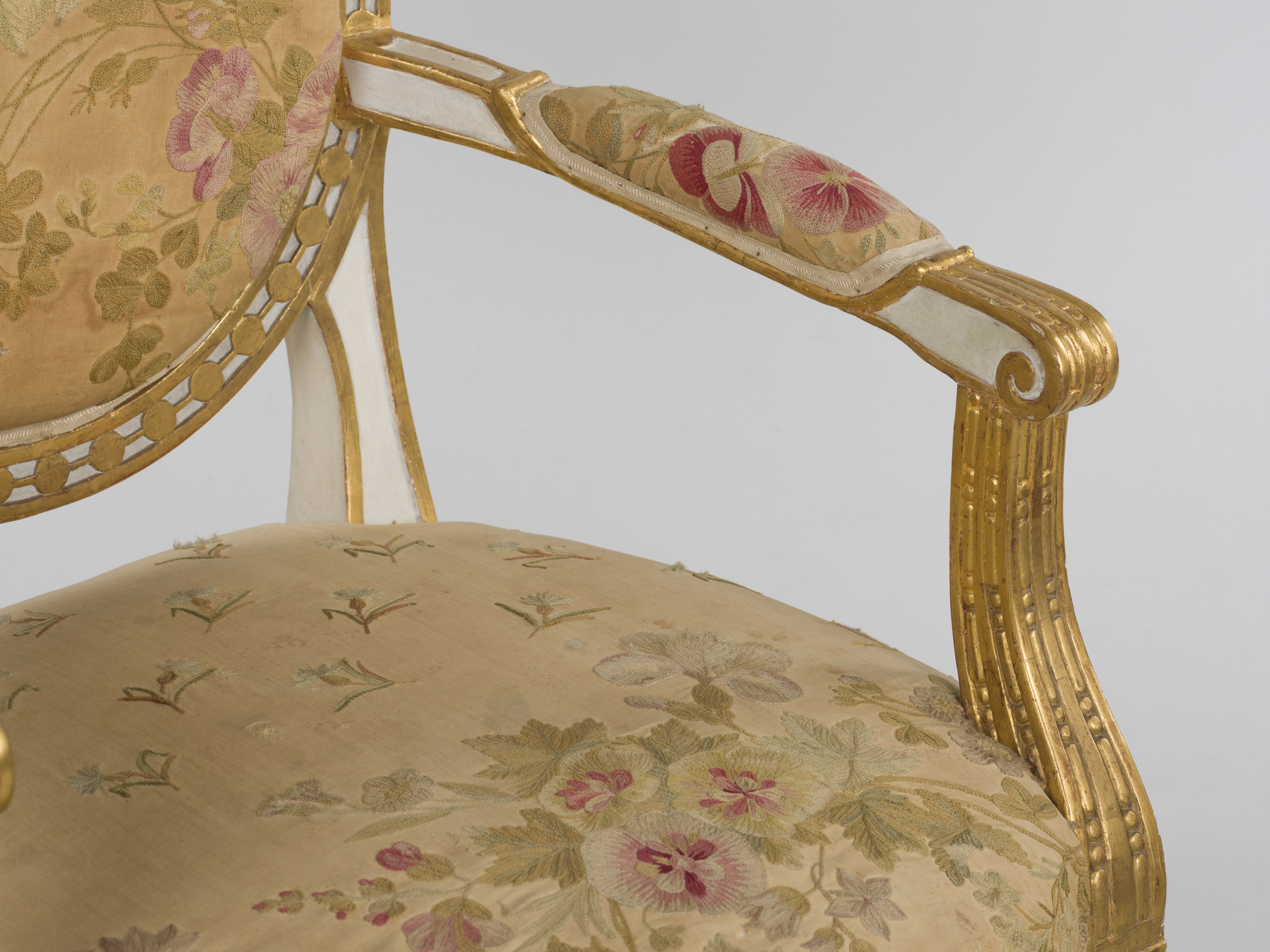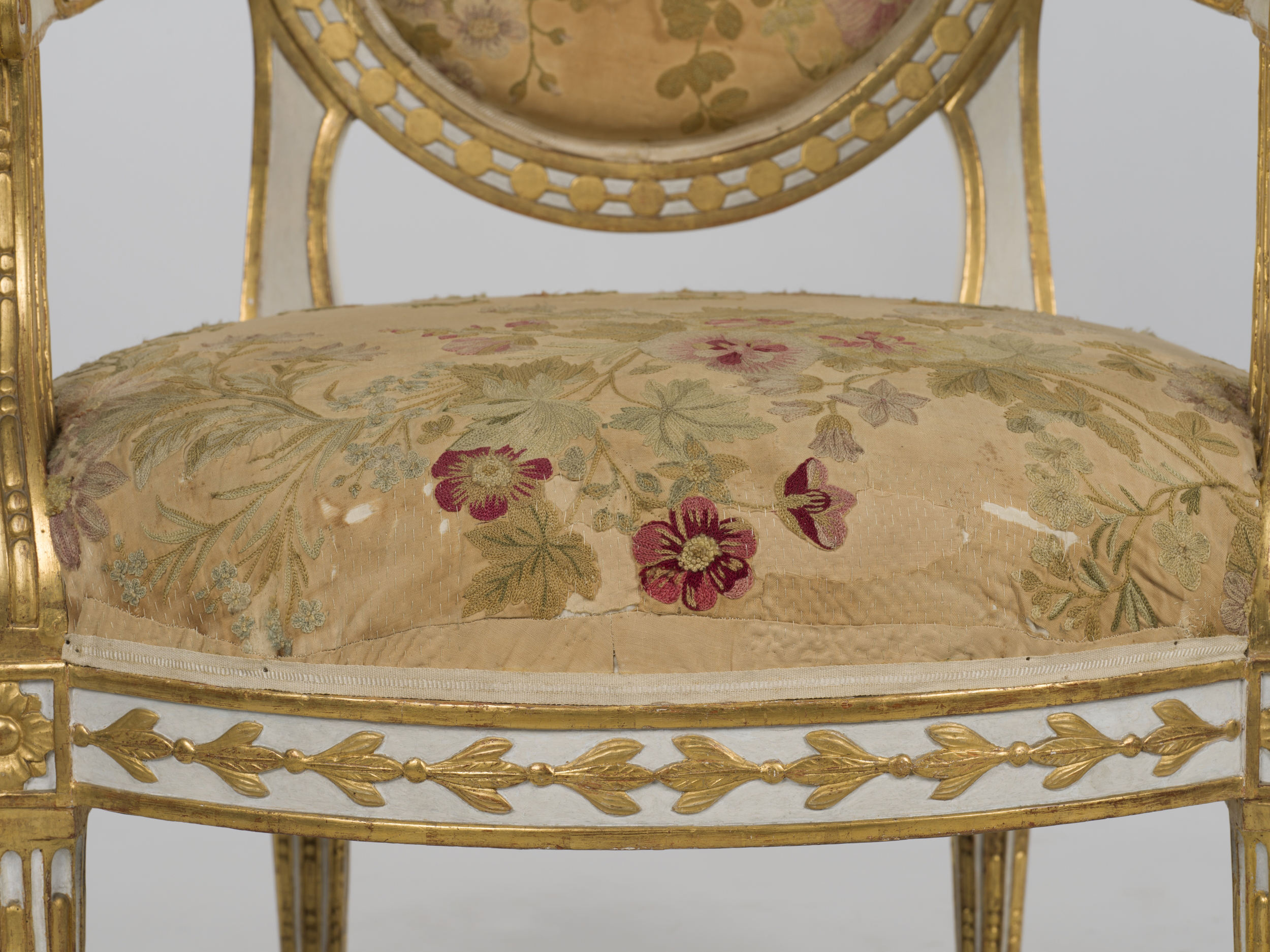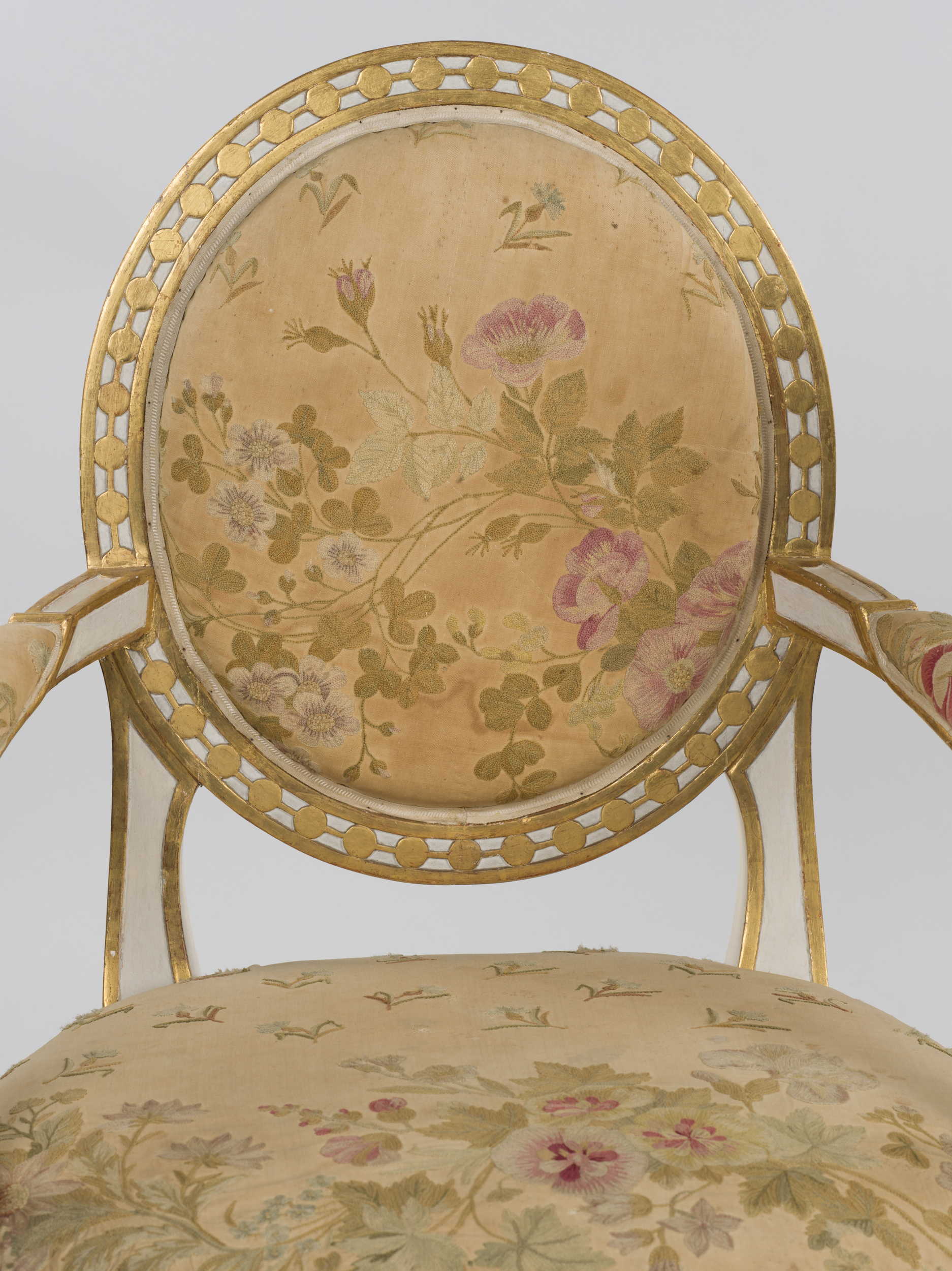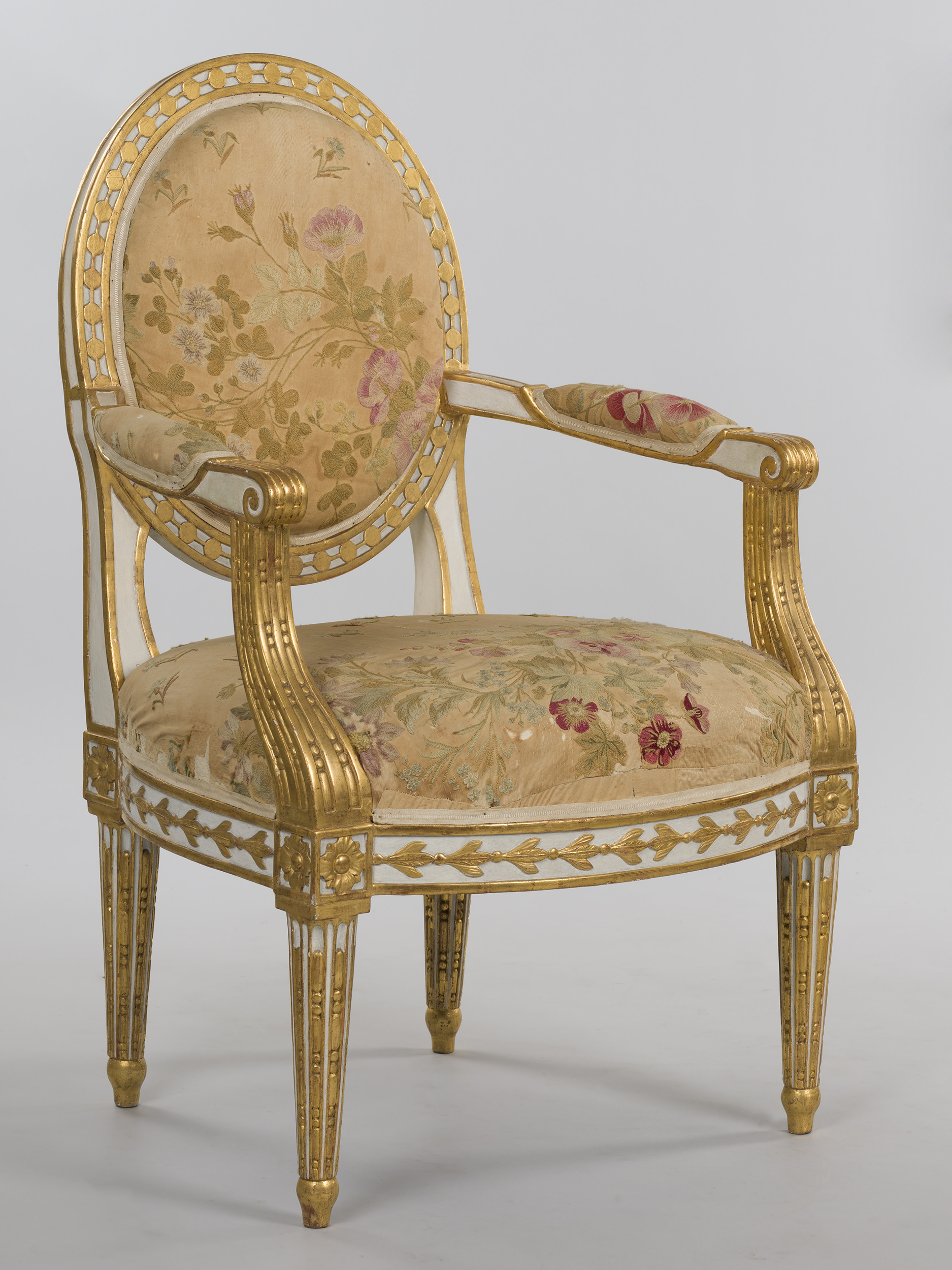 Klasyczny fotel typu „foteuil medaillon” na czterech zwężających się ku dołowi nóżkach. Poręcze częściowo tapicerowane zakończone niewielką wolutą. Ich lekko wygięte podparcia stanowią jedność konstrukcyjną z przednimi nogami. Powierzchnia polichromowana biało stanowi tło dla rzeźbionych i złoconych dekoracji. W oparciu pleców motyw nieco rozsuniętych, połączonych perełek; na bokach i przodzie kargi kampanule, w kanelowanych oparciach poręczy i nogach motyw astragalu. Oparcie pleców, siedzisko i poręcze tapicerowane, pokryte współczesną tkaniną.