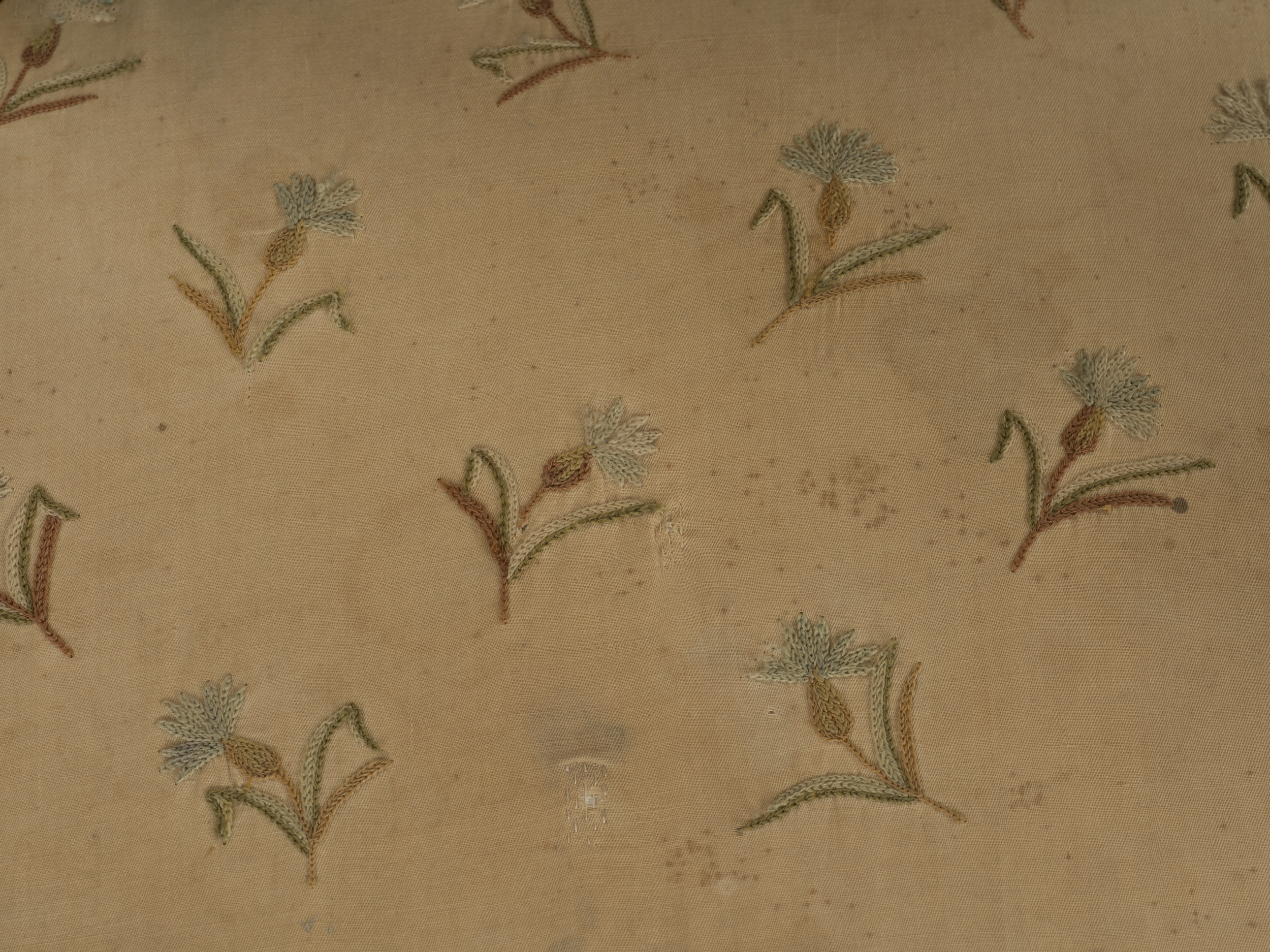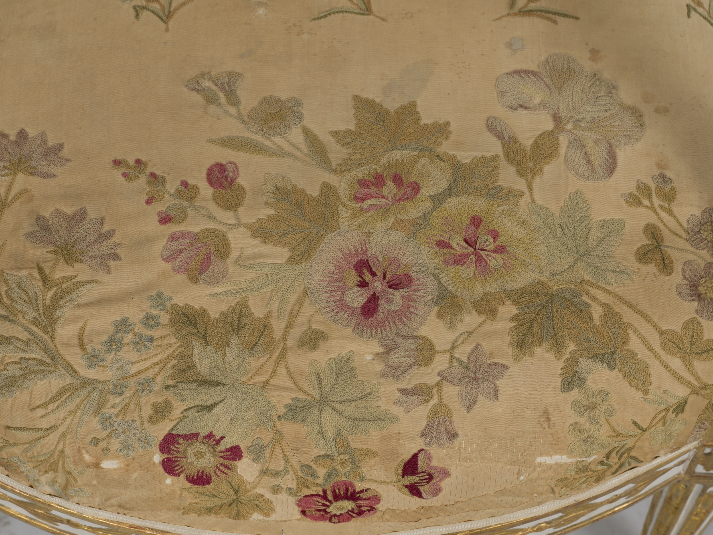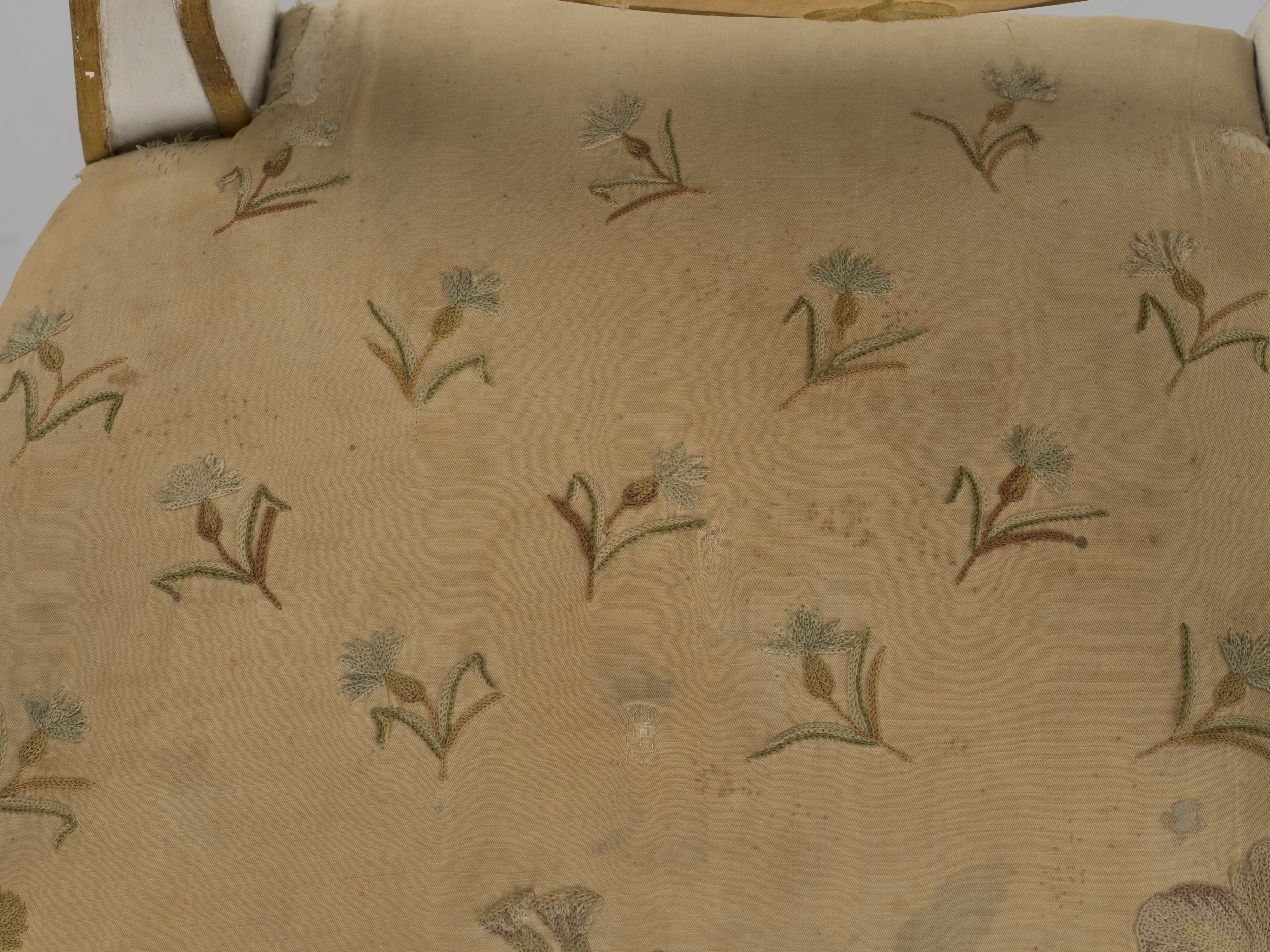 Fotel należy do kompletu mebli stanowiących wyposażenie pokoi nowo wybudowanego przez ks. Izabelę Lubomirską (1736-1816) w 1780 r. apartamentu - Łazienki pałacu Wilanowskiego. W skład zachowanego kompletu wchodzi łoże, 2 kanapy, szezlong, 11 foteli i 2 ekrany. Inwentarz z 1793 r. lokalizuje fotelik w Pokoju Sypialnym Łazienkowym i był wtedy pokryty materią w kwiaty kolorowe w centralnych polach otoczonych białym pekinem. podobnie jak pozostałe 3 fotele i kanapa z tego garnituru oraz do białe, pekinowe obicia łoża i ścian Sypialni obszytych zieloną, jedwabną kampanką. Poduszki tapicerki fotela również obszyte były „jedwabną kampanką”. W kolejnych latach tkaninę obicia fotela zmieniano, za każdym razem dostosowując dekorację do obicia ścian; na tkaniną lila, białą haftowaną w barwne, delikatne kwiaty, tkaniną w paski zielone i kwieciste, czy białą haftowaną w delikatne, barwne kwiaty.