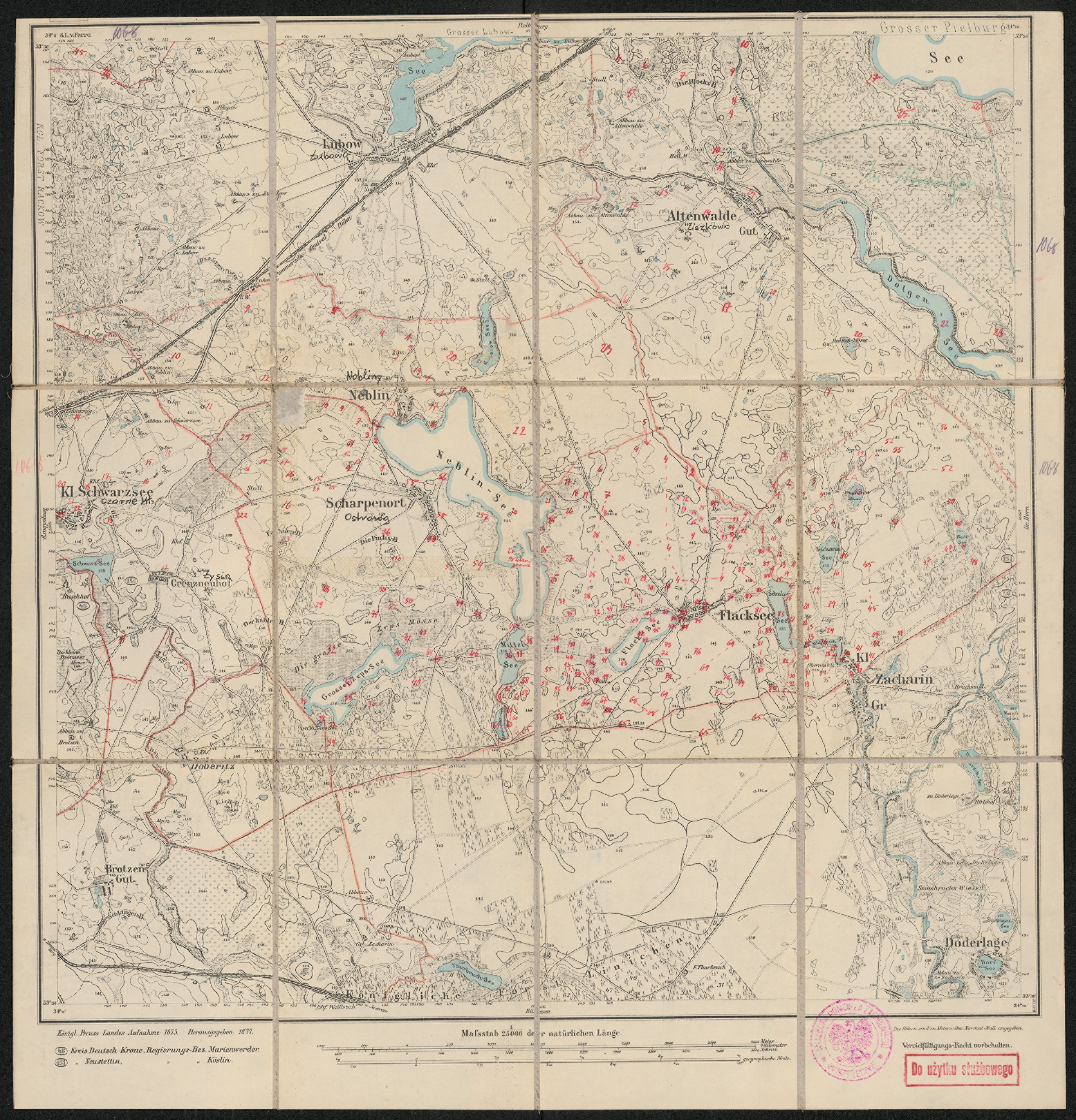 Mapę 1068 Neblin II opracowano w 1875, a wydano w 1877 roku. Obejmuje obszar w pobliżu miejscowości Neblin, Kreis Neustettin, Reg. Bez. Köslin, Prov. Pommern, dziś Nobliny, pow. szczecinecki, woj. zachodniopomorskie, Polska. Jest jednym z dwóch zachowanych egzemplarzy arkusza przedwojennej mapy topograficznej oznaczonego godłem 1068, zawierającym dane o lokalizacji obiektów i ich nazw w zasobie archiwalnym Flurnamen Sammlung. Na drukowanej mapie ręcznie naniesiono warstwę z numeracją obiektów fizjograficznych odnoszących się do miejscowości: Rackow, dziś Rakowo; Altenwalde, dziś Liszkowo; Neblin; Kl. Schwarzsee, dziś Czarne Małe; Scharpenort, dziś Ostroróg; Flacksee, dziś Jeziorna; Gr., Kl. Zacharin, dziś Czochryń.