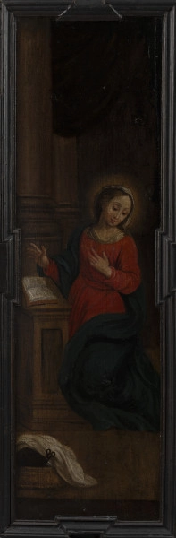 Marię przedstawiono na lewej tablicy w czerwonej sukni i niebiesko-zielonym płaszczu, z narzuconą na głowę białą chustą, którą okala świetlista aureola. Postać Matki Bożej klęczy na klęczniku z pulpitem, na którym leży otwarta księga. Scena rozgrywa się w ciemnym pomieszczeniu, w głębi którego widać dwie kolumny, między którymi zwiesza się podpięta kotara. Maria odchyla się lekko w tył, kierując pochyloną głowę w lewo, a zatem w stronę wyobrażonego na drugim obrazie Archanioła Gabriela, który zwiastuje jej nowinę o narodzinach Syna Bożego. Ze spuszczonymi oczami, ręką przyłożoną do piersi i drugą uniesioną nad otwartą księgą zdaje się w pokorze przyjmować słowa posłannika. U jej stóp leży koszyk z przyborami do szycia – białą tkaniną i nożycami, co jest nawiązaniem do chrześcijańskich apokryfów, według których Archanioł nawiedził ją, gdy szyła zasłonę do świątyni. Natomiast motyw otwartej księgi symbolizującej mądrość i gotowość Marii na przyjęcie Syna Bożego, miał swoje źródło w Medytacji Pseudo-Bonawentury, ważnego dla późnego średniowiecza tekstu mistycznego, powstałego w kręgu nauki franciszkanów i przypisanego w późniejszym czasie św. Bonawenturze. Tamże, w rozdziale o wcieleniu Chrystusa znajdują się cytaty z Księgi Izajasza dotyczące zesłania Baranka i zstąpienia Boga, co przyczyniło się do rozpowszechnienia przedstawień Marii, która w trakcie Zwiastowania czyta Księgę Izajasza. Ponadto, oszczędna kompozycja obrazu, z mocnym akcentem kolumn w tle, znajduje wiele analogii w malarstwie włoskim i italianizującym 2. połowy XVI wieku, przywołując na myśl chociażby obrazy Tycjana.