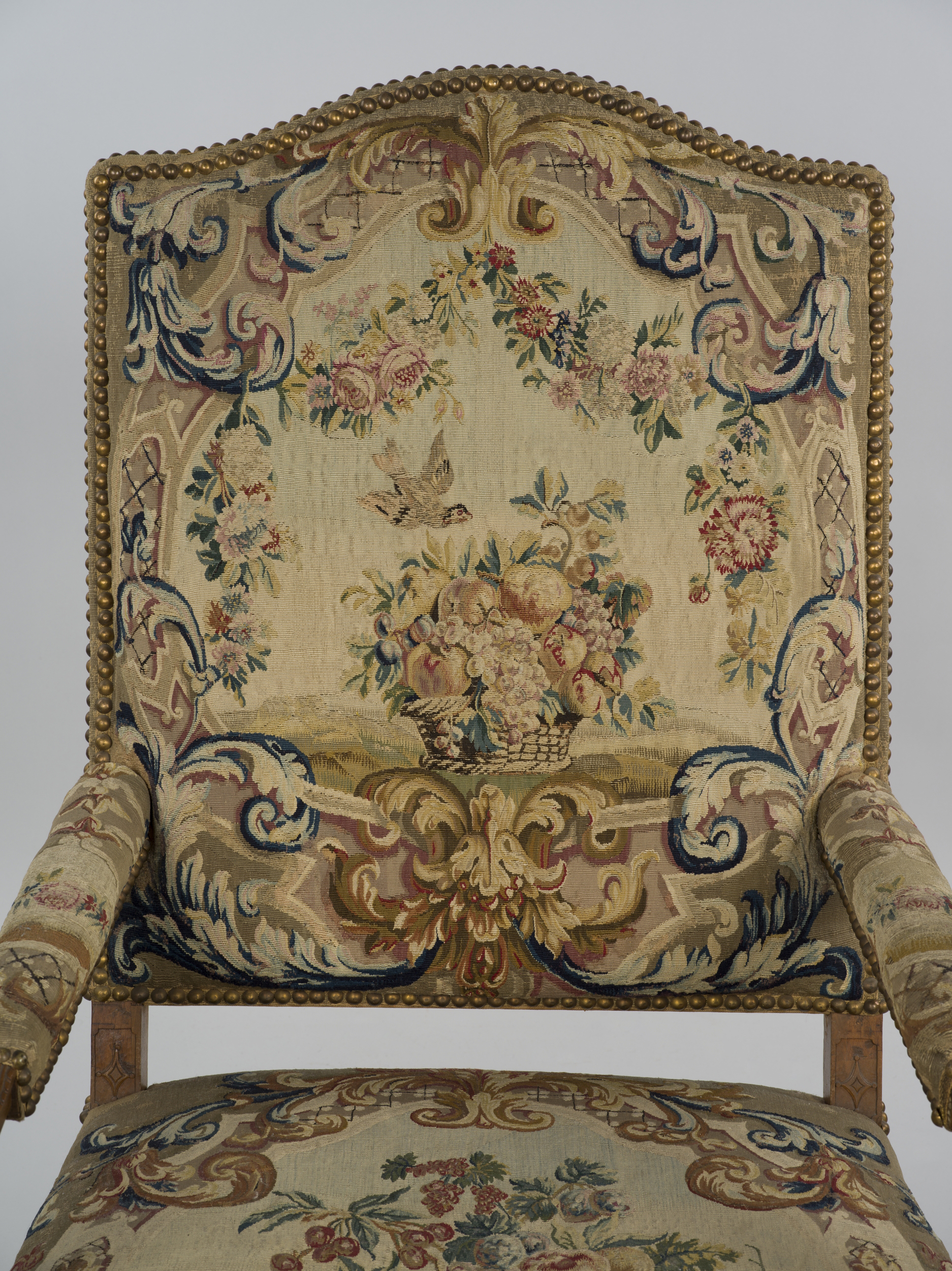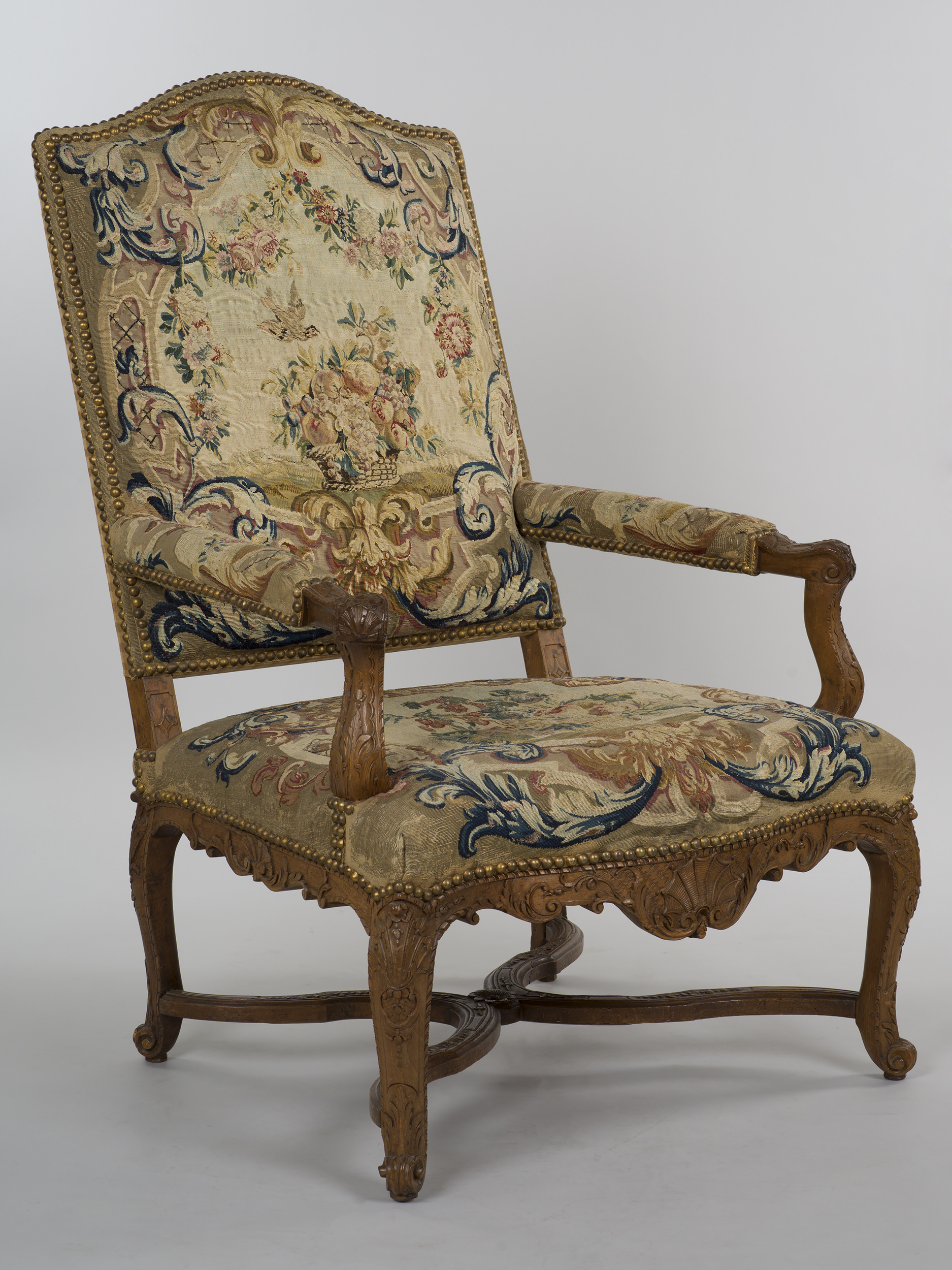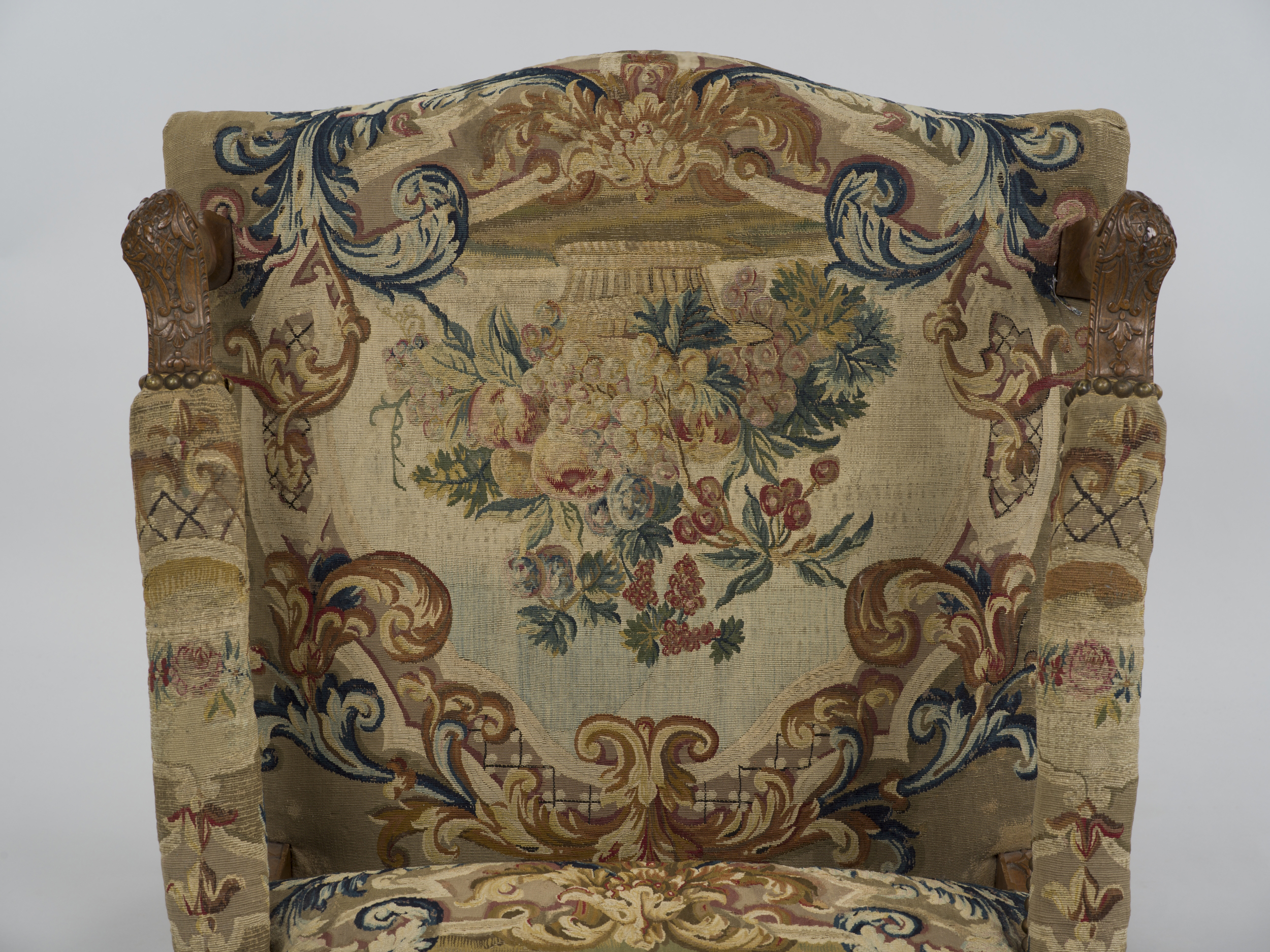 Fotel należy do jednego z trzech w zbiorach wilanowskich kompletów francuskich mebli w stylu regencyjnym, krytych gobelinem o wysokiej wartości artystycznej, składającego się pierwotnie z kanapy i dwunastu foteli. Reprezentuje typ à la raine, - oparcie pleców oddzielone od siedziska, zachowało jeszcze barokowy kształt prostokąta o lekko sfalowanej górnej krawędzi. Falista forma pozostałych elementów zaciera linie konstrukcyjne mebla; zapowiada nadchodzące rokoko. Siedzisko fotela wsparte jest na czterech wygiętych nóżkach typu cabriole; widoczne części drewnianej konstrukcji w naturalnym kolorze orzecha (rama oskrzynia, nóżki i ich krzyżowe wiązania, podpory poręczy) pokrywa rzeźba z motywami regencyjnymi: stylizowanymi zwojami akantu, pióropuszami, kampanullami oraz muszlami akcentującymi podziały kompozycyjne nadając mu walor lekkości. Podkreśla go wielobarwna tkanina gobelinowa pokrywająca oparcie pleców, poręcze i siedzisko, przedstawiająca kompozycje kartuszowe kwiatów, liści akantu i kratki regencyjnej. W części centralnej oparcia siedziska kosze z owocami nad którym fruwa ptak, podobnie na siedzisku. Rzędy główek dekoracyjnych ćwieków mocujących tkaninę do konstrukcji drewnianej dają dyskretne złote refleksy. Komplet mebli pod koniec XVIII w. stanowił wyposażenie Apartamentów ks. Izabeli Lubomirskiej, później dekorowały również Apartamenty Królewskie. Obecnie z kompletu zachowały się tylko trzy fotele (Wil.905/1, Wil.905/2, Wil.905/3 )
