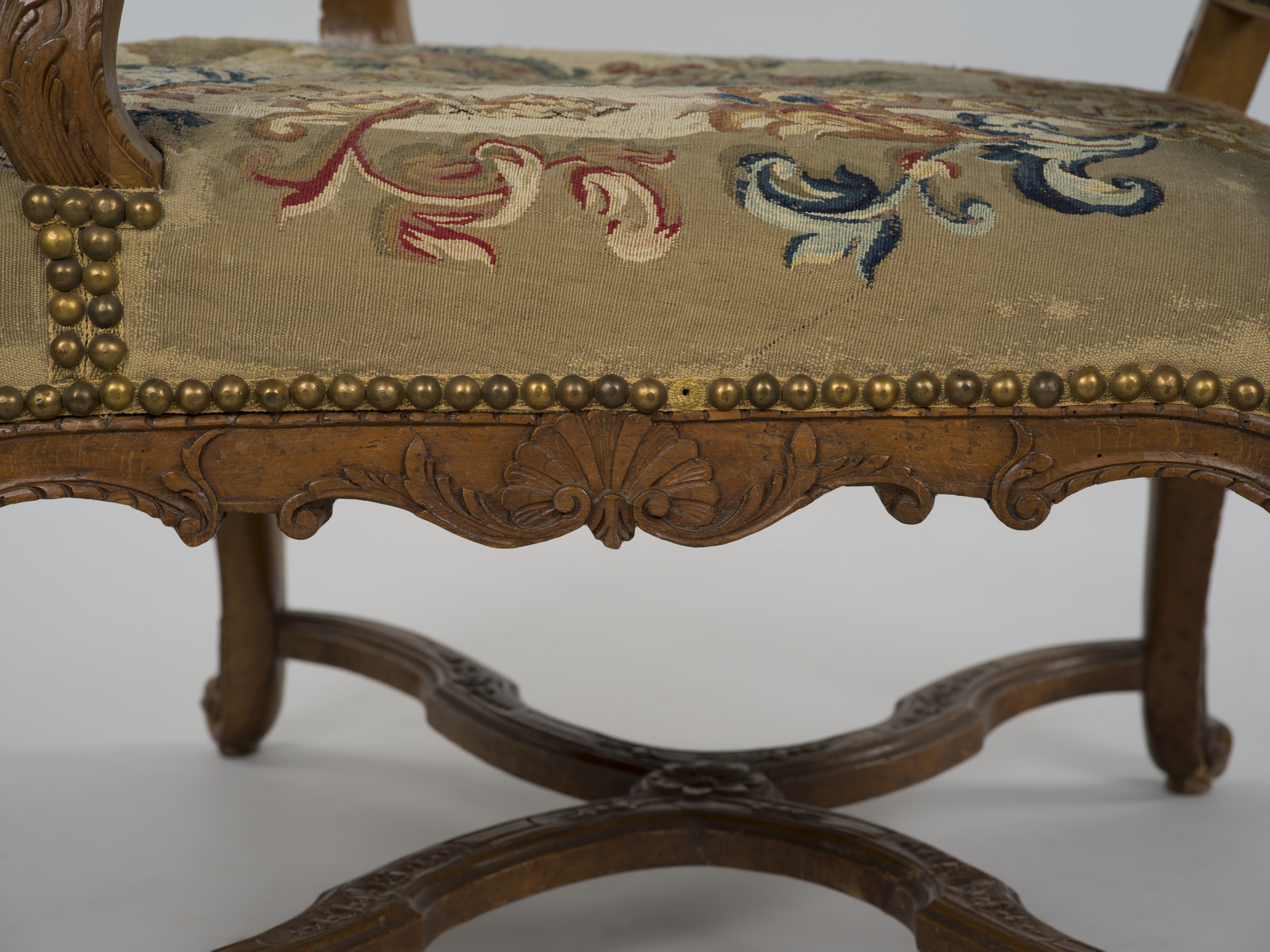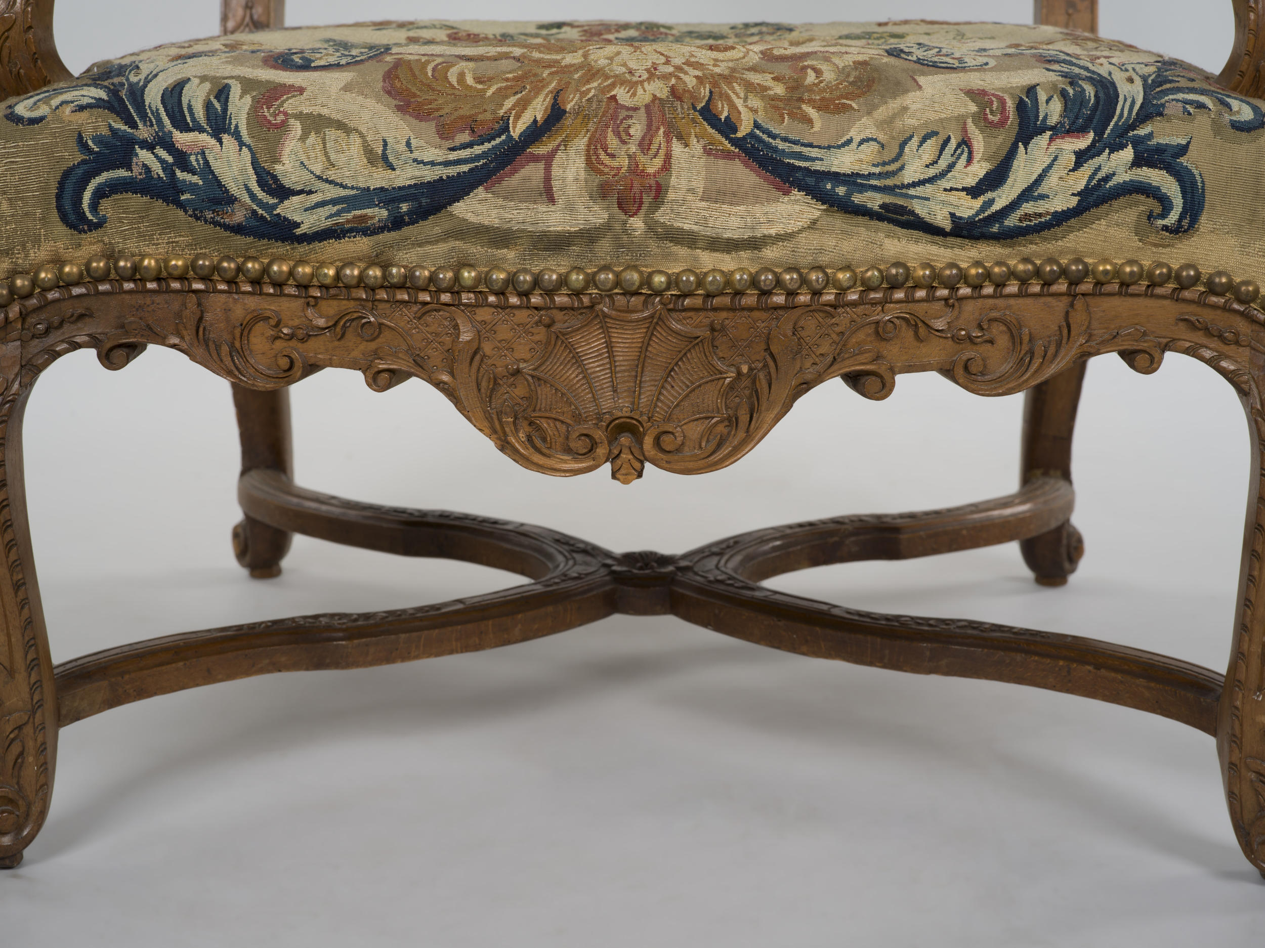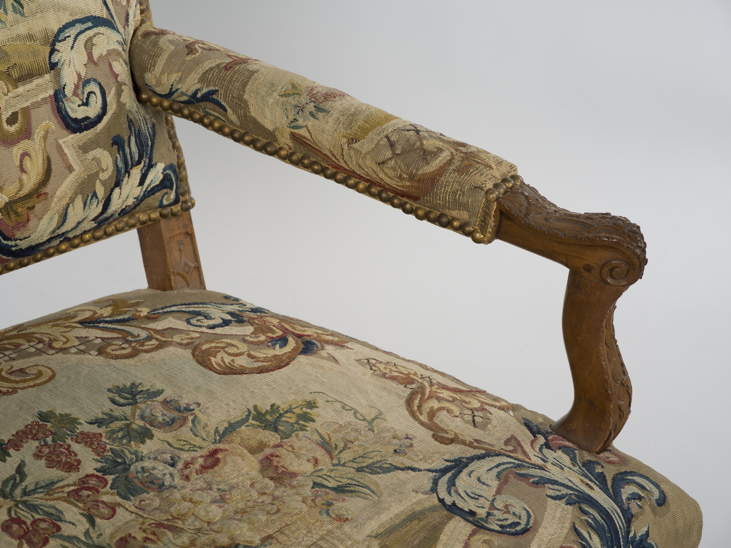 Fotel należy do jednego z trzech w zbiorach wilanowskich kompletów francuskich mebli w stylu regencyjnym, krytych gobelinem o wysokiej wartości artystycznej, składającego się pierwotnie z kanapy i dwunastu foteli. Reprezentuje typ à la raine, - oparcie pleców oddzielone od siedziska, zachowało jeszcze barokowy kształt prostokąta o lekko sfalowanej górnej krawędzi. Falista forma pozostałych elementów zaciera linie konstrukcyjne mebla; zapowiada nadchodzące rokoko. Siedzisko fotela wsparte jest na czterech wygiętych nóżkach typu cabriole; widoczne części drewnianej konstrukcji w naturalnym kolorze orzecha (rama oskrzynia, nóżki i ich krzyżowe wiązania, podpory poręczy) pokrywa rzeźba z motywami regencyjnymi: stylizowanymi zwojami akantu, pióropuszami, kampanullami oraz muszlami akcentującymi podziały kompozycyjne nadając mu walor lekkości. Podkreśla go wielobarwna tkanina gobelinowa pokrywająca oparcie pleców, poręcze i siedzisko, przedstawiająca kompozycje kartuszowe kwiatów, liści akantu i kratki regencyjnej. W części centralnej oparcia siedziska kosze z owocami nad którym fruwa ptak, podobnie na siedzisku. Rzędy główek dekoracyjnych ćwieków mocujących tkaninę do konstrukcji drewnianej dają dyskretne złote refleksy. Komplet mebli pod koniec XVIII w. stanowił wyposażenie Apartamentów ks. Izabeli Lubomirskiej, później dekorowały również Apartamenty Królewskie. Obecnie z kompletu zachowały się tylko trzy fotele (Wil.905/1, Wil.905/2, Wil.905/3 )