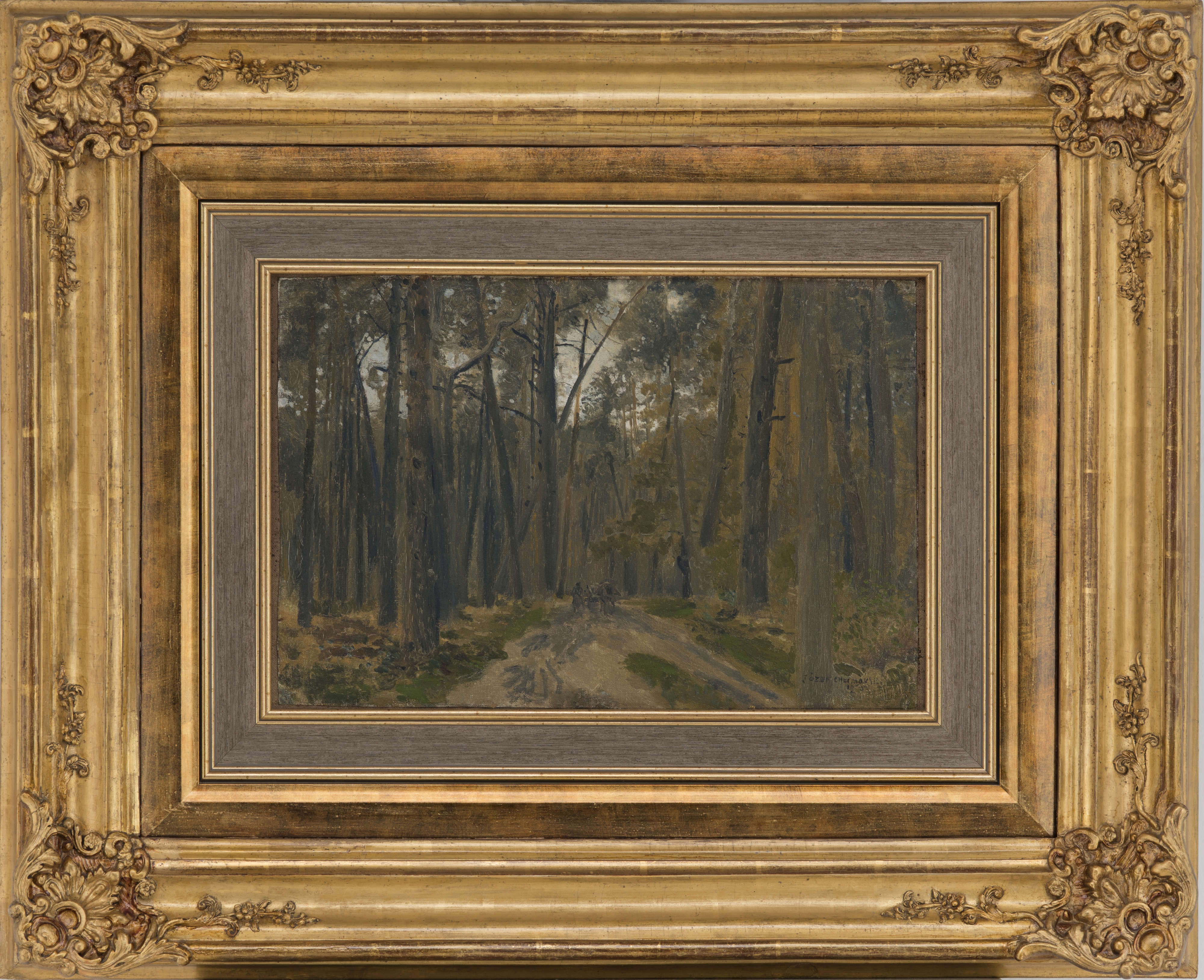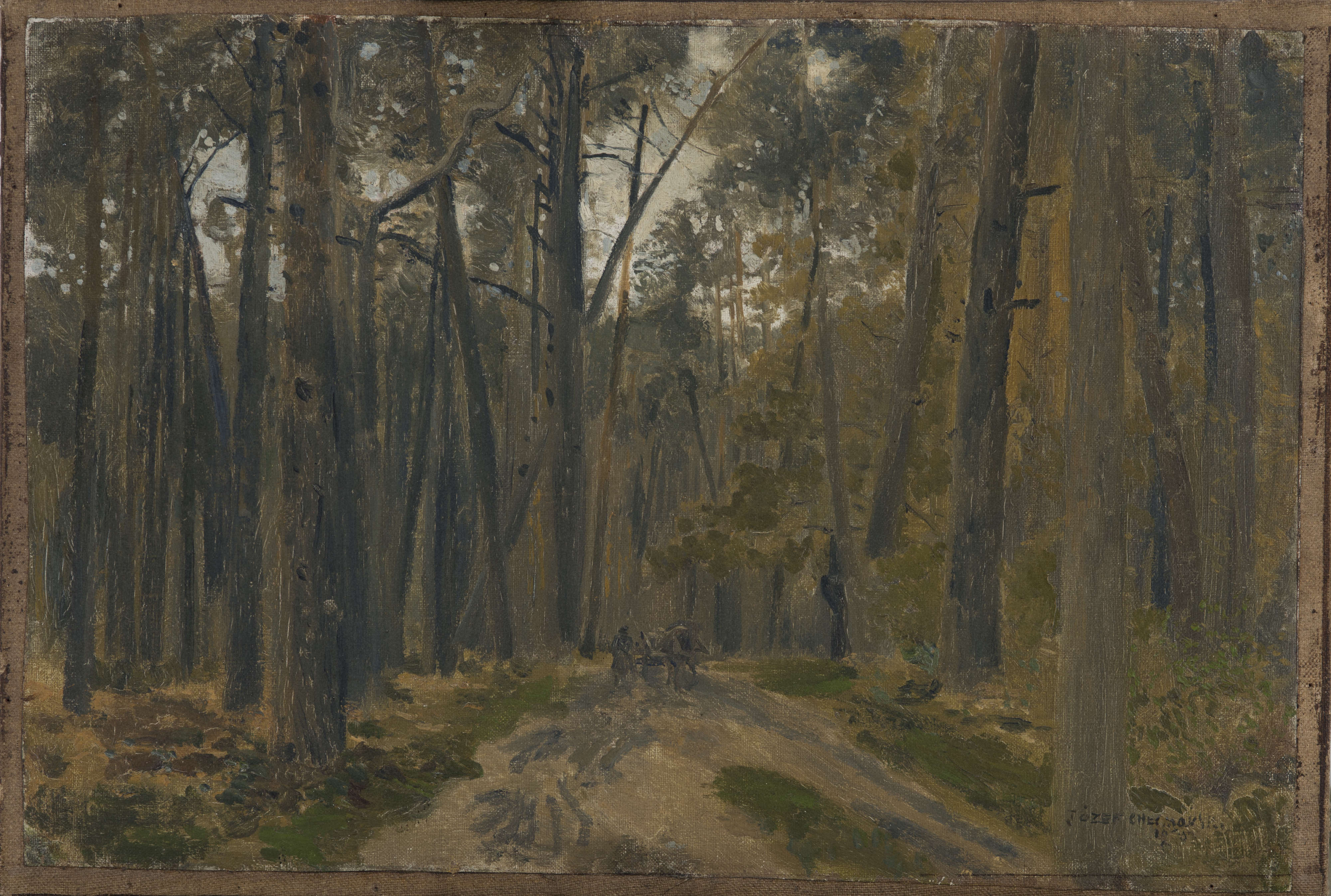 Scena Droga w lesie pozornie wyraża tendencje przeciwne. Wyrasta z zainteresowania twórczością barbizończyków i malarstwem powstającym w plenerze. Pokazana na osi droga oddala się w ujęciu perspektywicznym, z dwóch stron ujęta potężnymi konarami drzew. W oddali w centrum niewyraźnie zostały zarysowane zaprzęgi końskie, harmonijnie wtopione w krajobraz. Późny obraz Chełmońskiego przyjmuje postać szkicu, impresyjnie wydobywanego krajobrazu rozwibrowanego rozproszonym światłem. Obraz oddaje głębokie przemiany w twórczości artysty – od odtwarzania szczegółu do eksponowania wrażenia.