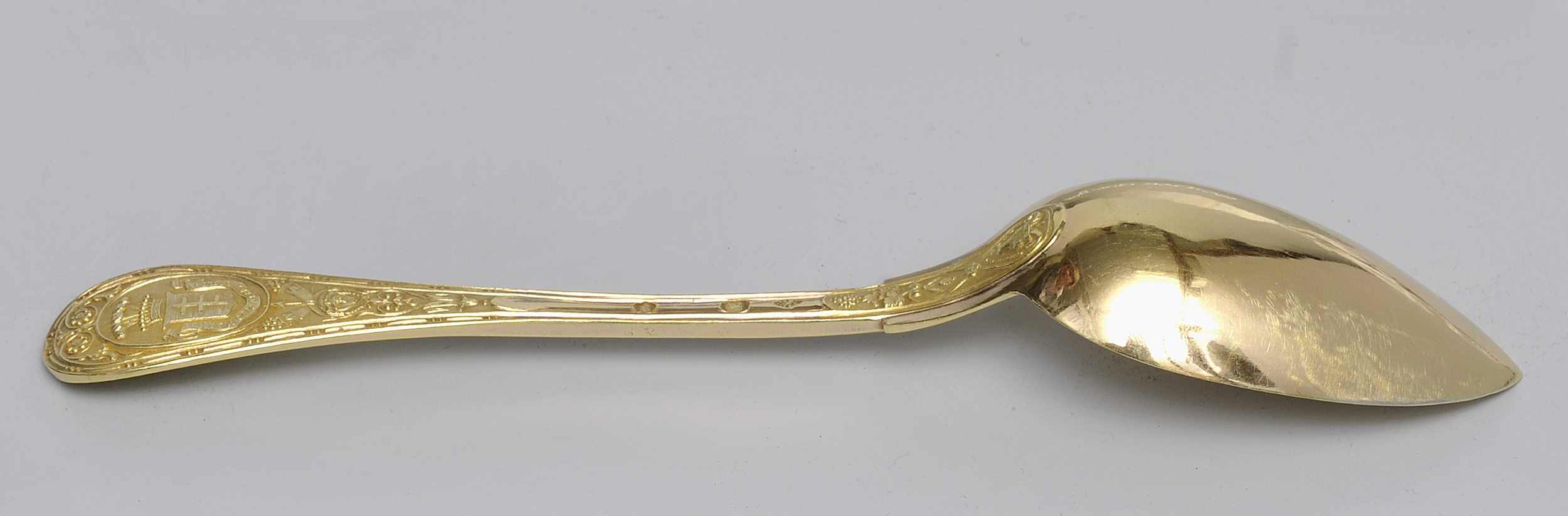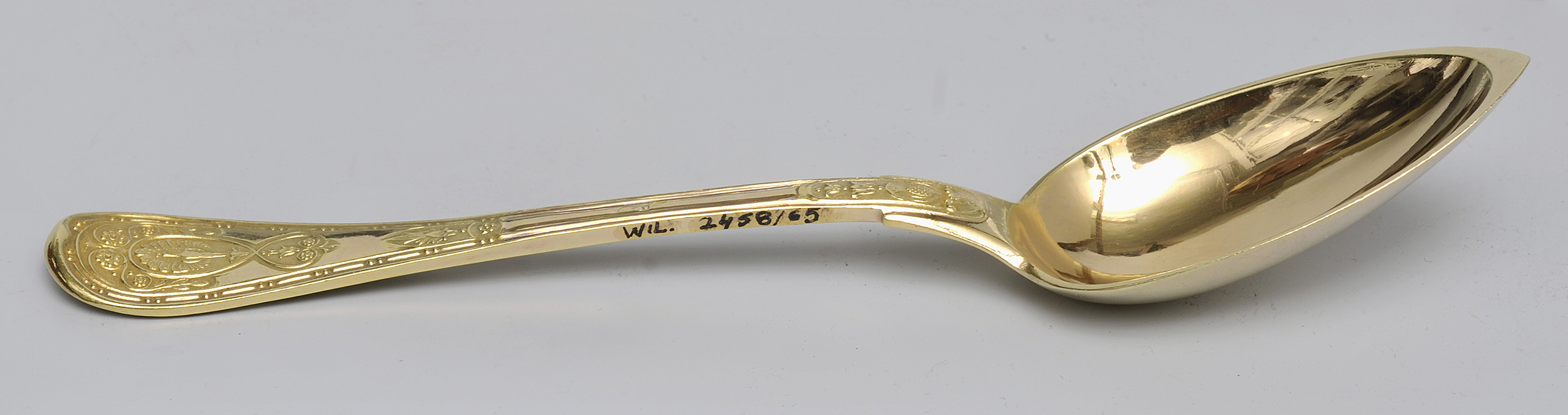 Łyżka deserowa o wydłużonym owalnym czerpaku jest jedną z siedemdziesięciu dwóch łyżek zachowanych w wilanowskiej kolekcji.