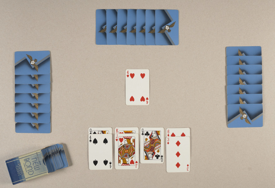 Pierwsza z dwóch talii kart do gry będących pamiątką Henryka Roznetala z czasów służby w Royal Air Force. Karty do gry produkowane przez firmę Universal Playing Card Co Ltd, Leeds and London były na wyposażeniu żołnierzy brytyjskich różnych specjalności walczących na frontach II wojny światowej. Na przykładzie talii znajdujących się zbiorach licznych muzeów (np. Imperial War Muzeum w Londynie) można zauważyć, że w zależności od pełnionej służby odwrocie kart mogło różnić się od siebie. Tak, karty przydzielane lotnikom były ozdabiane logiem Royal Air Force, a na kartach dedykowanych oddziałom wojsk pancernych z (Royal Tank Regiment) najczęściej widniał czołg i logo formacji. Talia zawiera standardowe 53 prostokątne karty wykonane z powlekanego papieru (w kolorach: trefl, karo, kier i pik), które umieszczone zostały w prostokątnym opakowaniu. Zarówno opakowanie, jak i same karty zdobi kolorowy druk z przewagą odcieni koloru niebieskiego. Awers opakowania jest ciemnogranatowy u dołu. Kolor stopniowo przechodzi w coraz jaśniejsze tony (gradient) ku górze. Na opakowaniu widnieje napis „THE | NEW | BOND| FABROC FINISH | PLAYING CARDS”. Czcionka, którą zostało wykonane liternictwo różni się dla każdej z jego części. Wszystkie litery są jednak w jednym kolorze -granatowym. Wzdłuż dłuższych krawędzi frontowego pola biegnie dodatkowo ozdobna linia w dwóch kolorach. W ciemniejszej części linia jest najjaśniejszym tonie (od dołu, poniżej płowy wys.) , w jaśniejszej w najciemniejszym. Po bokach opakowania umieszczona została pełna nazwa producenta „Universal Playing Card Co Ltd, Leeds | and London” w dwóch kolorach (najjaśniejszym odcieniem na ciemnym tle i najciemniejszym na jasnym). Po stronie verso opakowania przyklejona została jedna z kart (jeden z 2 jokerów). Tym samym, wewnątrz opakowania zjadają się 53 karty. Karta przyklejona jest do opakowania stroną recto. To znaczy, że widzimy jej ozdobne odwrocie. Odwrocie każdej z kart jest w dwóch odcieniach koloru niebieskiego (ciemniejszym i jaśniejszym). Po środku umieszczony został emblemat Royal Airf force (wieniec laurowy z napisałem RAF w centralnej części, ze skrzydłami po bokach oraz koroną króla Jerzego VI na górze). Granica dwóch odcieni przechodzi przez środek, wzdłuż odwrocie każdej z kart. Jest nieregularna, układa się w geometryczny wzór linii „złamanych” pod kątem 90 stopni. Krawędzi linii zostały dodatkowo ozdobnie złotymi liniami, czyniąc cały zostaw niezwykle efektownym wizualnie. Od strony recto figury znajdujące się talii są zestandaryzowane. Nie posiadają żadnych wojskowych emblematów, ani dodatkowych zdobień.