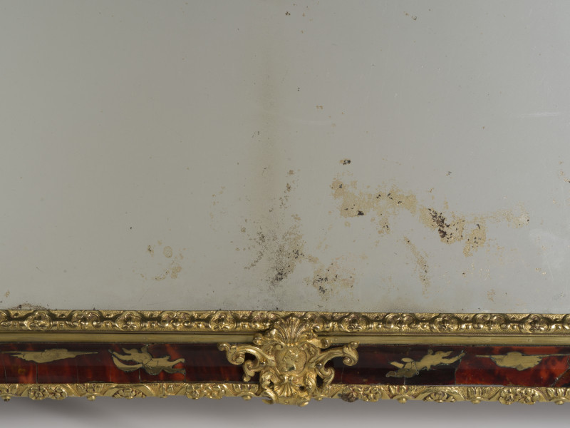 Lustro należące do kompletu „gotowalni królowej Janowej” zakupionej przez Stanisława Kostkę Potockiego 27 lutego 1808 r. w paryskim magazynie De Tournier dla małżonki Aleksandry z książąt Lubomirskich w celu wzbogacenia ekspozycji apartamentów królewskich pałacu wilanowskiego. Ma kształt prostokąta, o lekko sfalowanych bokach, zwieńczonego łukiem. Ustawione na blacie komody opiera się na odchylanej podpórce. Jej rozstaw ograniczany jest wstążką. Zwierciadło oprawione zostało w ozdobną markietowaną ramę. Szylkretowe tło ramy inkrustowane jest mosiężnymi puttami, polującymi na ptaki wśród rozrzuconych obłoczków. Motywy zdobiące mosiężne listwy ramy lustra są doskonale znane z ram obrazów czy plafonów stosowanych w ostatniej ćwierci XVII wieku, projektowanych przez dekoratorów Ludwika XIV.
