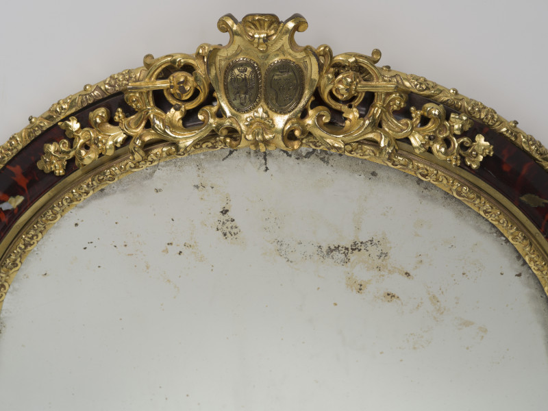 Kartusz umieszczony na szczycie obramienia odgrywa ważną rolę w określaniu właściciela toaletki. Zawiera dwa owalne rytowane medaliony w schematycznie zdobionych obwódkach. Na jednym umieszczono orła pod koroną, na drugim herb rodu d’Arquien. Rysunek orła w koronie symbolizował Rzeczypospolitą, trzy jelenie na tarczy to znak rodowy Marii Kazimiery – królowej Polski. Uproszczony rysunek herbów od wielu lat budzi wątpliwości historyków. Czy jest on wykonany w momencie powstania lustra? Czy wiąże się z momentem dedykowania toalety dla królowej Polski?