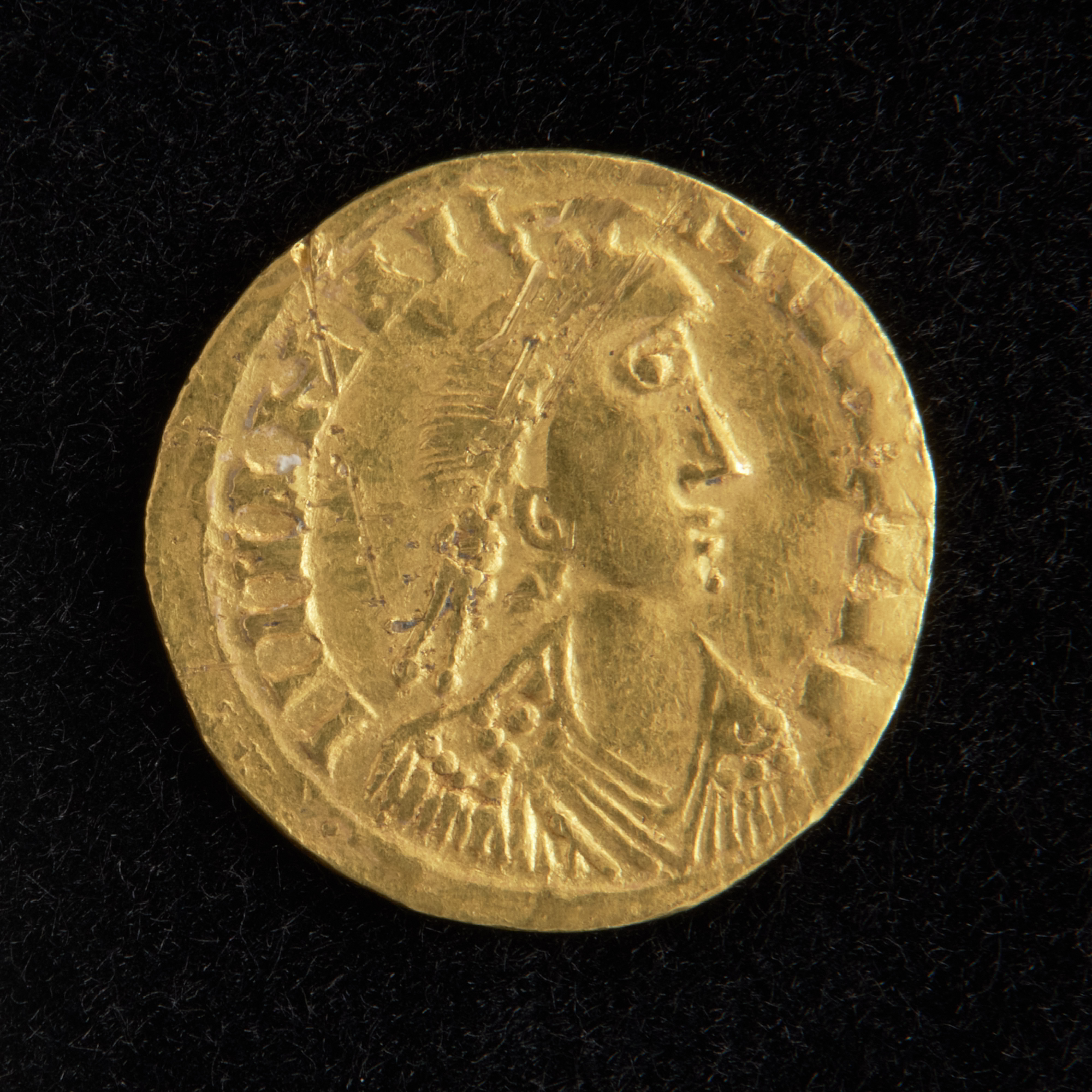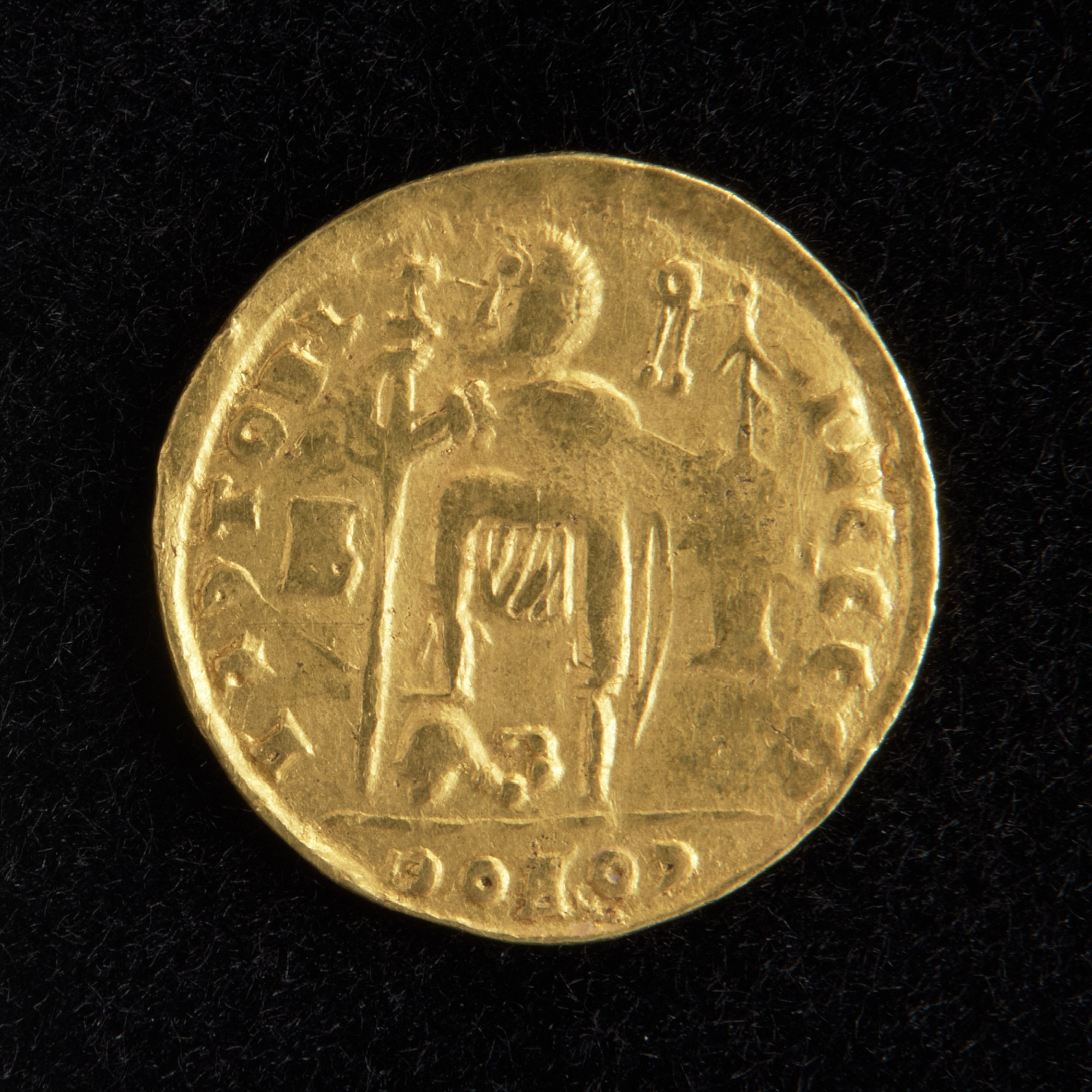 Germańska (ostrogocka?) imitacja solida cesarza Teodozjusza II z miejscowości Smołdzino została znaleziona zapewne na początku XIX wieku i przekazana do zbiorów muzealnych przez osobę prywatną. Jest naśladownictwem solidów bitych w Konstantynopolu w latach 441–450. Na awersie widnieje schematyczny, zbarbaryzowany wizerunek popiersia cesarza Teodozjusza II przodem, w diademie na głowie i pancerzu na piersi. Po lewej stronie postaci cesarza znajduje się zarys górnego brzegu tarczy. Brakuje natomiast występującej zazwyczaj w prawej ręce włóczni opartej drzewcem o prawe ramię. W otoku znajduje się nieczytelny napis. Na rewersie widnieje zredukowana, siedząca przodem na tronie postać Constantinopolis. Po jej lewej stronie o tron opiera się spoczywająca na ziemi okrągła tarcza. W prawej uniesionej ręce postać trzyma jabłko królewskie z krzyżem (globus cruciger). W lewej ręce znajduje się schematycznie przedstawione długie berło (sceptrum). Wizerunek otoczony jest napisem XXXXXX CCXXXX, mającym zapewne naśladować oryginalną inskrypcję w otoku. Pod wyobrażeniem postaci znajduje się nieczytelna geometryczna imitacja znaku menniczego CONOB. Barbarzyńskie imitacje rzymskich solidów docierały na Pomorze Zachodnie wraz z oryginalnymi solidami. Były to pierwsze próby wytwarzania własnych środków pieniężnych m.in. przez plemiona Wizygotów i Ostrogotów, które doprowadziły do upadku Cesarstwa Zachodniorzymskiego.