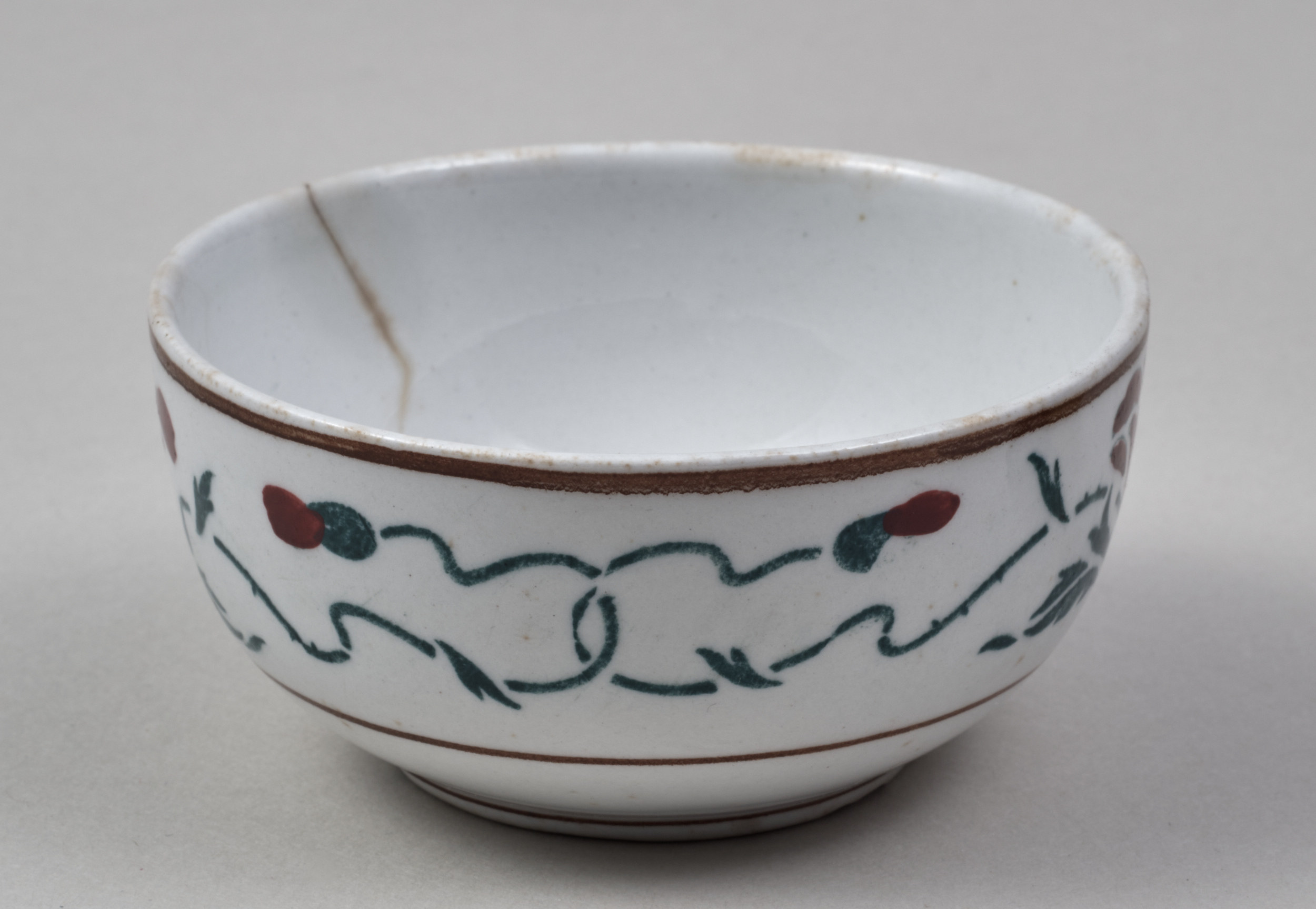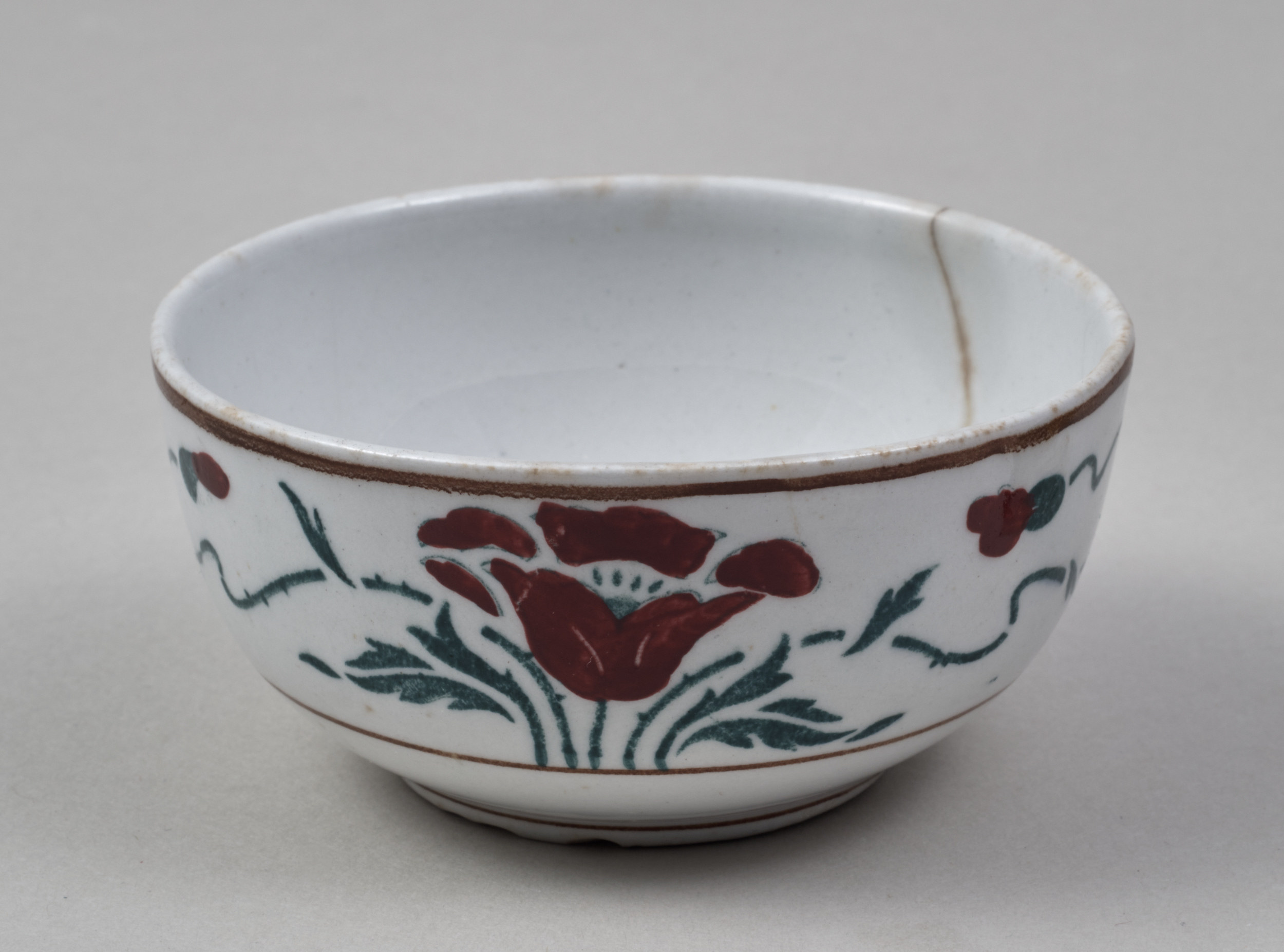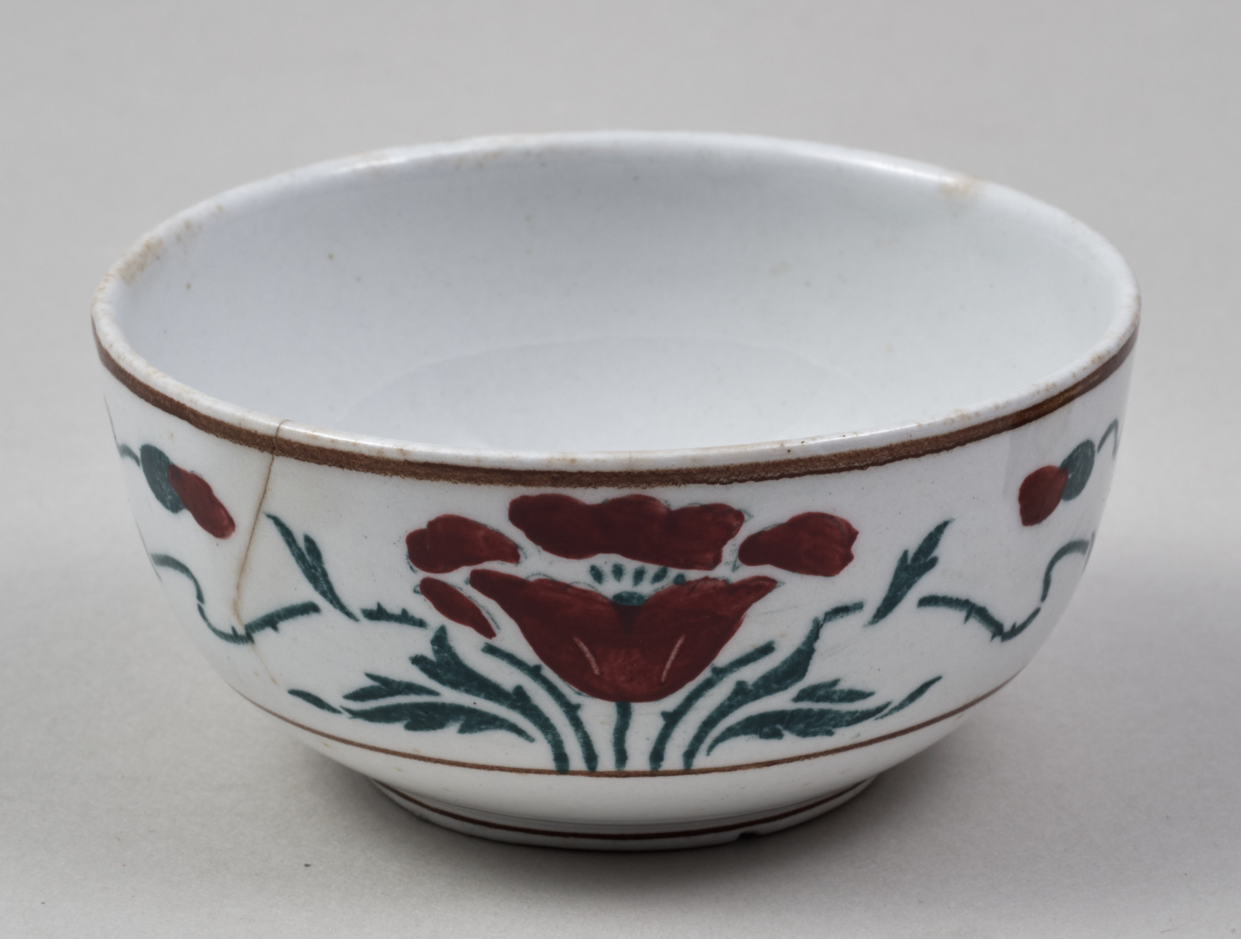 Czarka – mała, fajansowa, półkolista, z nieznacznie wyodrębnioną stopką, skromnie zdobiona biegnącym wokół brzegu dwubarwnym szlakiem stylizowanych maków (płatki kwiatowe bordowo-czerwone, liście łodygi i makówki ciemno-zielone), zamkniętych pomiędzy dwoma brązowymi prążkami, dekorację tę tworzy dwukrotnie powtórzony wzór, tj. mieszczący się w obwodzie brzegu czarki symetryczny wzór z motywem kielichowatego maku, stojącego pomiędzy parą długich esowato wijących się łodyg zakończonych makówką. Stopkę, podobnie jak pas dekoracji, obiega brązowy prążek. Na odwrocie stopki znak malarza w postaci ręcznie napisanej bordową farbą ceramiczną cyfry „2”.
