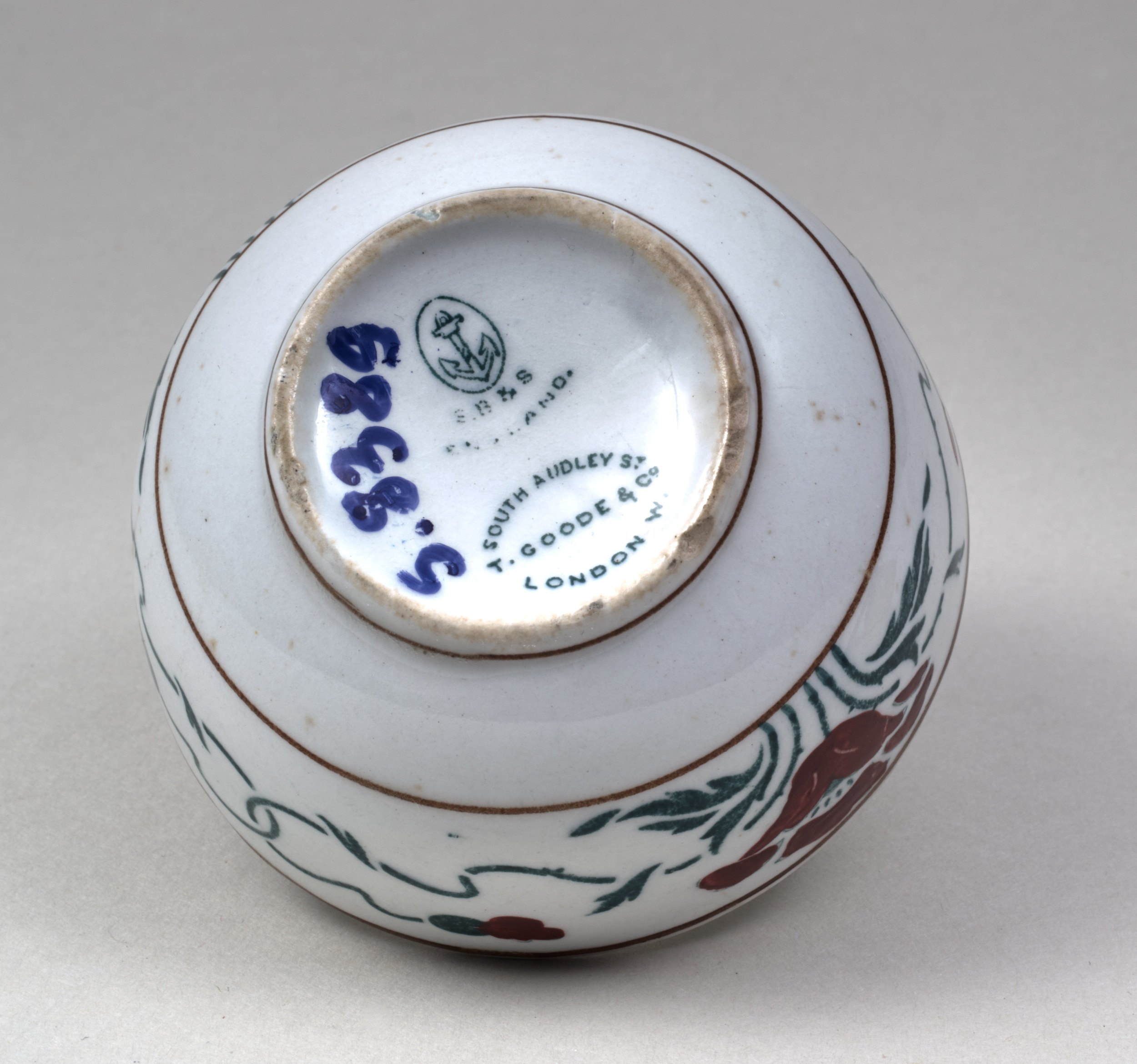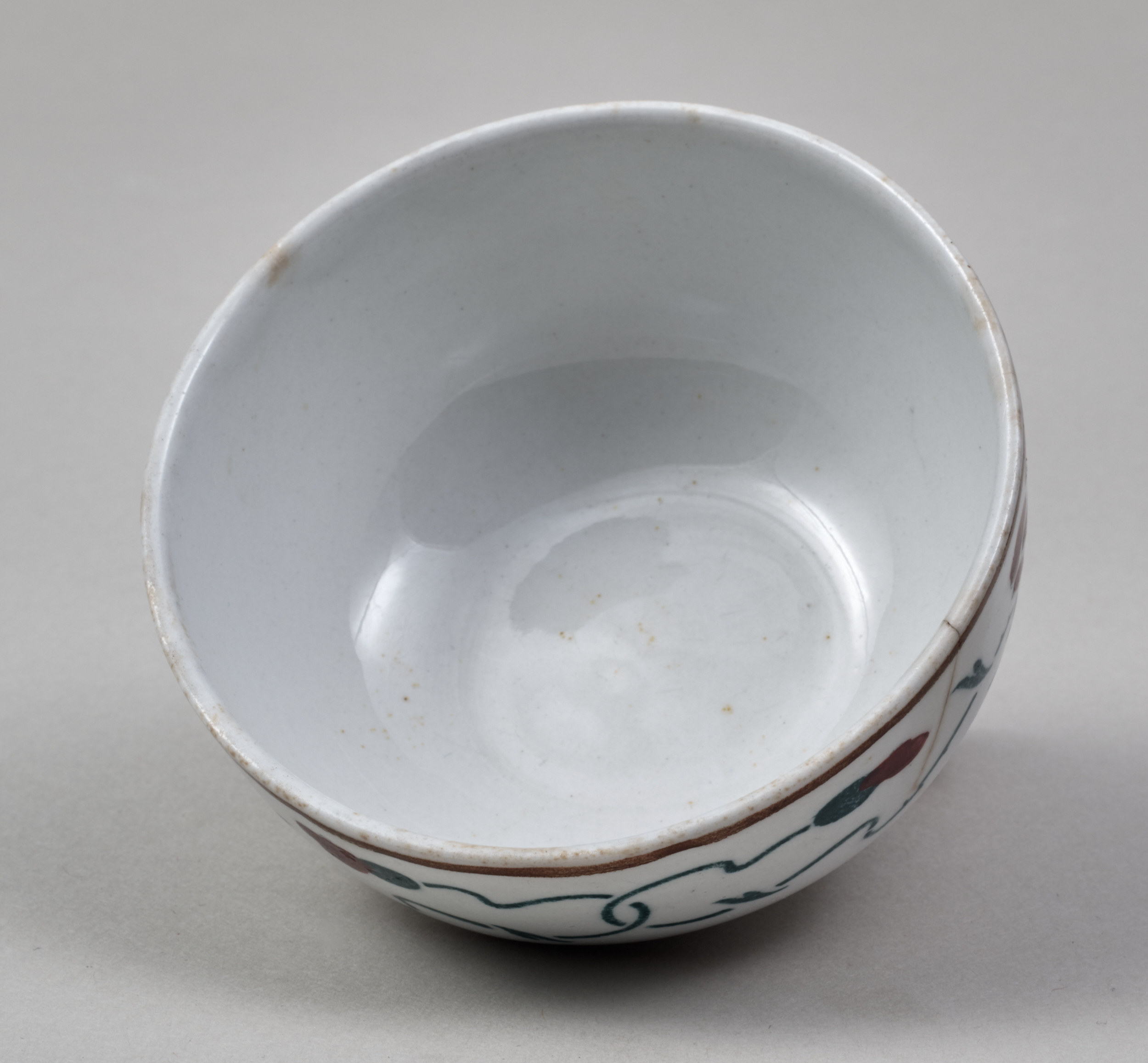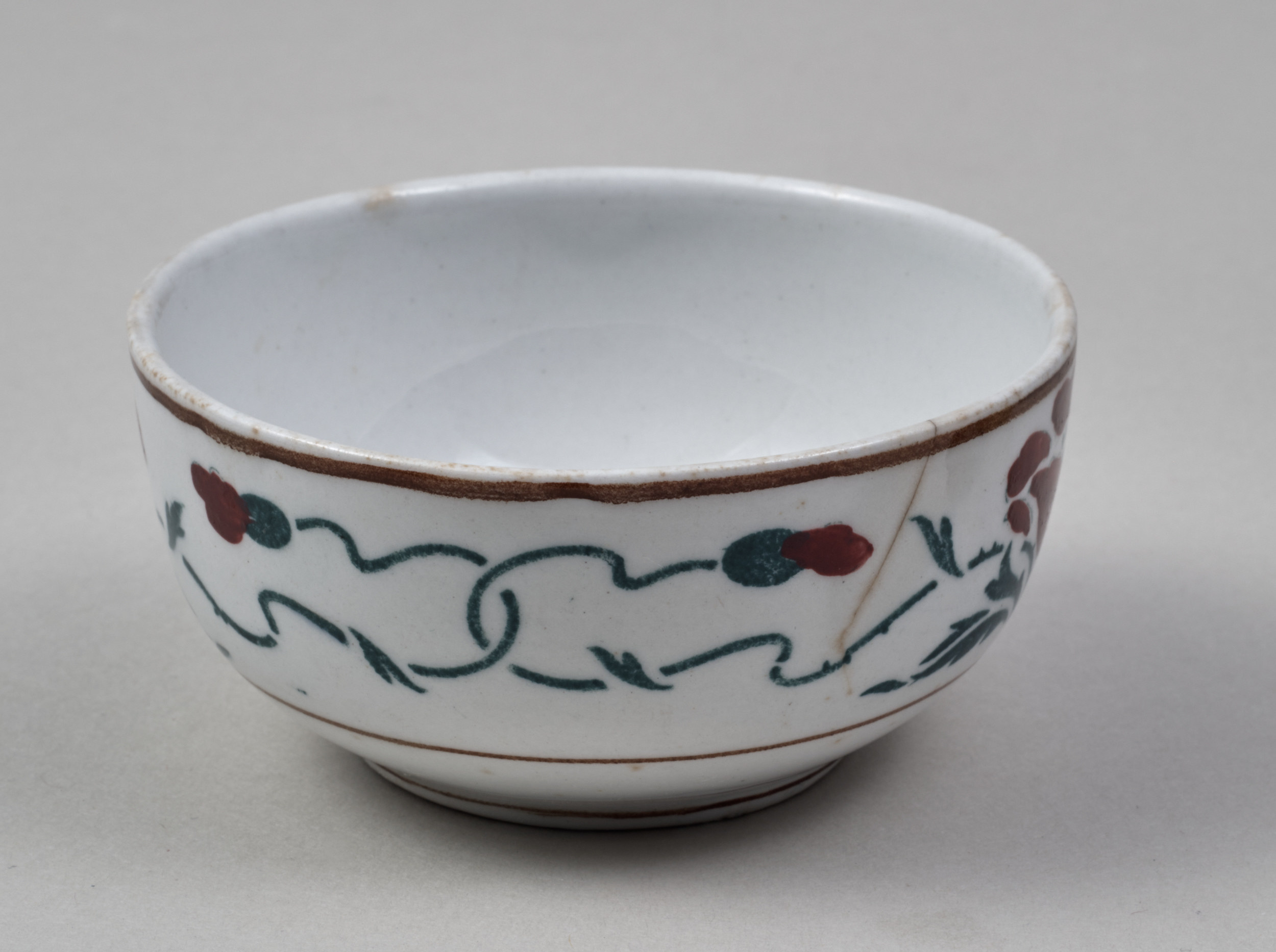 Czarka – mała, fajansowa, półkolista, z nieznacznie wyodrębnioną stopką, skromnie zdobiona biegnącym wokół brzegu dwubarwnym szlakiem stylizowanych maków (płatki kwiatowe bordowo-czerwone, liście łodygi i makówki ciemno-zielone), zamkniętych pomiędzy dwoma brązowymi prążkami, dekorację tę tworzy dwukrotnie powtórzony wzór, tj. mieszczący się w obwodzie brzegu czarki symetryczny wzór z motywem kielichowatego maku, stojącego pomiędzy parą długich esowato wijących się łodyg zakończonych makówką. Stopkę, podobnie jak pas dekoracji, obiega brązowy prążek. Na odwrocie stopki znak malarza w postaci ręcznie napisanej bordową farbą ceramiczną cyfry „2”.