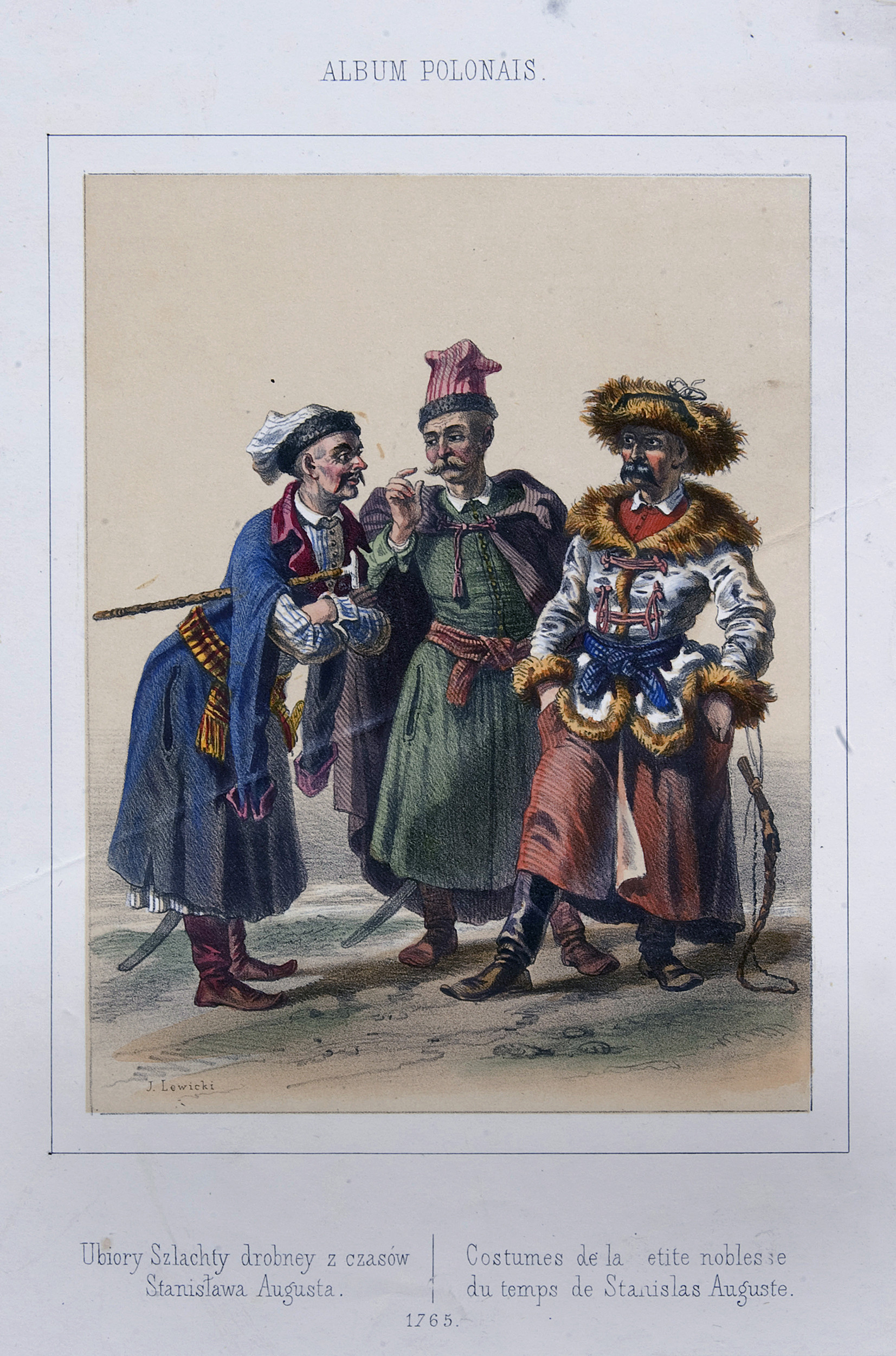 Scena ukazuje trzech, zwracających się do siebie w rozmowie szlachciców, ubranych w nasycone kolorystycznie stroje w typie polskim. To właśnie stroje, oddane z pietyzmem i precyzją, choć w nieco fantazyjnej manierze, są głównym przedmiotem przedstawienia. Informuje nas o tym zawarta pod sceną deskrypcja, odbita w języku polskim i francuskim: Ubiory Szlachty drobney z czasów Stanisława Augusta; Costumes de la etite (!) noblesse du temps de Stanislas Auguste. Poniżej, po środku 1765. Ponad sceną, dużymi literami tytuł zbioru: ALBUM POLONAIS. Postać szlachcica ukazanego po lewej stronie nosi niebieski kontuszu z wylotami i zwisającymi rękawami, przepasany wzorzystym pasem; postać stojąca po środku nosi zielony żupan z narzuconą na wierzch, spinaną na piersi szubą. Obaj noszą na głowie czapki w typie konfederatek. Szlachcic po prawej stronie ubrany jest w rodzaj obszytej futrem, przepasanej czamary, a jego głowę okrywa obszyta futrem czapka. W lewym dolnym rogu widnieje sygnatura autora: J. Lewicki. Litografia ze szlachcicami w strojach polskich pochodzi ze zbioru pt. „Album Polonais” lub “Album des costumes polonais anciens et modernes”, autorstwa Jana Nepomucena Lewickiego (1795-1871). Wydawnictwo ukazało się w Paryżu, w 1853 roku. W zbiorach Muzeum wilanowskiego zachowały się trzy karty wydawnictwa: Okładka, której kompozycja prezentuje zbiór portretów zasłużonych w historii Polaków, w układzie chronologicznym, oraz kartę pt. Buńczuk Jana III. Cykl „Album Polonais” jest ciekawym dokumentem epoki; w 12 składających się na zbiór odbitkach podjęte zostały przez Lewickiego tematy związane z historią oraz kulturą polską. Lewicki, emigrant popowstaniowy, przez wiele lat mieszkał i tworzył we Francji (Strassburg, Nancy, Paryż). Do niezwykłych epizodów jego emigracyjnego był pobyt w Lizbonie, gdzie powierzono mu funkcję głównego rytownika szkoły topograficznej. Lewicki powrócił do kraju w latach 50., jednak w wyniku upadku powstania styczniowego (przygotowywał mapy dla powstańców), ostatecznie wyjechał, aby osiąść we Francji.