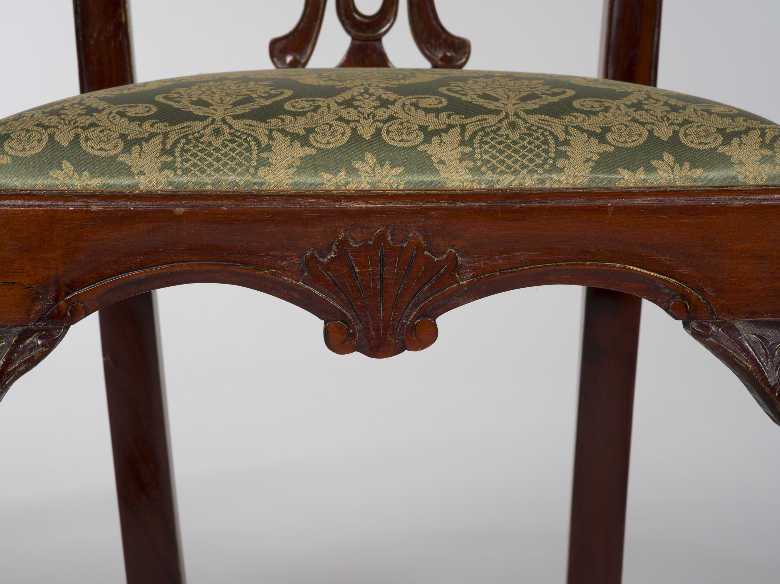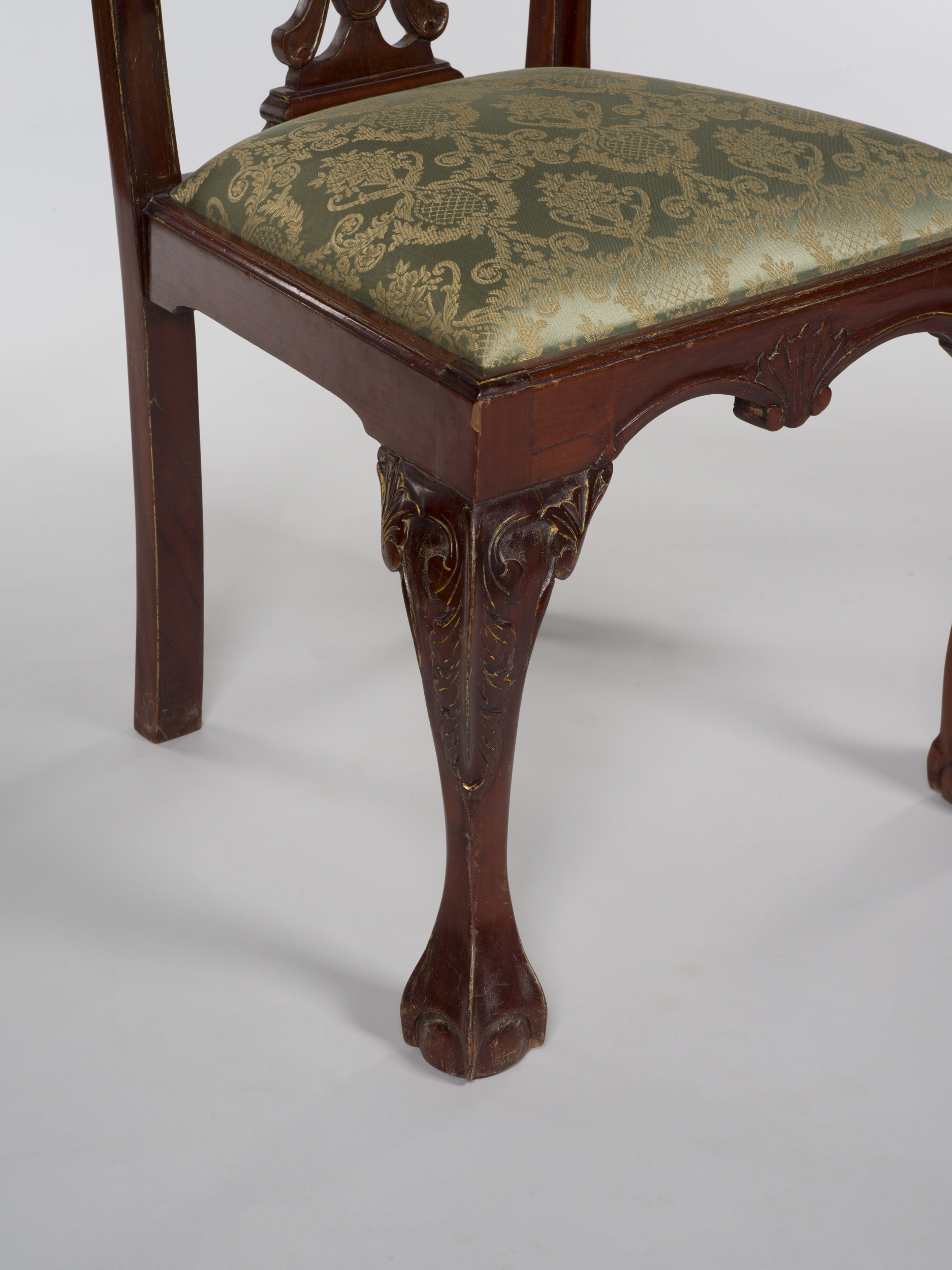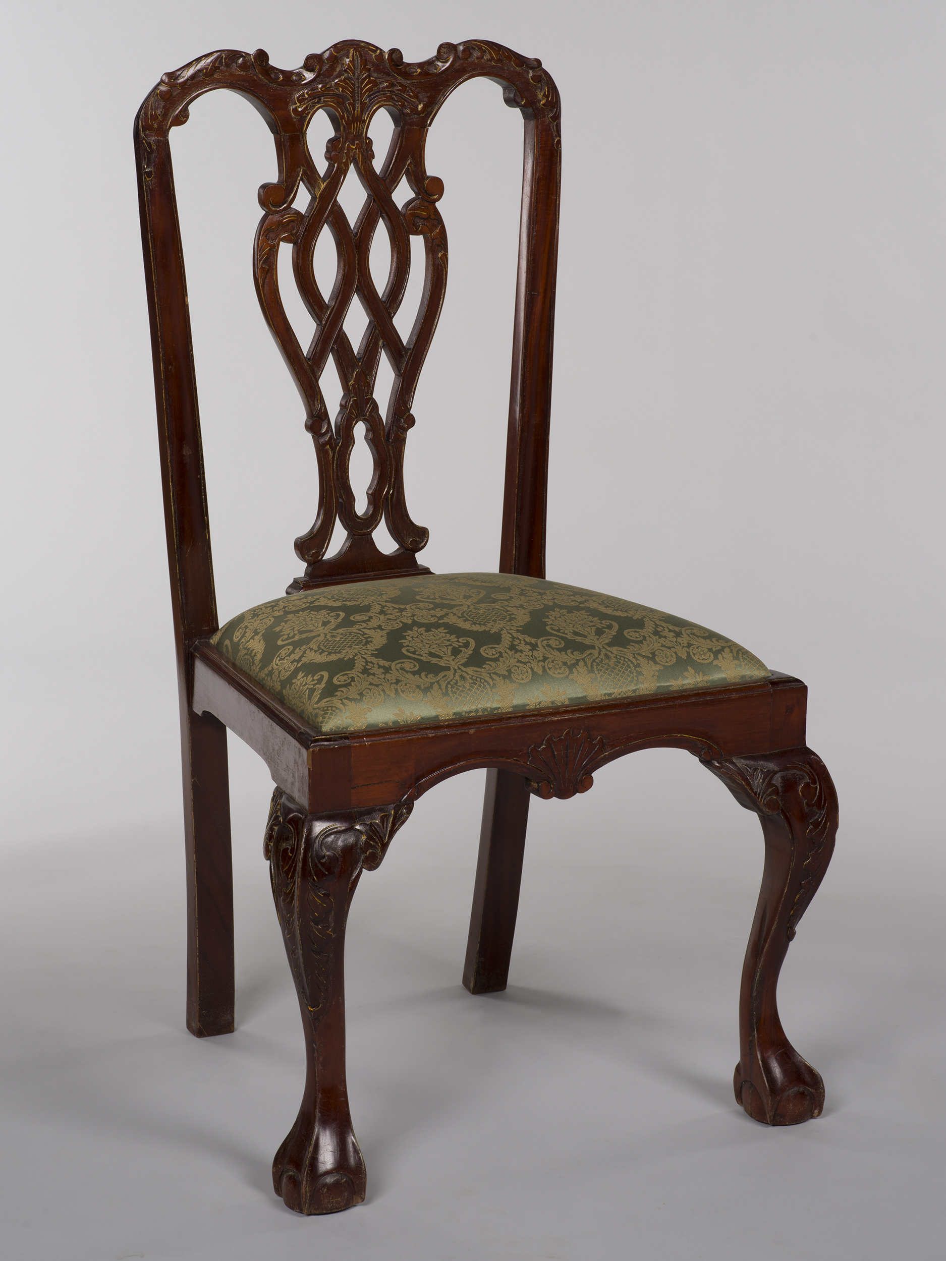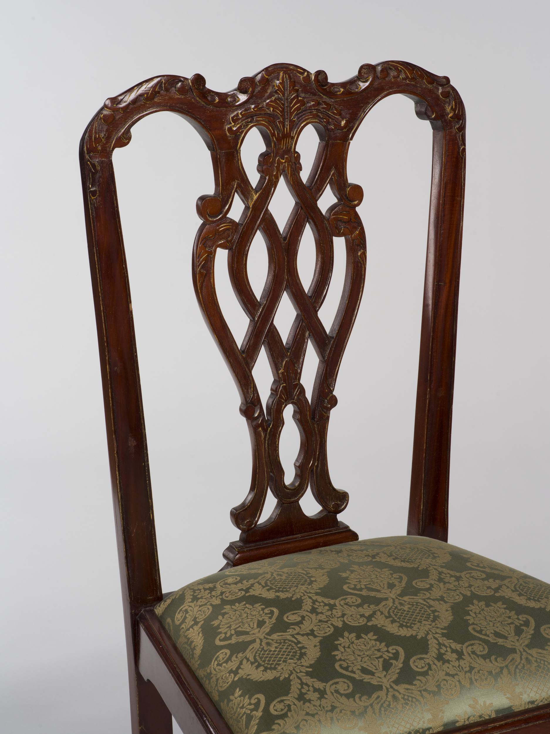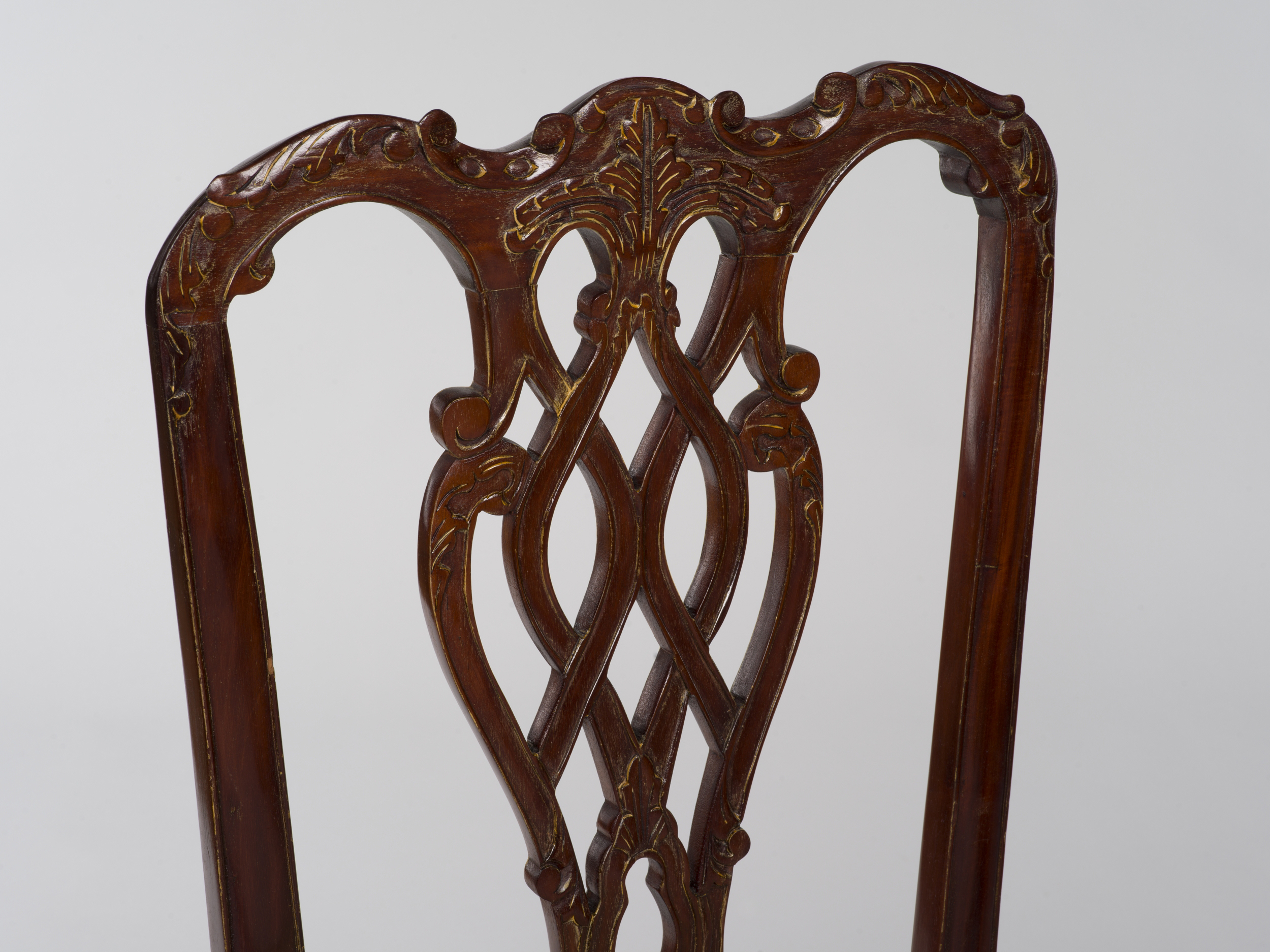 Stanowi element kompletu mebli jadalnianych w stylu chippendale, złożonego ze stołu, sześciu krzeseł i dwóch foteli.
