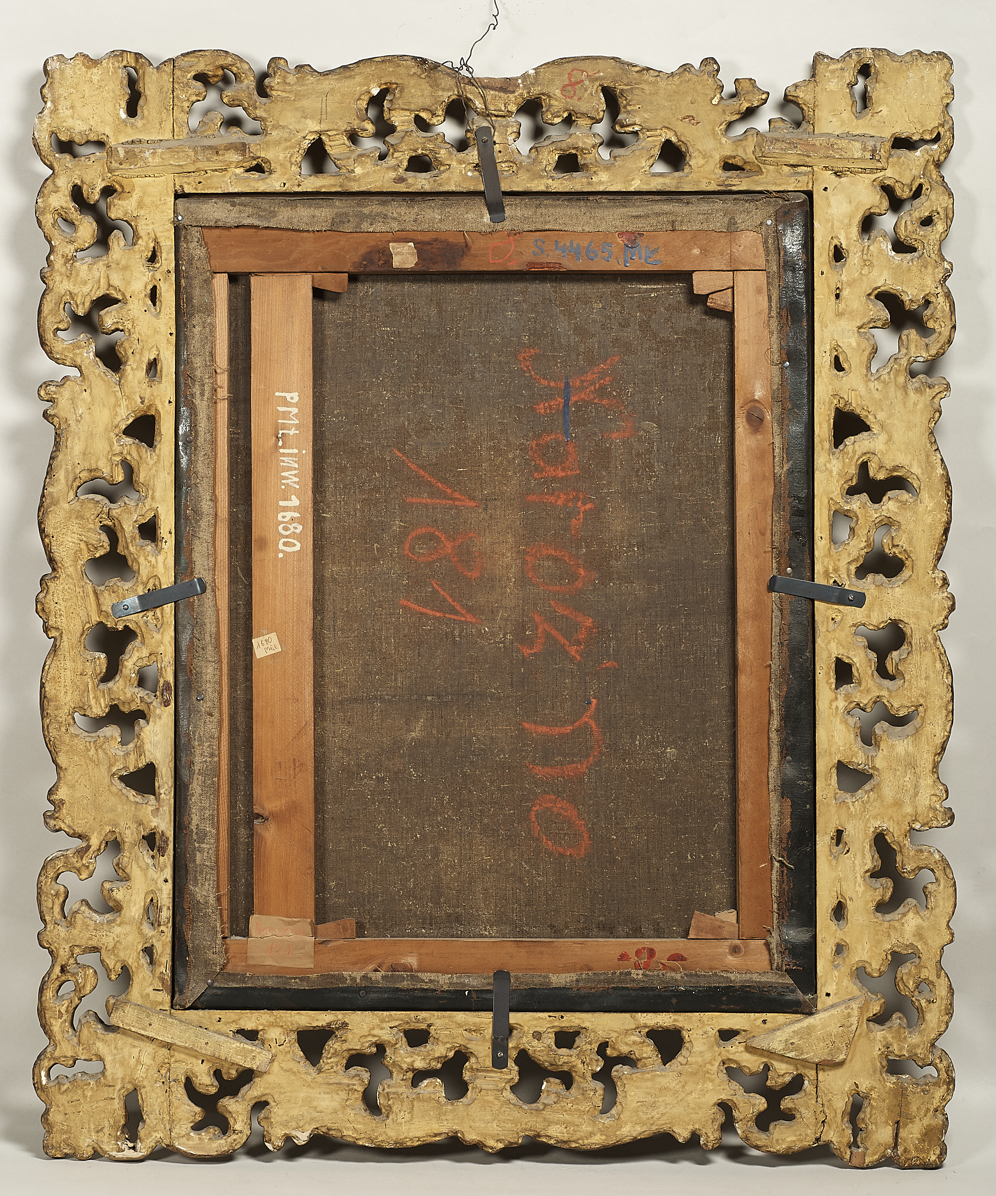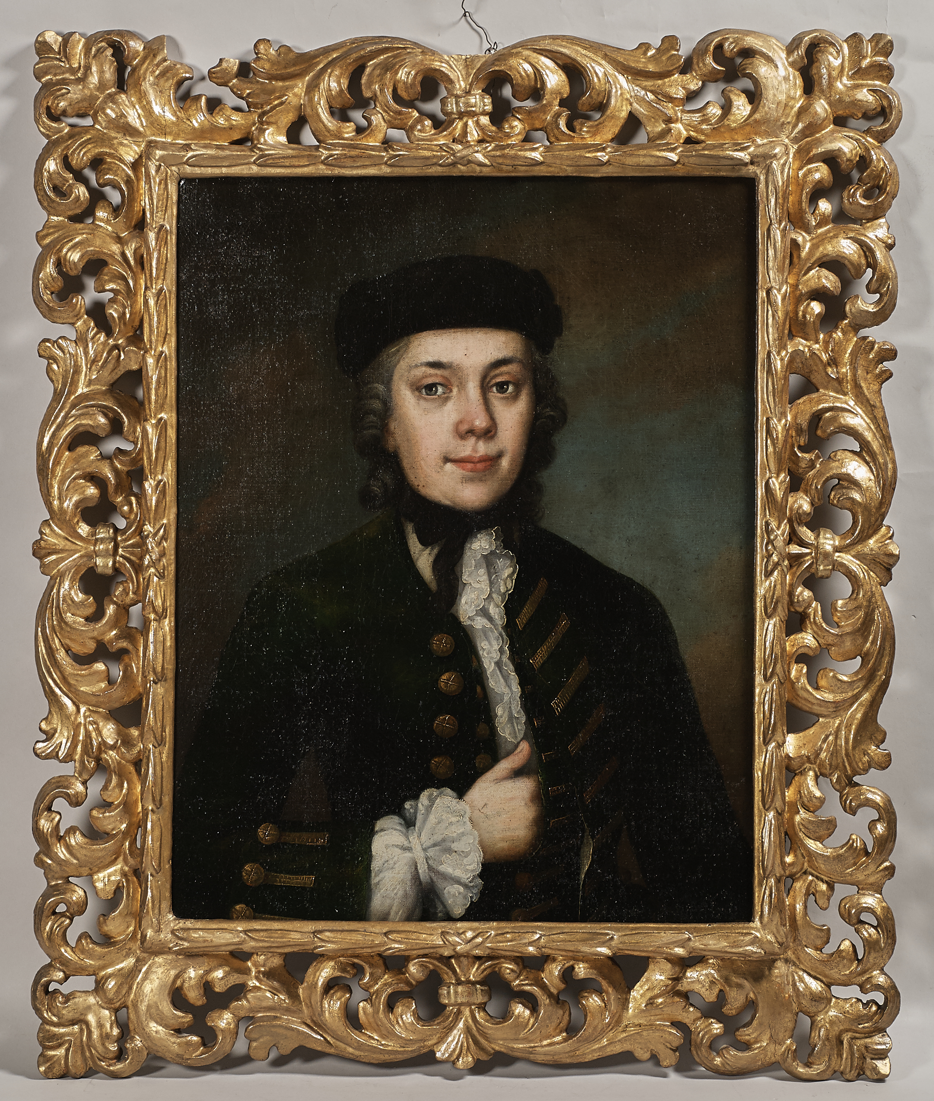 Olejny portret w kształcie prostokąta z 3. ćw. XVIII w., namalowany przez nieznanego autora wywodzącego się ze szkoły niemieckiej. Przedstawia młodego mężczyznę na tle schematycznie potraktowanego nieba. Portretowany ukazany w półpostaci z twarzą i wzrokiem skierowanymi w stronę widza. Twarz owalna, pełna, o podwójnym podbródku, ciemnych brwiach, dużych czarnych oczach, wydatnym nosie i lekko uśmiechniętych cynobrowych ustach. Karnacja twarzy cielisto-złotawo-różowa z dość głębokimi niebiesko-szarymi cieniami. Na głowie portretowanego pudrowana peruka i czarny beret. Lewa ręka opuszczona swobodnie wzdłuż ciała, prawa włożona za połę szustokoru. Ubiór tworzy ciemnozielony aksamitny szustokor, szamerowany złotem. Pod nim biała koszula ozdobiona koronkowym żabotem i mankietami, na szyi zawiązana czarna chustka. Tłem jest błękitne niebo pokryte szaro-pomarańczowo-białymi obłokami. Rama drewniana, szeroka, złocona, ażurowa, jej wewnętrzny profil zdobi ornamentem z liści bluszczu.