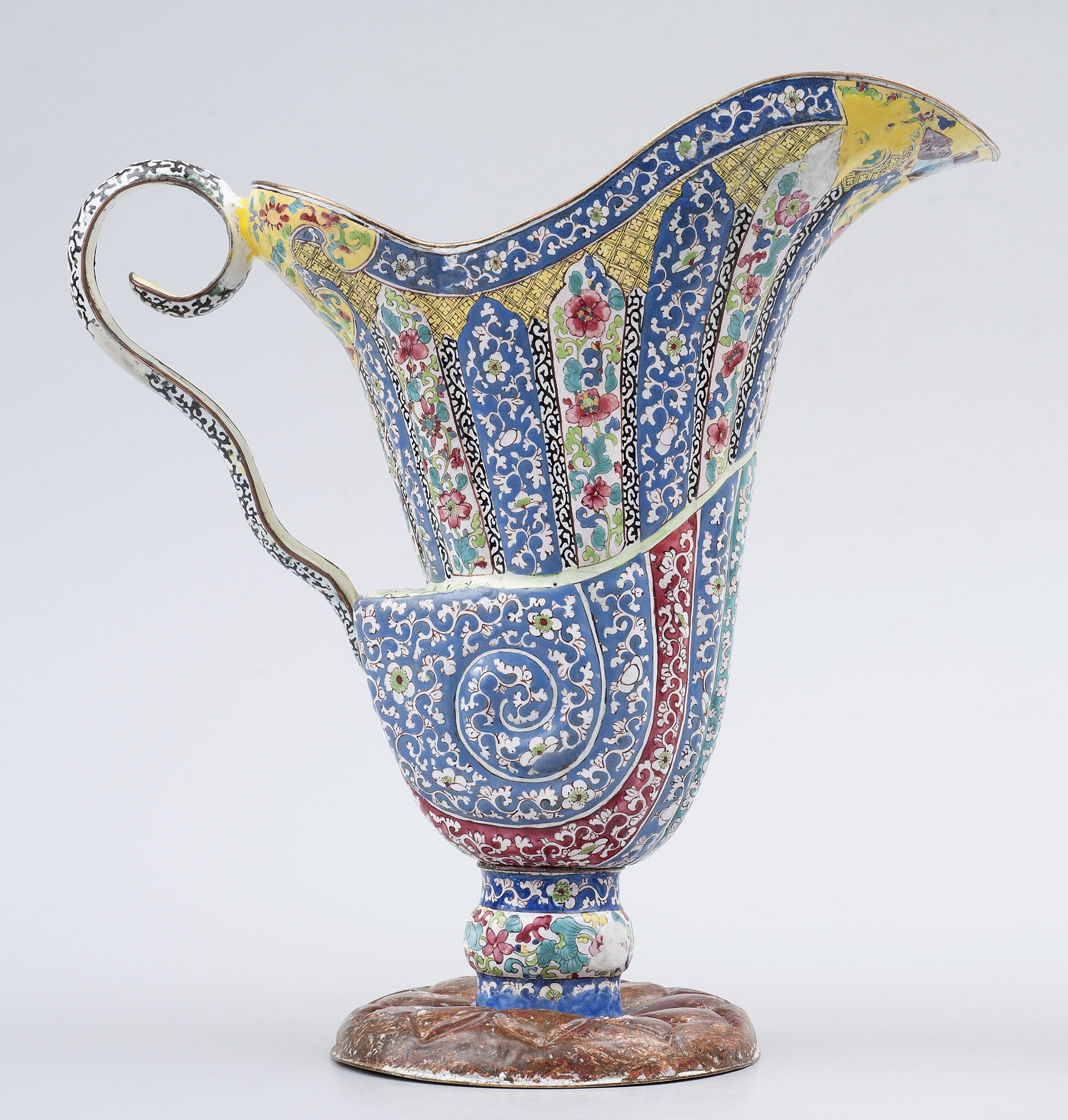 Miedziany dzbanek na wodę typu hełmowego – kształt brzuśca żeberkowanego naczynia nawiązuje do kształtu hełmu. Brzusiec z szerokim wylewem spoczywa na ruchomej stopie z mocnym rozszerzeniem. Na boku naczynia umieszczono ozdobne, esowate w kształcie ucho. W górnej partii powierzchnię nalewki pokrywa barwna emalia w formie pasów zdobień o charakterze floralnym. Dwie przeciwległe krawędzie wylewu – przy dziobku i uchu – zdobią rezerwy zamknięte w kształcie ruyi – chińskiego berła, obie z motywem peonii i motyla. Wnętrze wylewu dekorują dwa stylizowane motywy - również peonii oraz motyla.