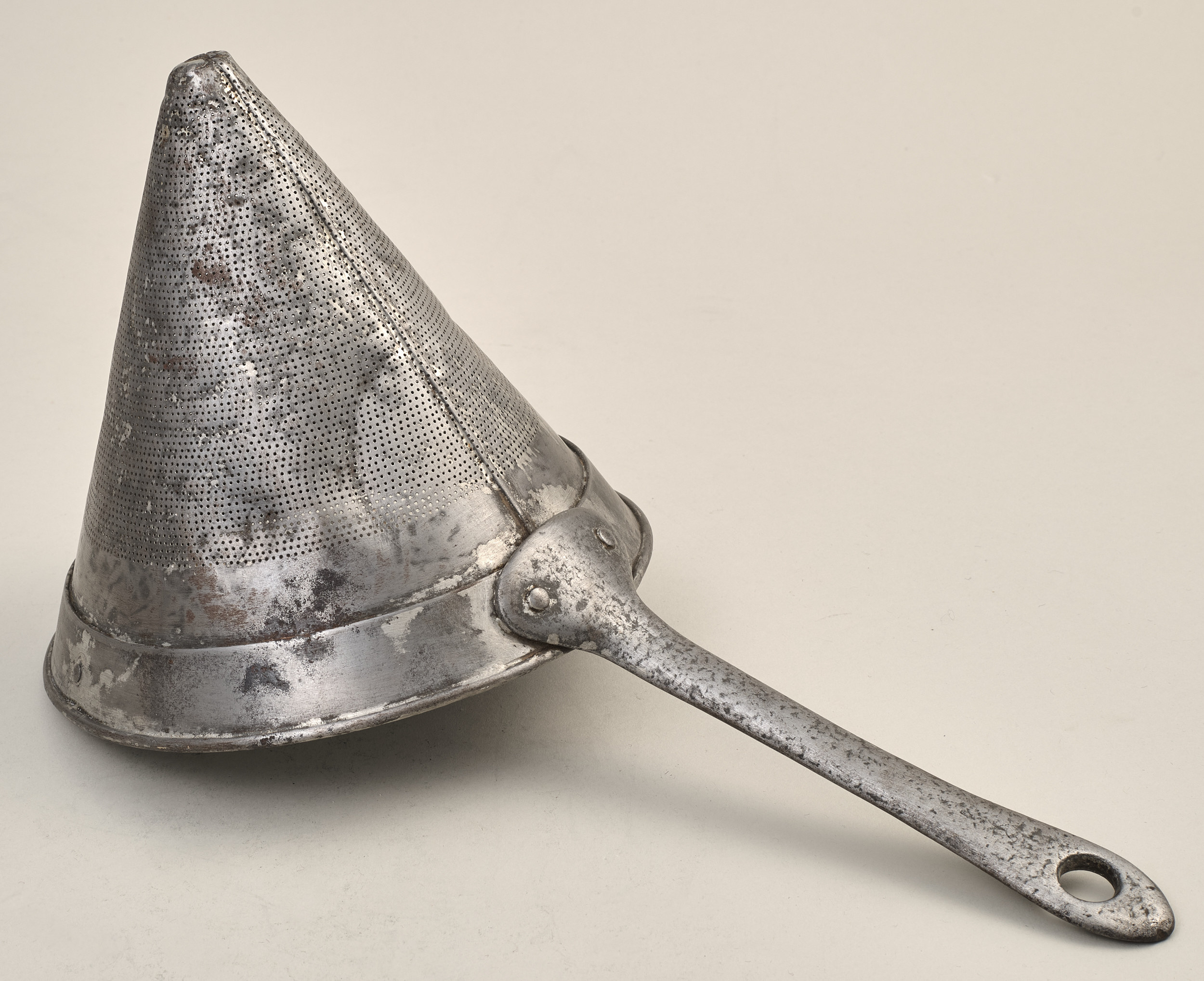 Sitko z blachy cynowanej pochodzi z początku XX wieku, z kolekcji Potockich. Sitko niewielkie w kształcie stożka z uchwytem. Stożek dziurkowany o zaokrąglonym wierzchołku, z boku widoczne łączenie blachy. Podstawa stożka z gładkiej blachy z dolną krawędzią zawiniętą na zewnątrz w rulonik. Uchwyt niezbyt długi, płaski o zaokrąglonych brzegach przytwierdzony do sitka za pomocą dwóch nitów i rozszerzający się przy zakończeniu, z okrągłym otworem do zawieszania. Na obu stronach sitka ślady po cynowaniu. Kuchnia, według niektórych opinii to nie tylko miejsce, w który przygotowane są potrawy, ale to serce domu, gdzie wszyscy się spotykają, wymieniają uwagi, pomysły, miejsce w którym spaja się rodzina. W bogatych domach, dworach, pałacach były Kuchnie wszechstronnie  wyposażone nie tylko w różnego rodzaju paleniska, piece (piec do pieczywa, ciast, mięsa, rożna) ale i akcesoria typu garnki, patelnie, rondle. W bogatych domach bywało po kilka kuchni spełniających specjalistyczne funkcje oraz często osobno pomieszczenie po parzenia kawy. W skład wyposażenia kuchni wchodziły przeróżne naczynia (często bogato zdobione) przeznaczone do przygotowywania różnych potraw jak wanienki do ryb, rondle, saganki, kociołki, czajniki , a także, najbardziej zdobione formy do legumin, budyniów, ciast (formy do bab), galaret czy tasaki służące do rozdzielania mięsa m.in. tak jak w muzeum zdobione sylwetkami zwierząt czy ich głów. W kuchni potrzebne też były różnorodne drobniejsze naczynia jak sitka, durszlaki, cedzaki, które zresztą używane są do dziś i nic nie straciły na popularności. Omawiane sitko jest eksponowane na Korytarzu Wschodnim II p wśród innych naczyń, pozostałości po  nieistniejących kuchniach zamkowych.