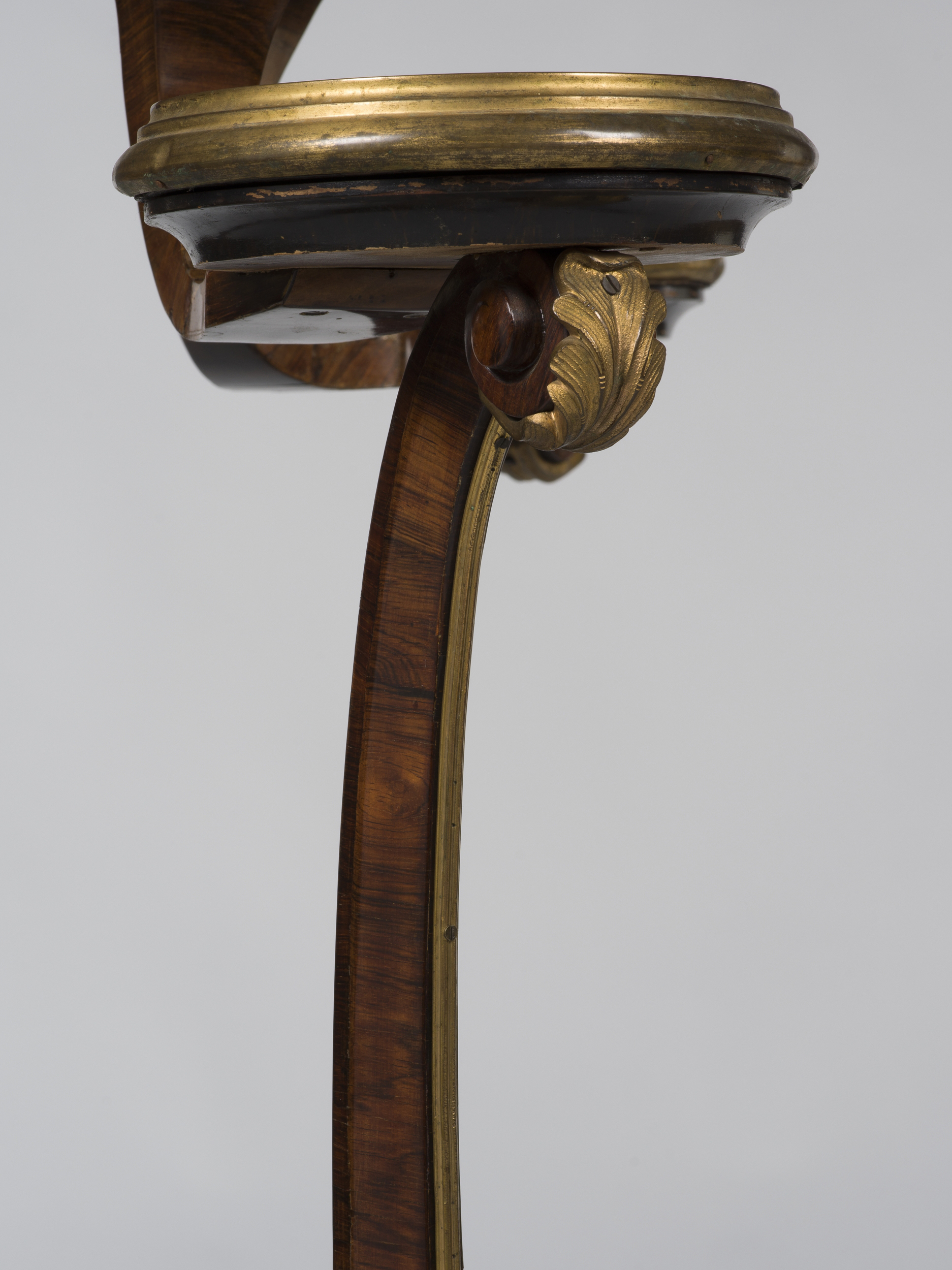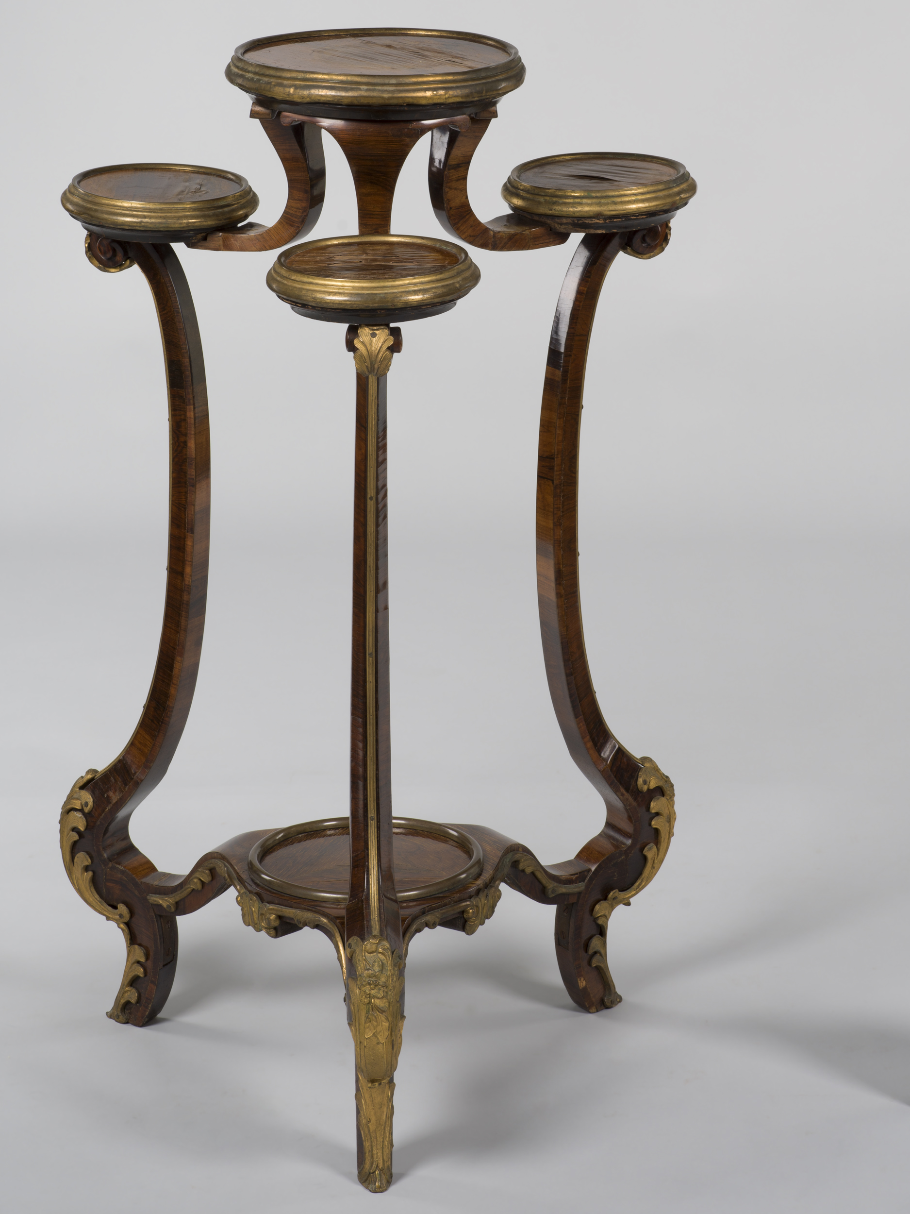 W dolnej części wydłużone listwy podtrzymujące przechodzą płynnie w trzy nóżki typu cabriole połączone wiązaniem uniesionym nieco w części centralnej opatrzonej okrągłą płyciną otoczoną półwałkiem. Fornirowana mahoniem powierzchnia mebla wzbogacona została powściągliwą dekoracją złoconymi gładkimi, listwami z brązu wzmacniającymi krawędzie okrągłych blacików i bardziej ozdobnymi formami liści ujmującymi dolne fragmenty podpór i nóżki mebla. Mebel służył jako podstawa do kwiatów, których doniczki ustawiano na okrągłych blacikach, ale także do ekspozycji porcelany miśnieńskiej w apartamencie prawego skrzydła pałacu wilanowskiego.