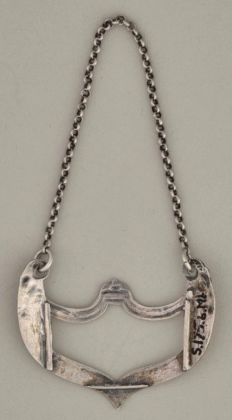 Etykietka na butelkę z kolekcji Potockich, ze srebra, z przełomu XIX i XX wieku. Etykietka do zawieszania, na butelkę lub karafkę zawierającą nazwę alkoholu. Etykietka w kształcie stylizowanego kartusza zakończonego w górnych narożach głową barana (po obu stronach). Przez zwinięte wolutowo rogi przechodzą kółeczka, do których doczepiony jest łańcuszek. Kartusz dołem obiega pasowy ornament składający się z kwiatków i liści. Górna krawędź kartusza profilowana ozdobiona w połowie nakładanym kwiatonem. Wnętrze kartusza obecnie puste, kiedyś umieszczona tam była kartka papieru z odręcznym napisem czarnym tuszem Porty. Tego typu etykiety używano na butelkach, karafkach dla oznakowania alkoholu przelanego z oryginalnych, często omszałych ze starości butelek. Etykiety pojawiły się około 1740 r jako przedmioty ułatwiające identyfikacje nowych rodzajów gatunków wina, które stopniowo wchodziły na rynek, Zawieszano je na szyjkach butelek, na srebrnym łańcuszku. Etykietki z połowy XIX wieku posiadały tylko inicjały wina. Z wyjątkiem odlewanych etykietek z okresu regencji większość była wytłaczana. Etykietki opisywane (ze zbiorów Muzeum) nawiązują kształtem do okresu regencji i co charakterystyczne posiadają „okienko”, w które wkładano kartkę z nazwą alkoholu. Wielkość etykietek świadczy o ich przeznaczeniu, większe były przeznaczone do zawieszania na karafkach. Obok etykietek srebrnych wytwarzane były etykietki srebrzone galwanicznie i emaliowane. Etykietki zanikły gdy pojawił się zwyczaj naklejania na butelkach etykiet papierowych z nazwą alkoholu. Jako ciekawostkę można wspomnieć że istniały też mniejsze etykiety do zawieszania na butelkach z sosami.