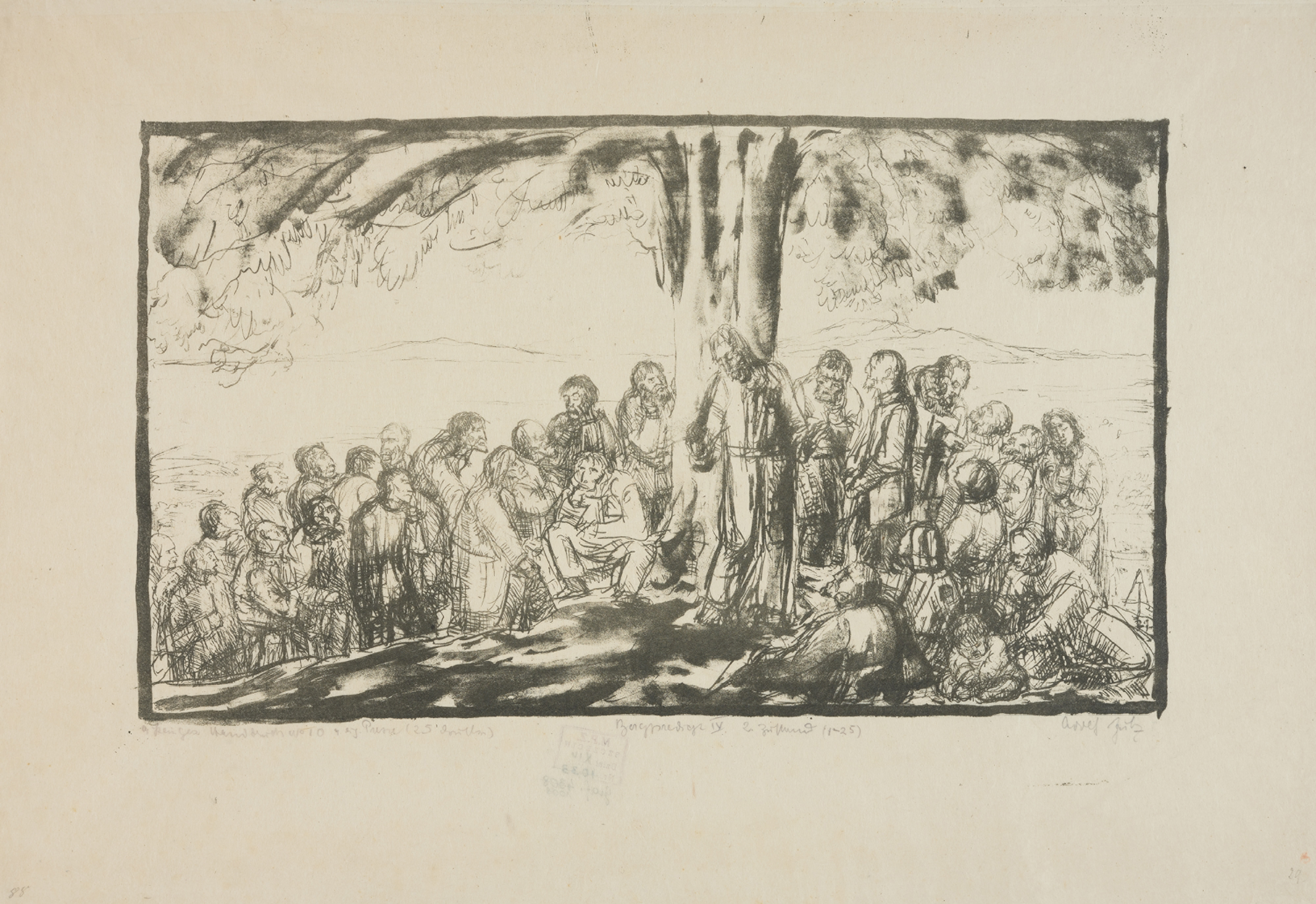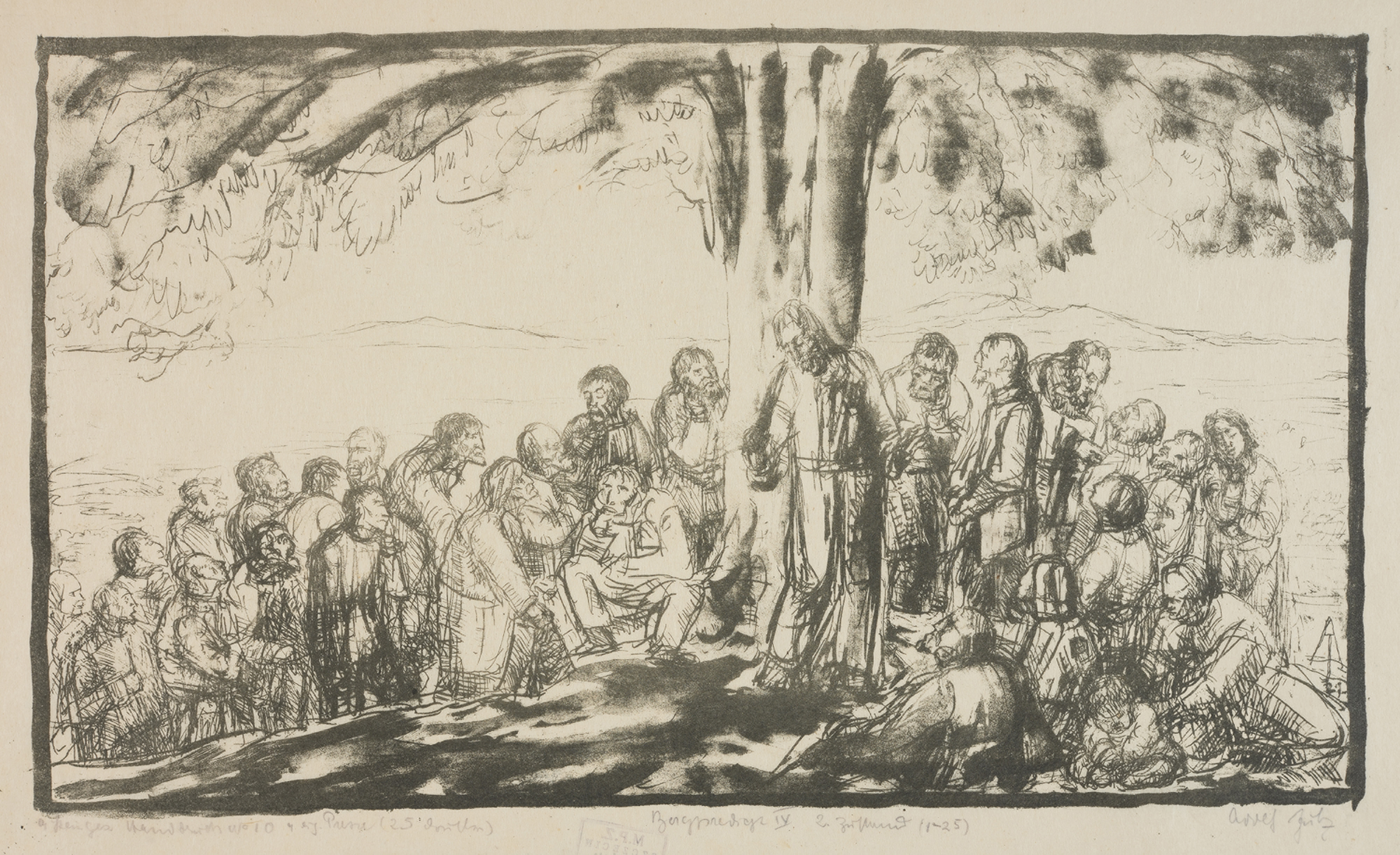 Odbitka wykonana techniką litografii, ręcznie drukowana na bibułce przez Georga Pierre’a, została wydana na przełomie lat 1920/1921. Była czwartą wersją kompozycji Jutza Kazanie na Górze. Jutz zastosował odmienną kompozycję, aby tej scenie nadać inną wymowę.