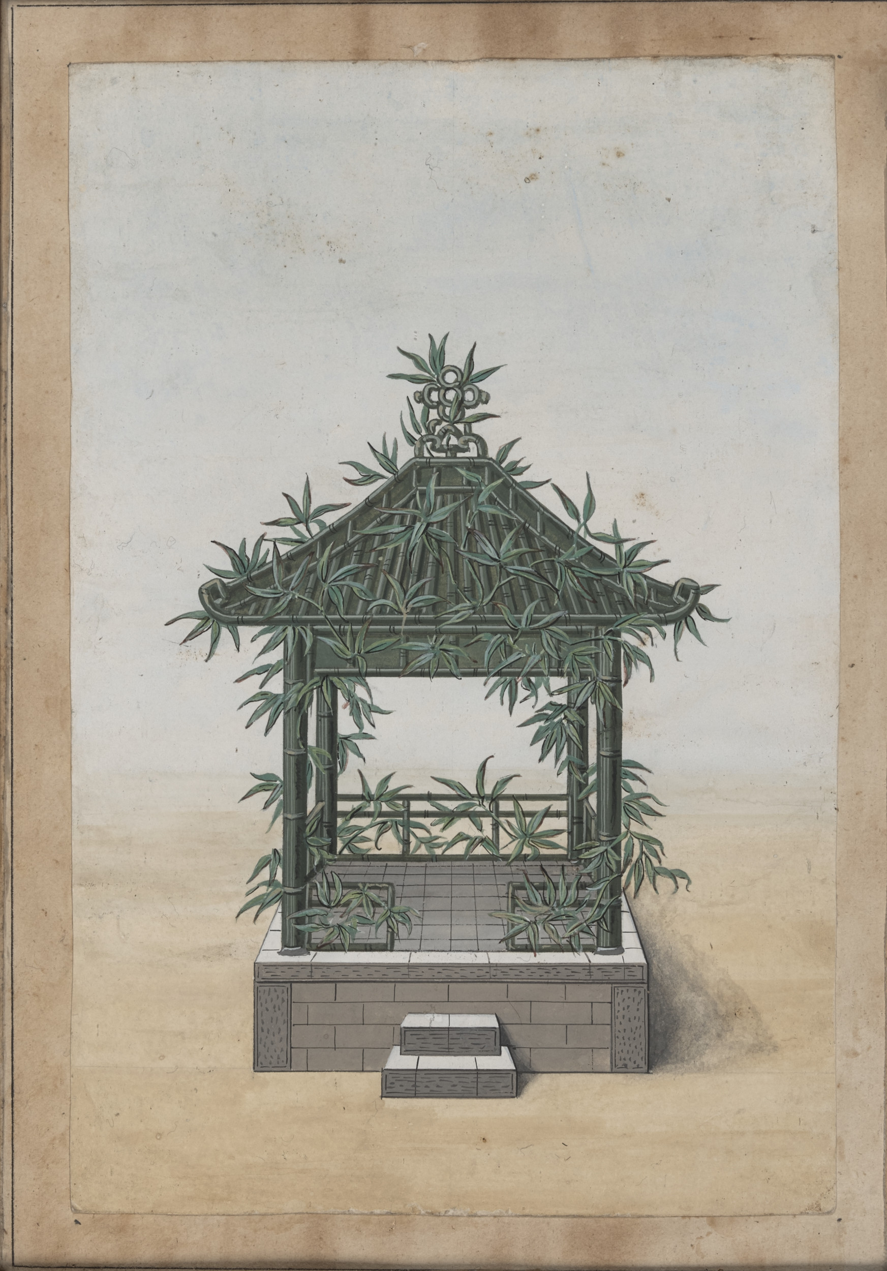 Obrazek malowany farbami wodnymi na papierze, z kolekcji Lubomirskich, dawnych właścicieli zamku łańcuckiego, za szkłem przedstawia altanę w stylu chińskim. Serię podobnych obrazków ukazujących jak urządzać altany i pawilony w modnym od końca XVIII w stylu chińskim zamówiła księżna marszałkowa Lubomirska. Świadczą o tym wpisy tych obrazków w inwentarzu zamkowym z 1802 r. Obrazek przedstawia widok altany na neutralnym tle. Obrazek powiększony przez naklejenie na papier. Podstawę altany stanowi dość wysoka podmurówka z szarego kamienia ujęta przy brzegach w drewnianą okleinę z geometrycznym wzorem. Na podmurówce, wsparty na czterech słupach, spoczywa pagodowy dach z ażurową ozdobą na szczycie. Pomiędzy słupami niska drewniana balustrada z wejściem z przodu, do którego prowadzą dwa stopnie z podobną okleiną. Całość altanki (bez podmurówki) opleciona zielonym pnączem. Wszystkie obrazki serii ujęte w jednakowe ramy – drewniane z nakładaną plecionką i rozetami w narożnikach, prawdopodobnie wyrób wiedeński. Obrazki pochodzą z przełomu XVIII /XIX w i powstały prawdopodobnie w Chinach jako wzorniki. Obrazki eksponowane są w sypialni Apartamentu Chińskiego na I p zamku łańcuckiego.
