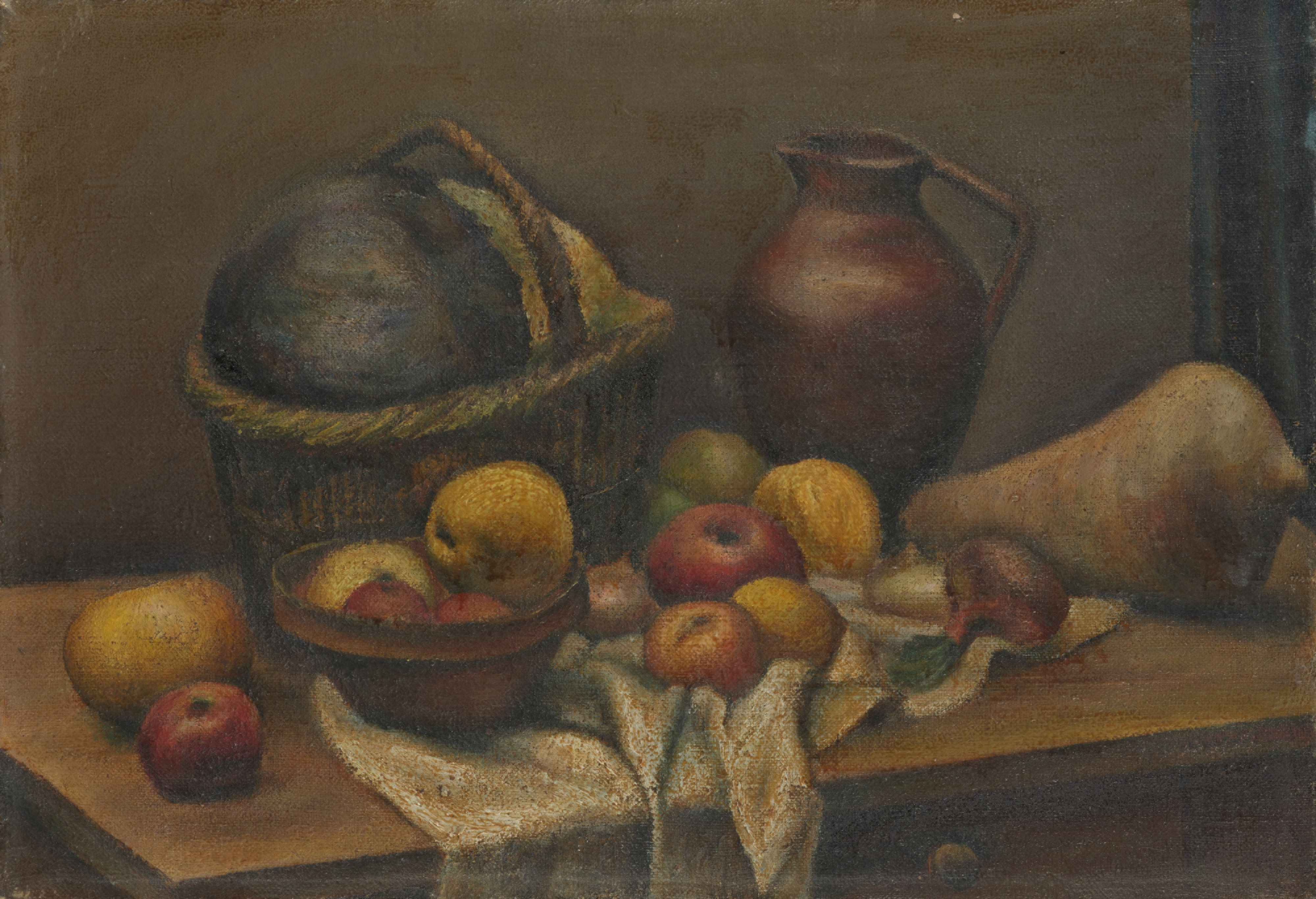 Józef Jarema w latach 1918–1924 uczył się w krakowskiej Akademii Sztuk Pięknych pod kierunkiem Stanisława Dębickiego, Jacka Malczewskiego, Ignacego Pieńkowskiego, Władysława Jarockiego i Józefa Pankiewicza. Był związany z kapistami. Początkowo organizował zbiórki pieniędzy dla studentów, aby mogli wyjeżdżać do Paryża, a następnie sam tam pojechał w 1924 roku. Do Polski wrócił w 1931 roku. Rok później rozpoczął działalność jako animator w teatrze Cricot, z którym także była związana jego młodsza siostra, malarka Maria Jarema. W czasie wojny brał udział w bitwie pod Monet Cassino. Józef Czapski pomógł Jaremie dołączyć do działu plastycznego, który funkcjonował w szeregach armii. Był współorganizatorem pierwszej wystawy malarzy-żołnierzy w Bagdadzie, później w Tel-Avivie i Rzymie. Po wojnie osiadł we Włoszech. W 1945 roku wraz z dawnym futurystą Enrico Prampolinim utworzył w Rzymie międzynarodowy „Art Club”, który łączył przedstawicieli różnych kierunków awangardy. W 1950 zamieszkał w Nicei. Obraz znajdujący się w kolekcji Muzeum Narodowego w Szczecinie pochodzi z 1923 roku, czyli z okresu poprzedzającego wyjazd artysty do Paryża. Jest to martwa natura z koszem z owocami namalowana w sposób realistyczny. Kompozycja została ujęta na neutralnym brunatno-szarym tle. W przedstawieniu widoczne są początki zainteresowania kolorem stanowiącym dominantę dzieła. Jarema koncentrował się wówczas na efektach harmonii możliwej do uzyskania z połączeń kolorystycznych. Uwydatniał jakość malarskiej materii. Nie bez znaczenia były dla niego również zmagania z płaszczyzną płótna.