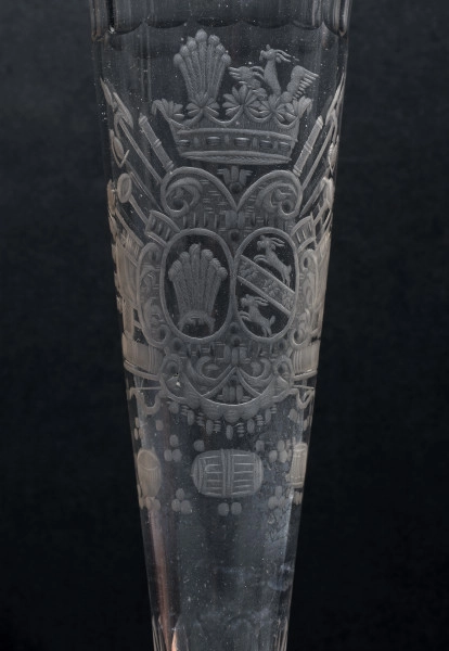 Puchar na niskim tralkowanym i fasetowanym trzonie, o bardzo wysokiej i smukłej czaszy. Jego główną dekorację stanowią herby Mniszech i Szembek umieszczone w kartuszu pod koroną szlachecką, otoczone panopliami. Najprawdopodobniej herby należały do Jerzego Augusta Wandalina Mniszcha (1715-1778) i jego pierwszej żony Bihildy z Szembeków (ok.1723-1747). Najprawdopodobniej kielich znalazł się w kolekcji wilanowskiej dzięki Aleksandrze Potockiej, żonie Augusta Potockiego i pochodził ze zbiorów jej ojca Stanisława Septyma Potockiego. W jego kolekcji znajdowały się także inne szkła z herbem Mniszchów (matką Stanisława Septyma była Amalia z Mniszchów, córka Jerzego Augusta Wandalina z pierwszego małżeństwa).